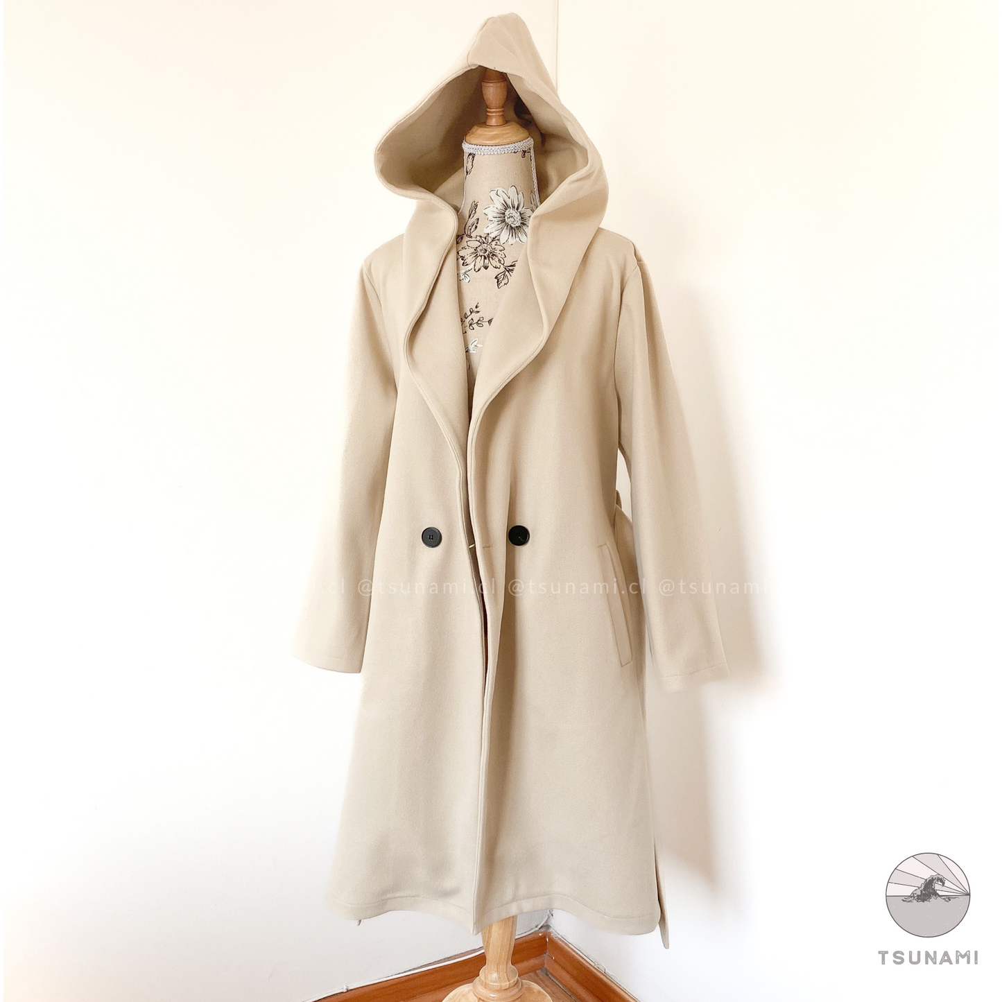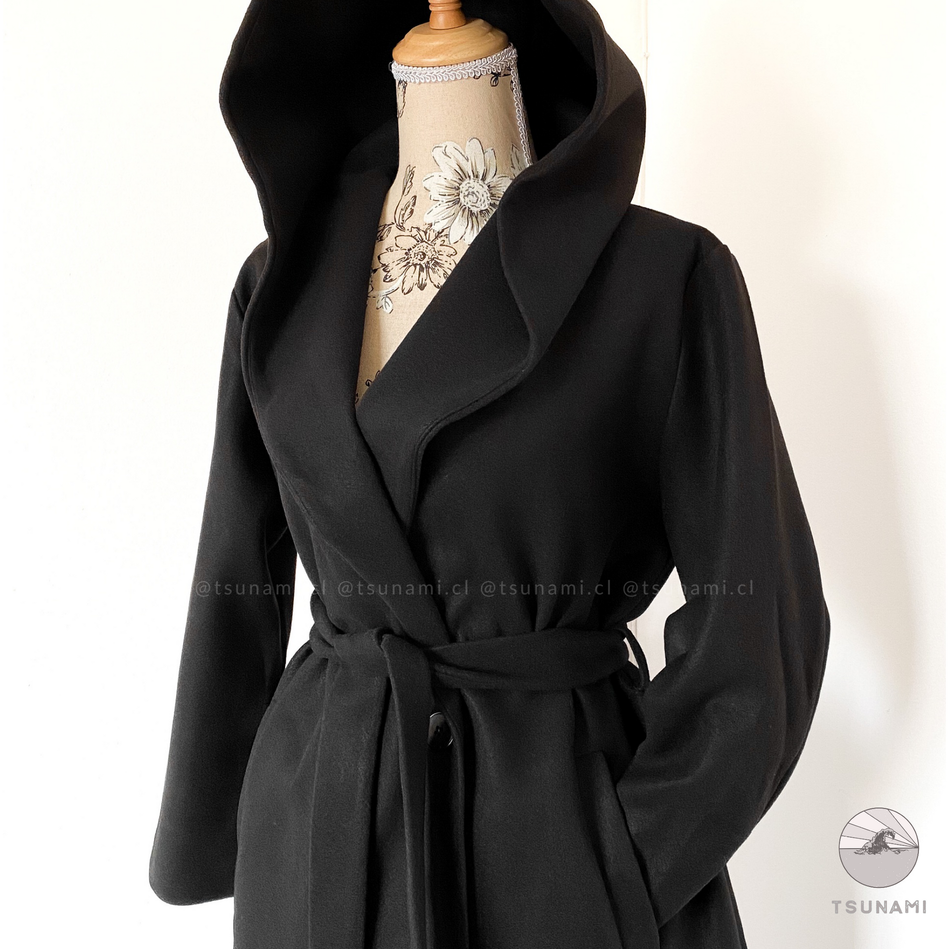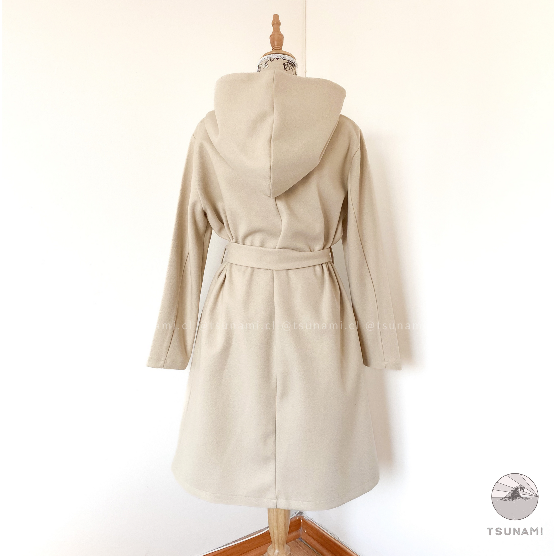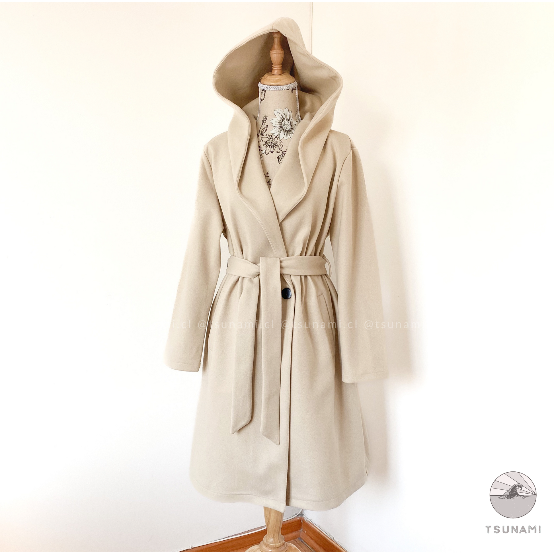Abrigo largo de paño con forro interior satinado, bolsillos laterales funcionales, cierre frontal cruzado con botones y cinturón desmontable en color a tono, y gorro incluido.