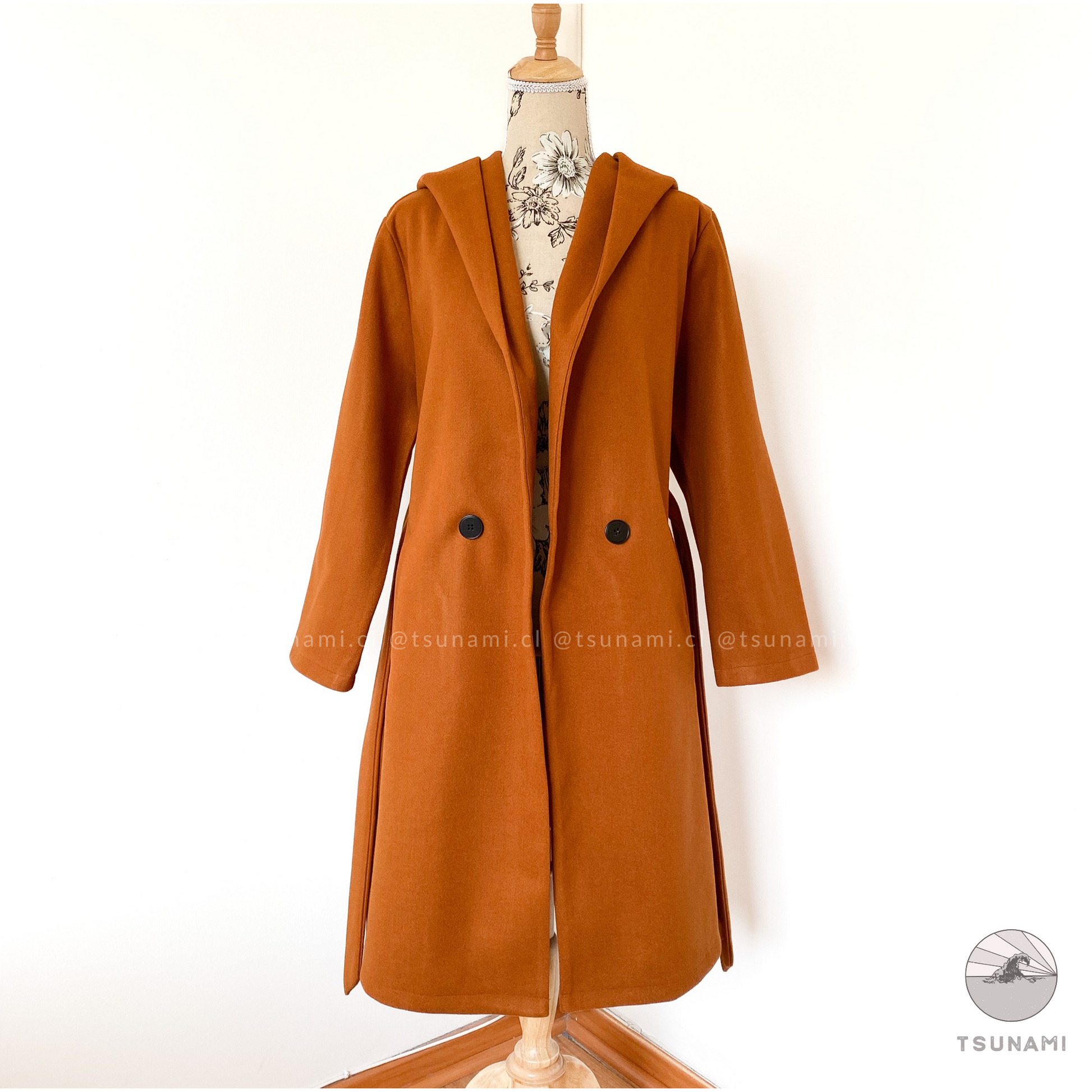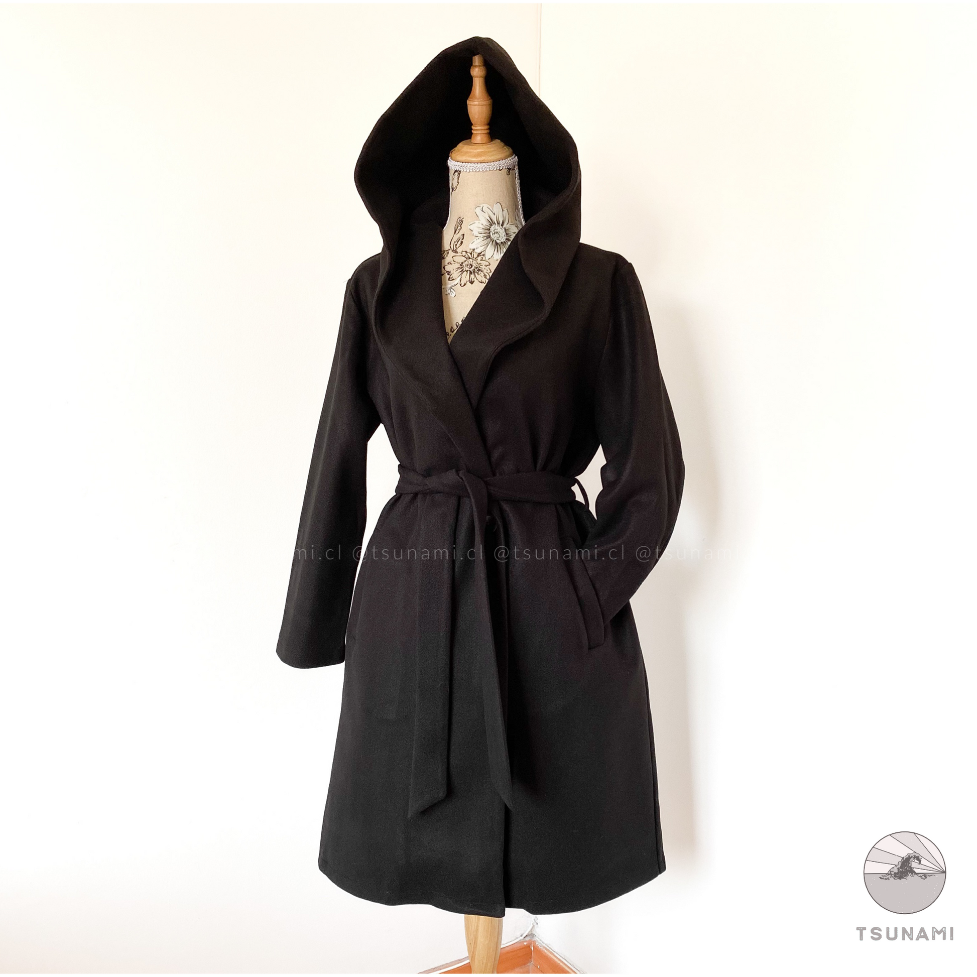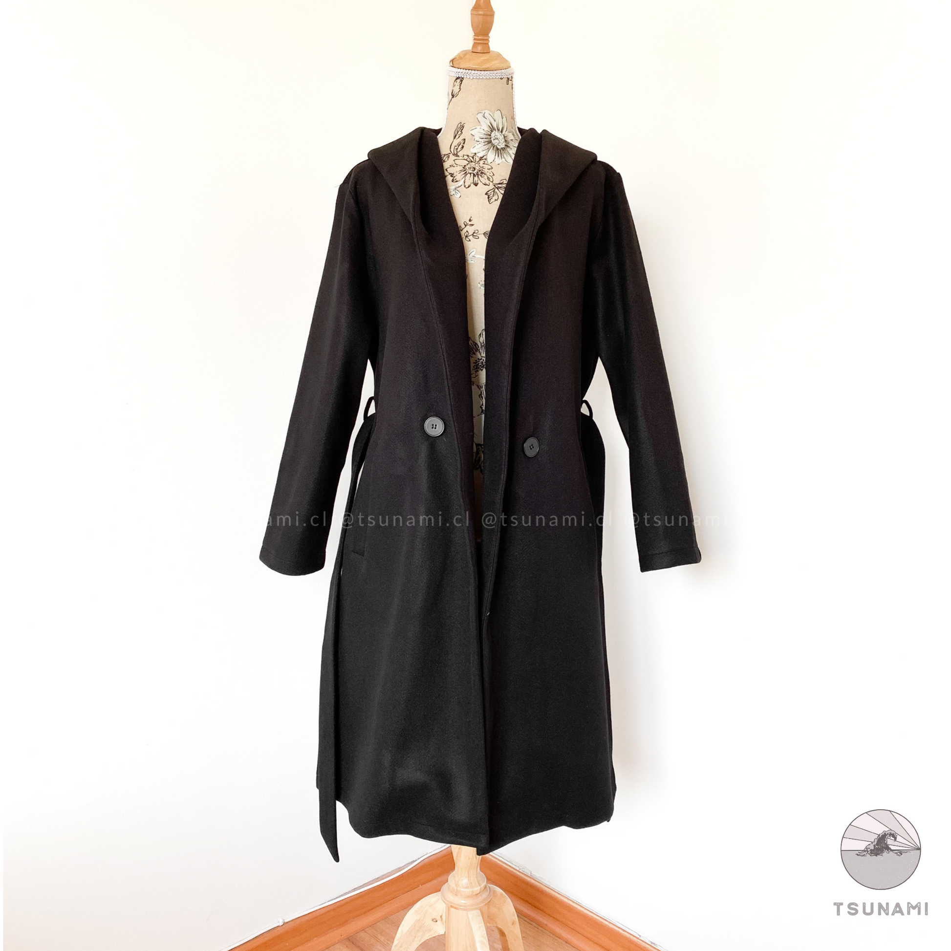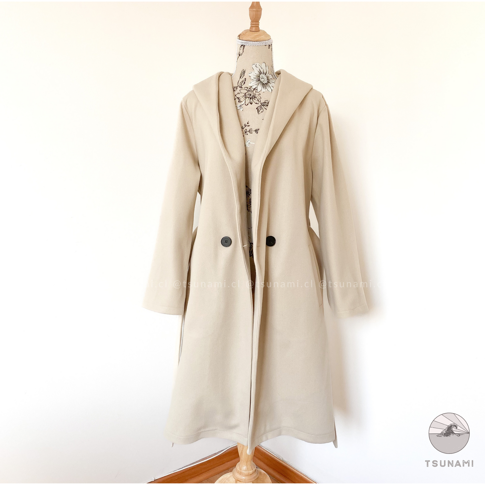 Abrigo largo de paño con forro interior satinado, bolsillos laterales funcionales, cierre frontal cruzado con botones y cinturón desmontable en color a tono, y gorro incluido.