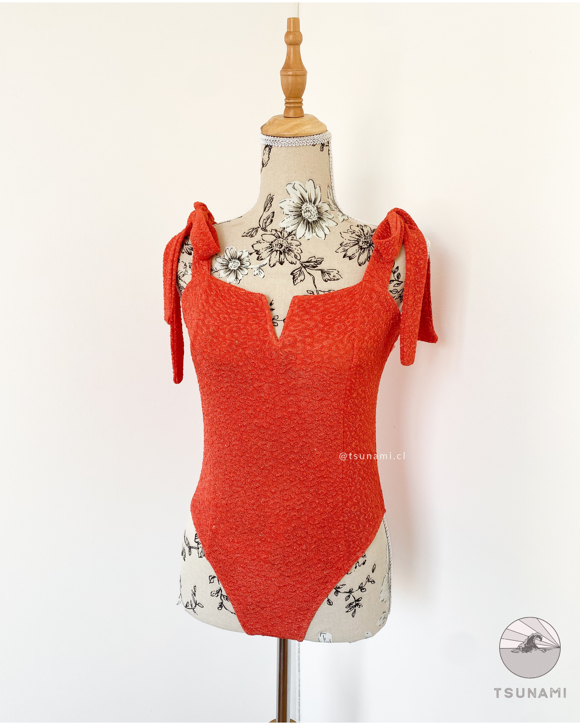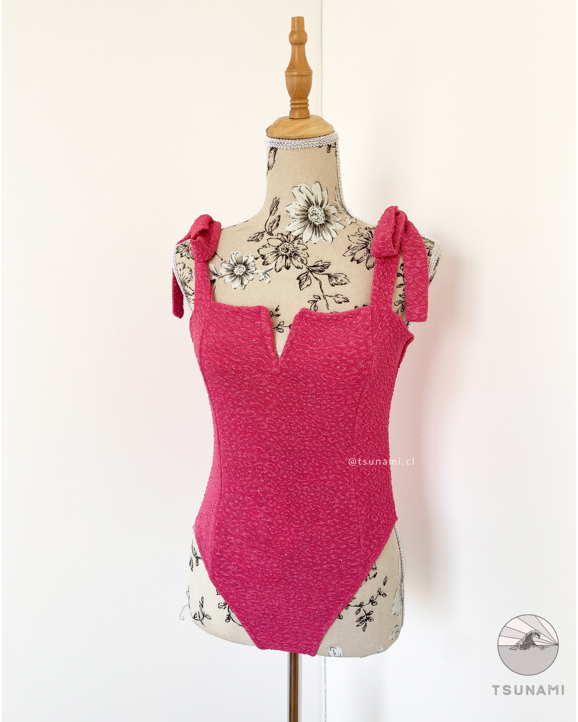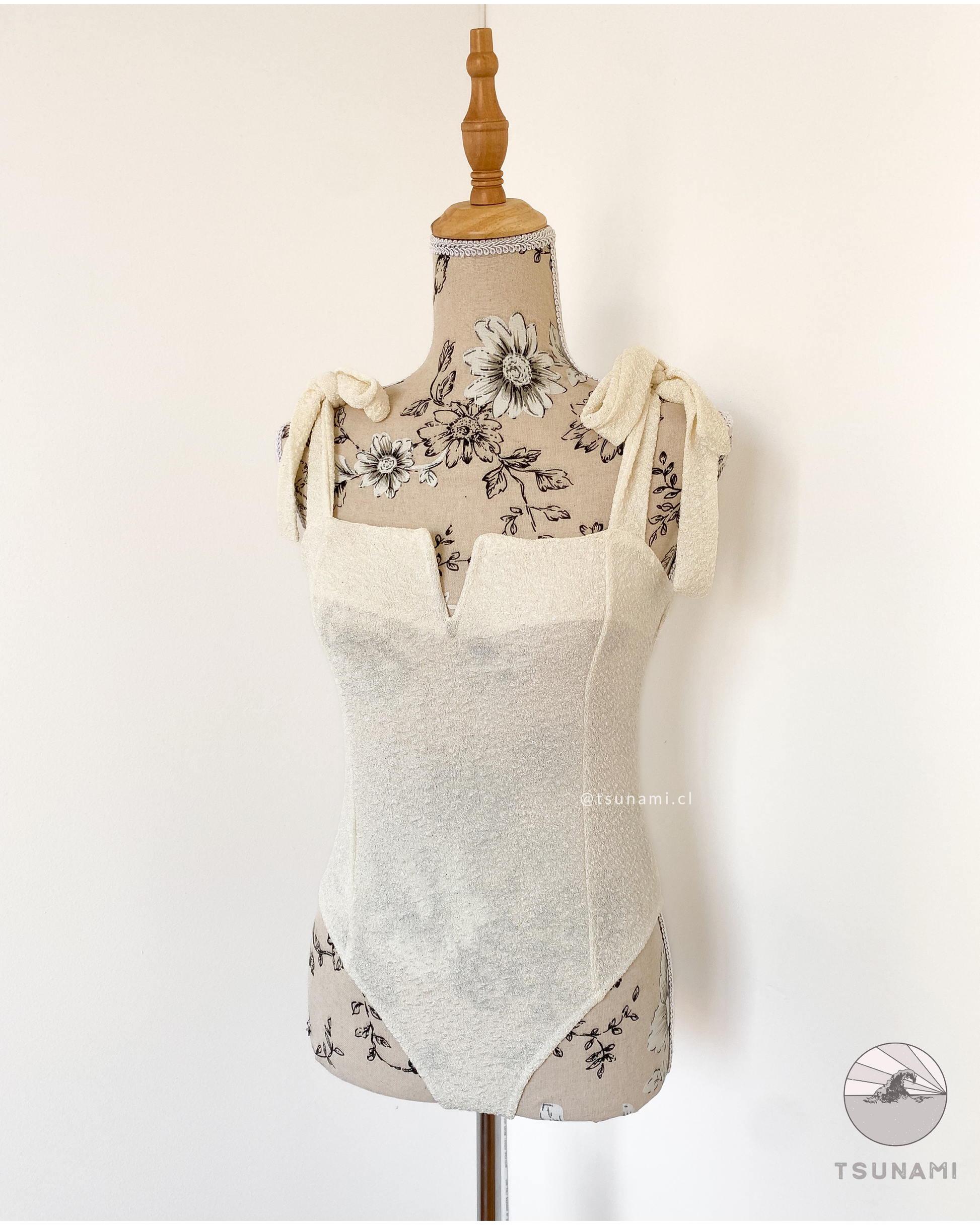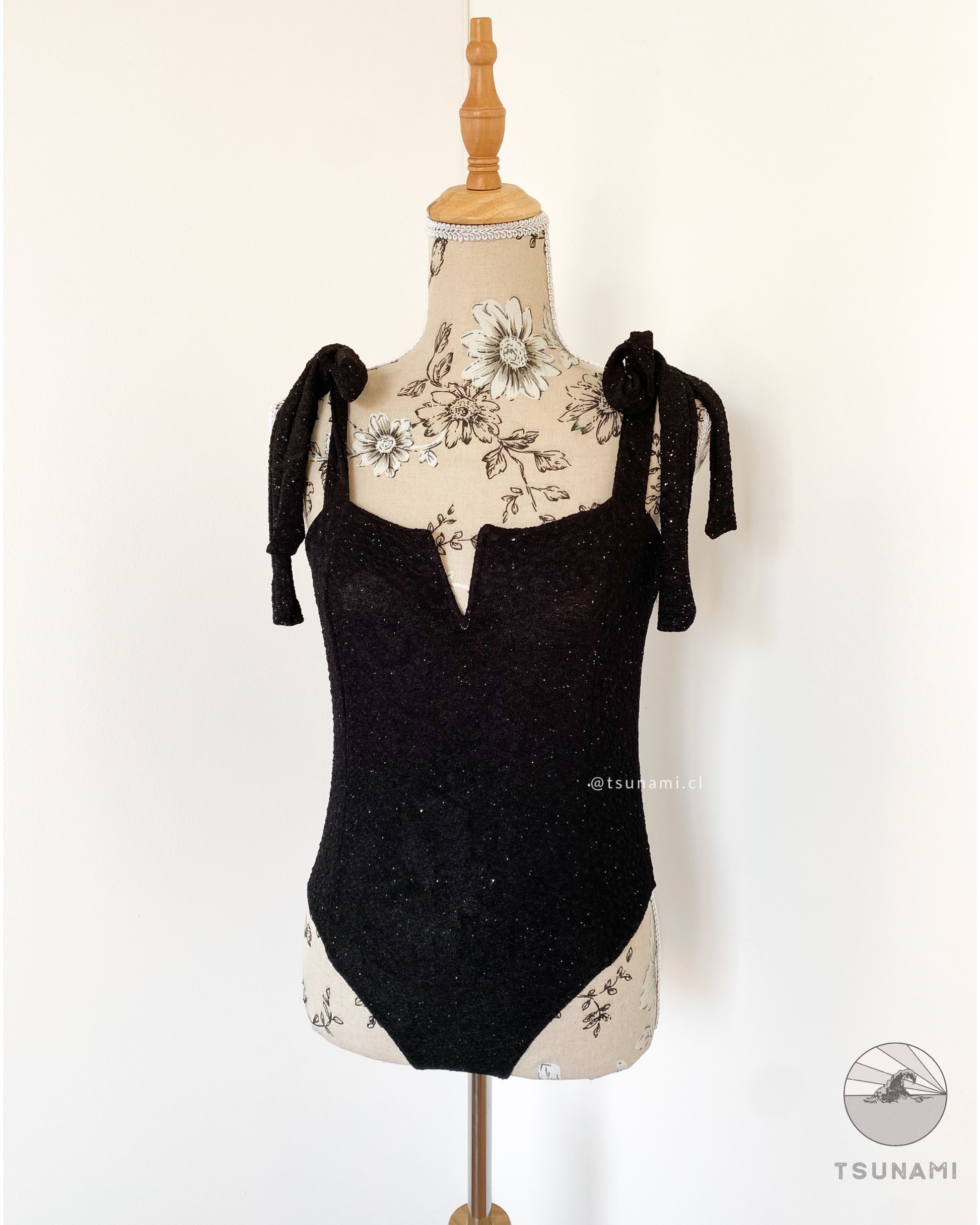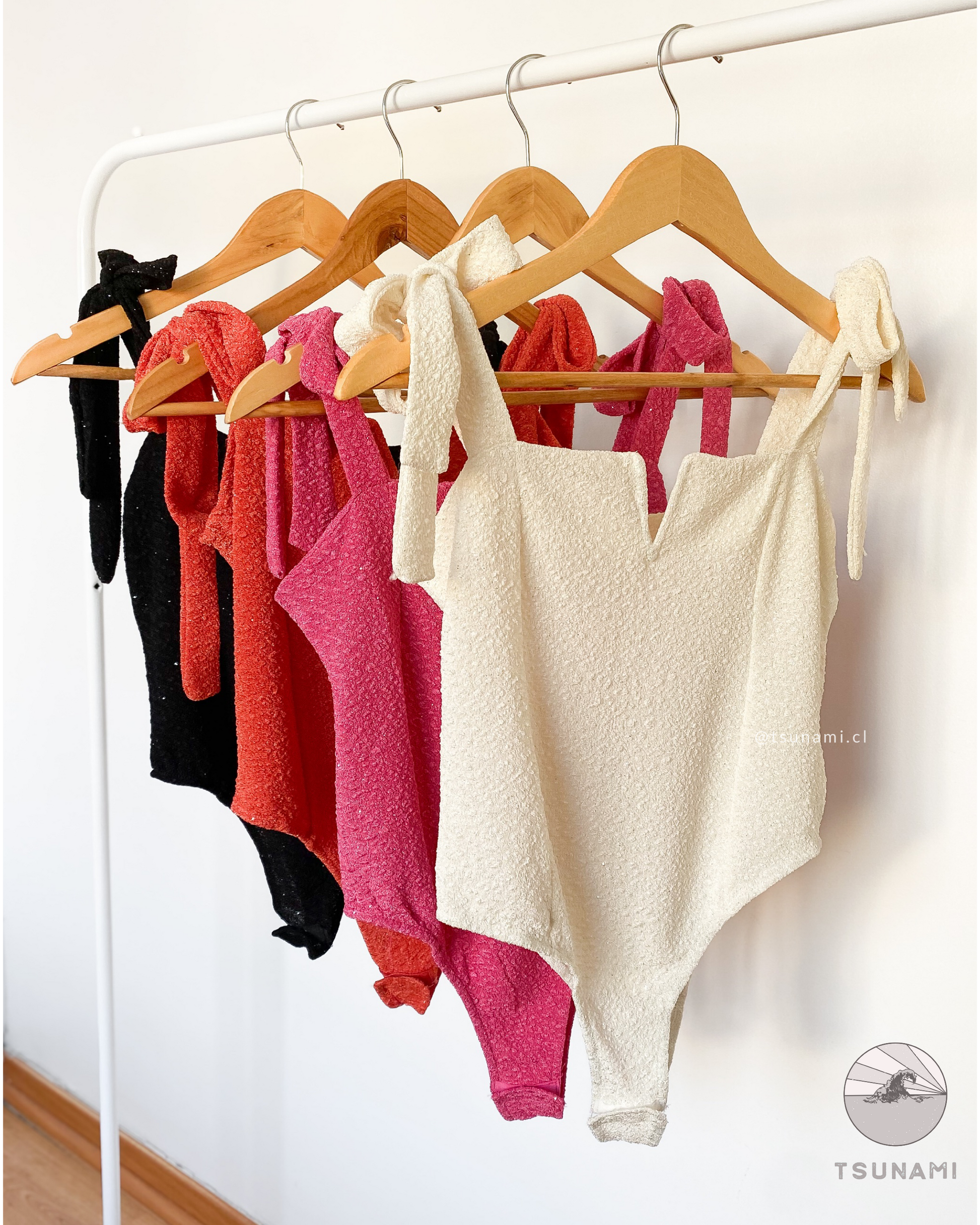 Body de tela brillante y elasticada de grosor medio. Las tiritas en los hombros se amarran al gusto para ajustar según se necesite. Sistema de broches para mayor comodidad.