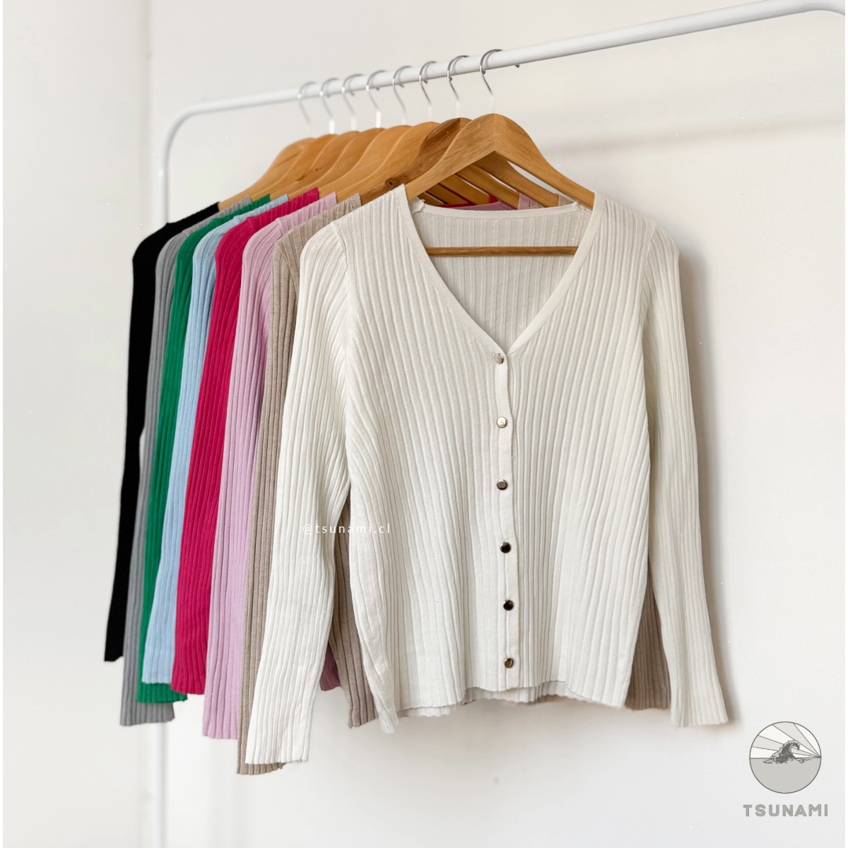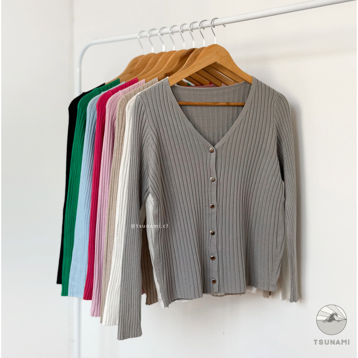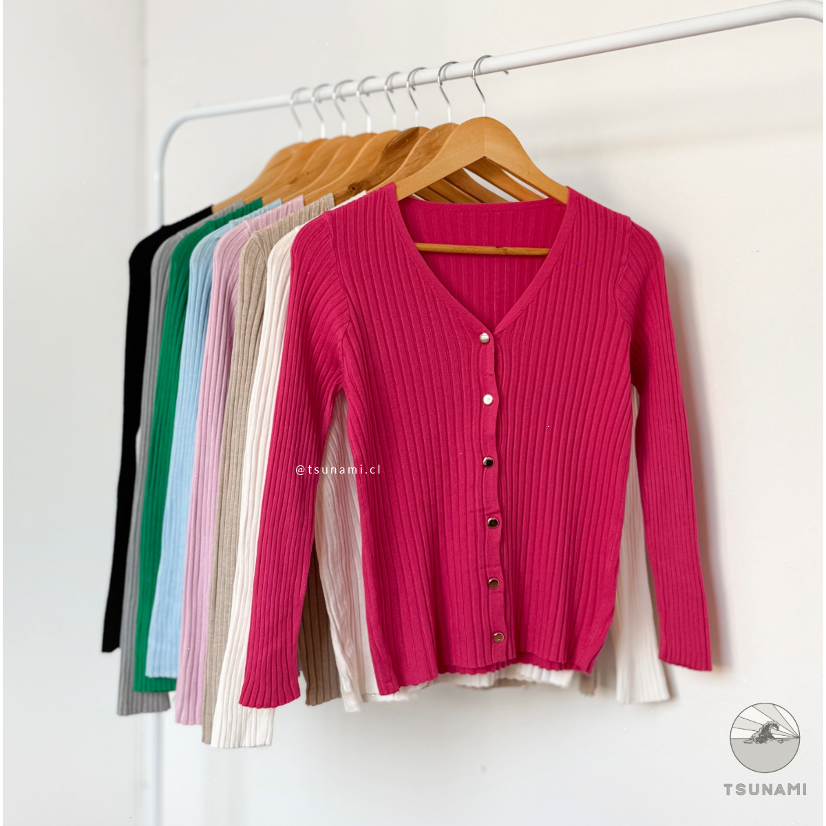 Está hecho de un tejido acanalado elasticado que se adapta suavecito al cuerpo, brindando esa sensación de abrigo liviano que tanto se agradece en otoño 🍂. Sus botones funcionales al frente permiten usarlo cerrado como top o abierto sobre una polera, dándote mil formas de combinarlo sin esfuerzo!!