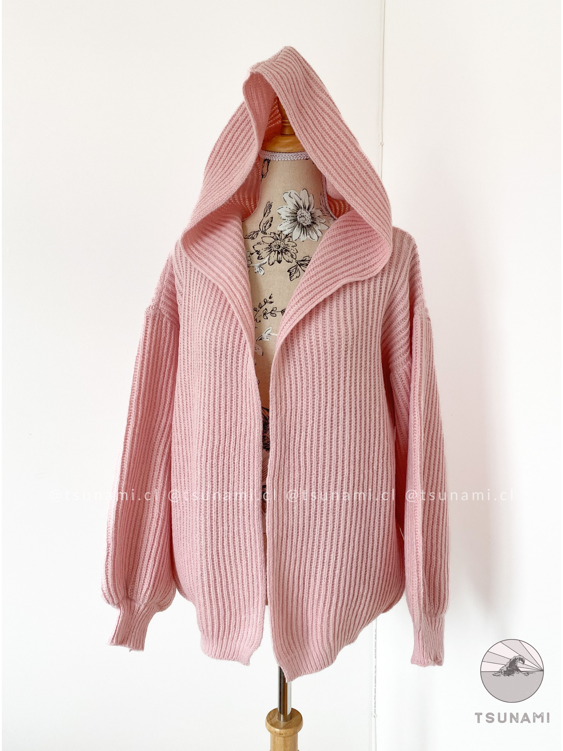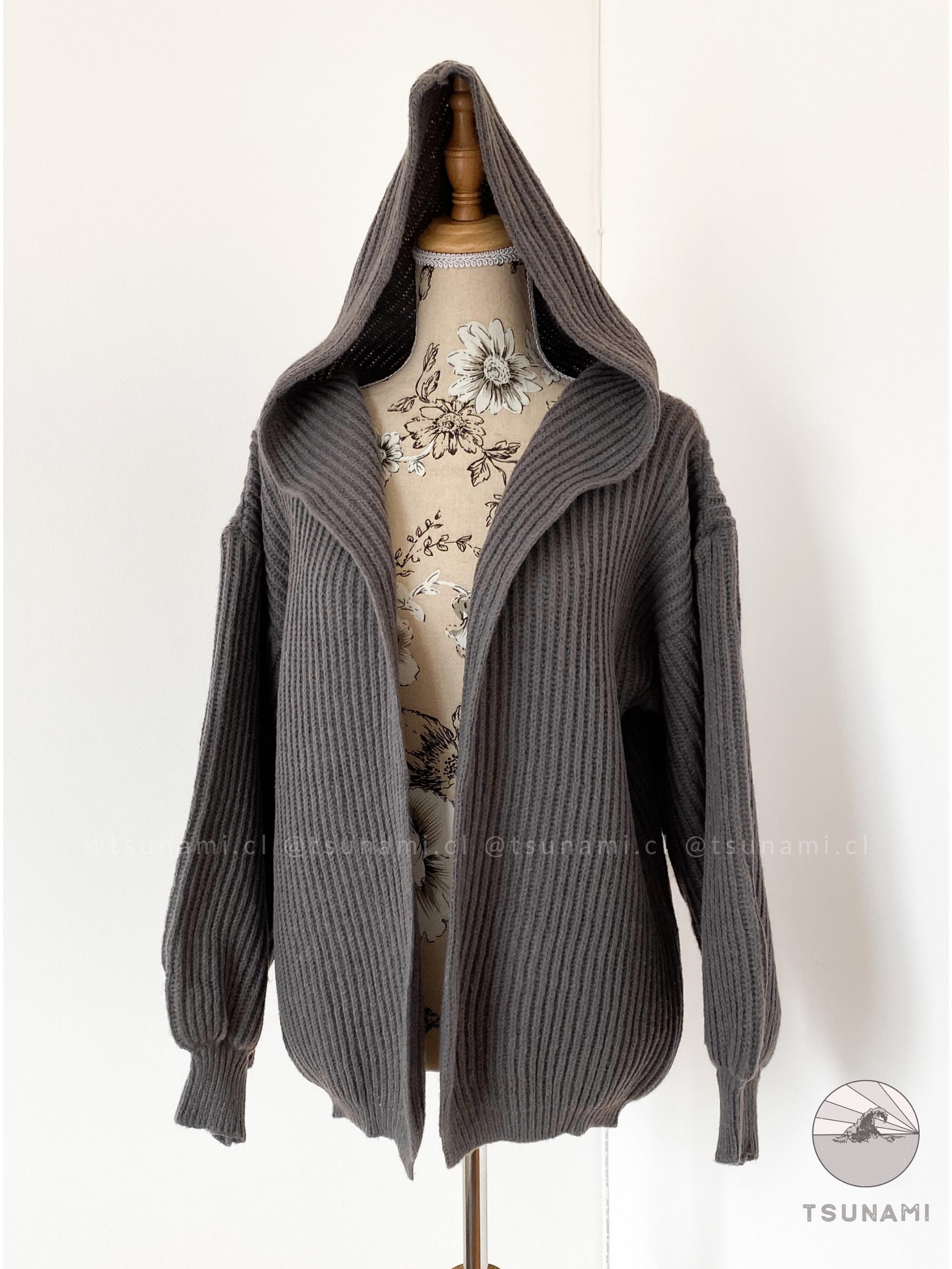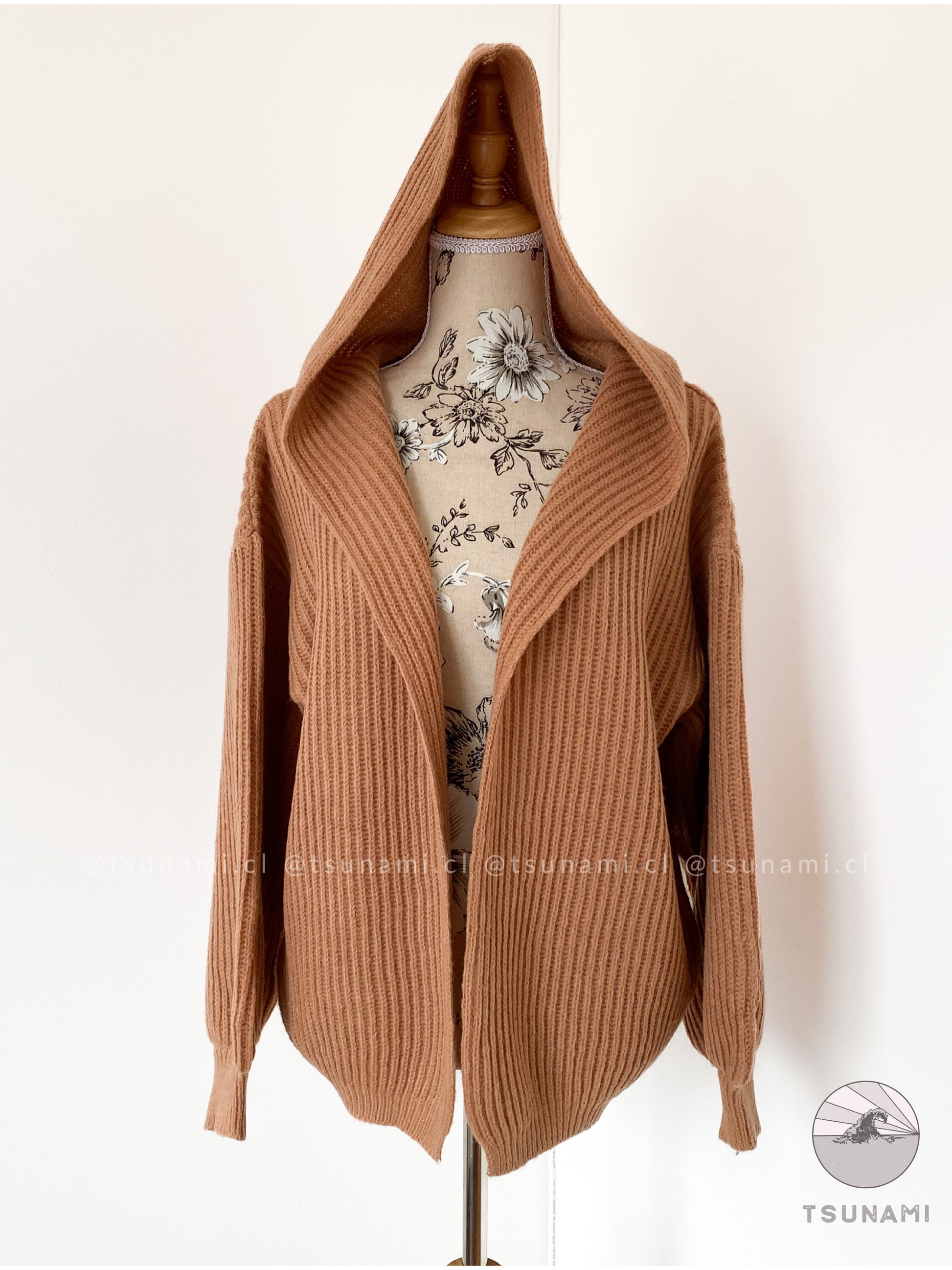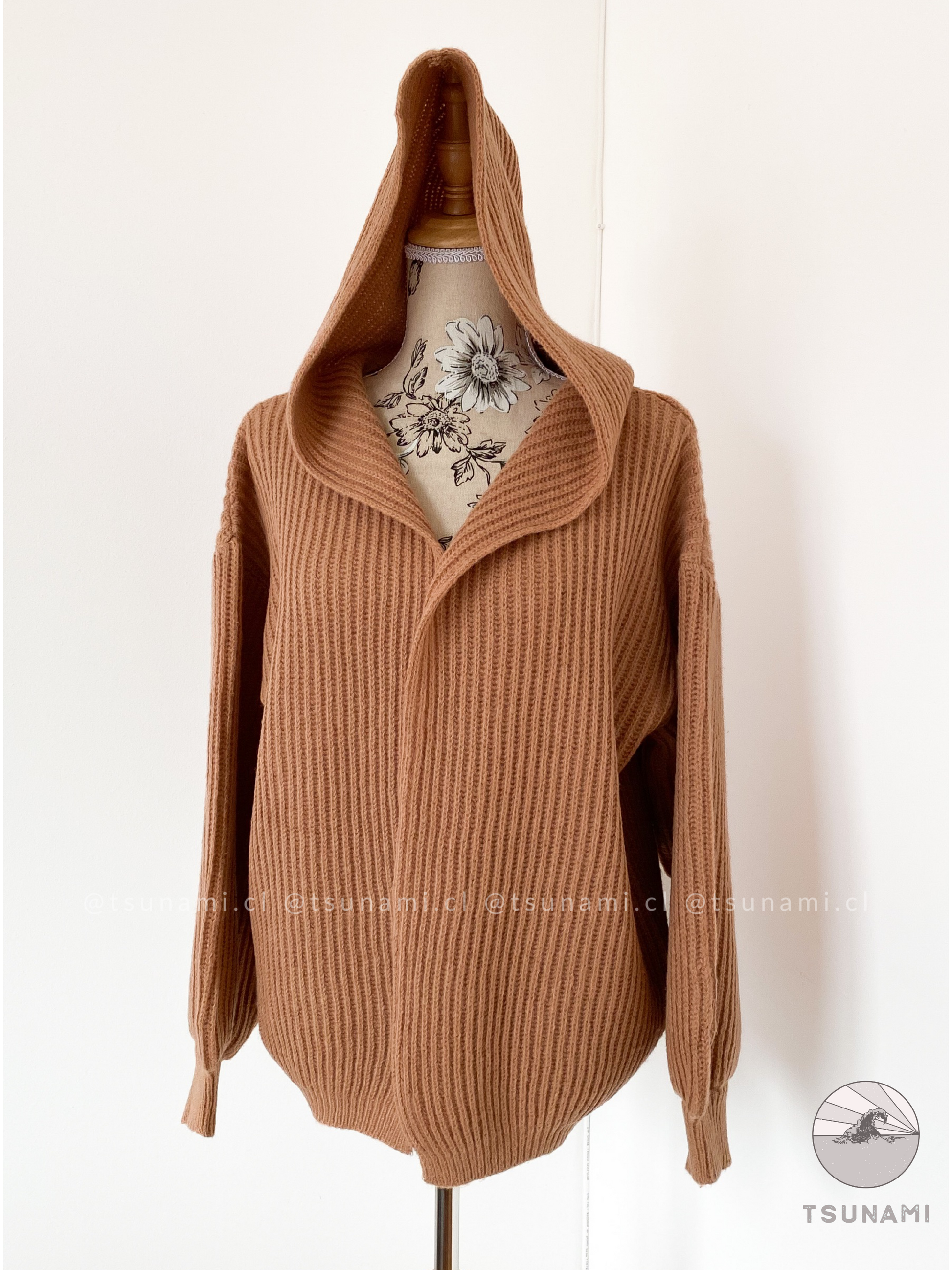 Cardigan de largo medio, abierto, con gorro. Es de lana, grueso, suavecito y muy calientito.