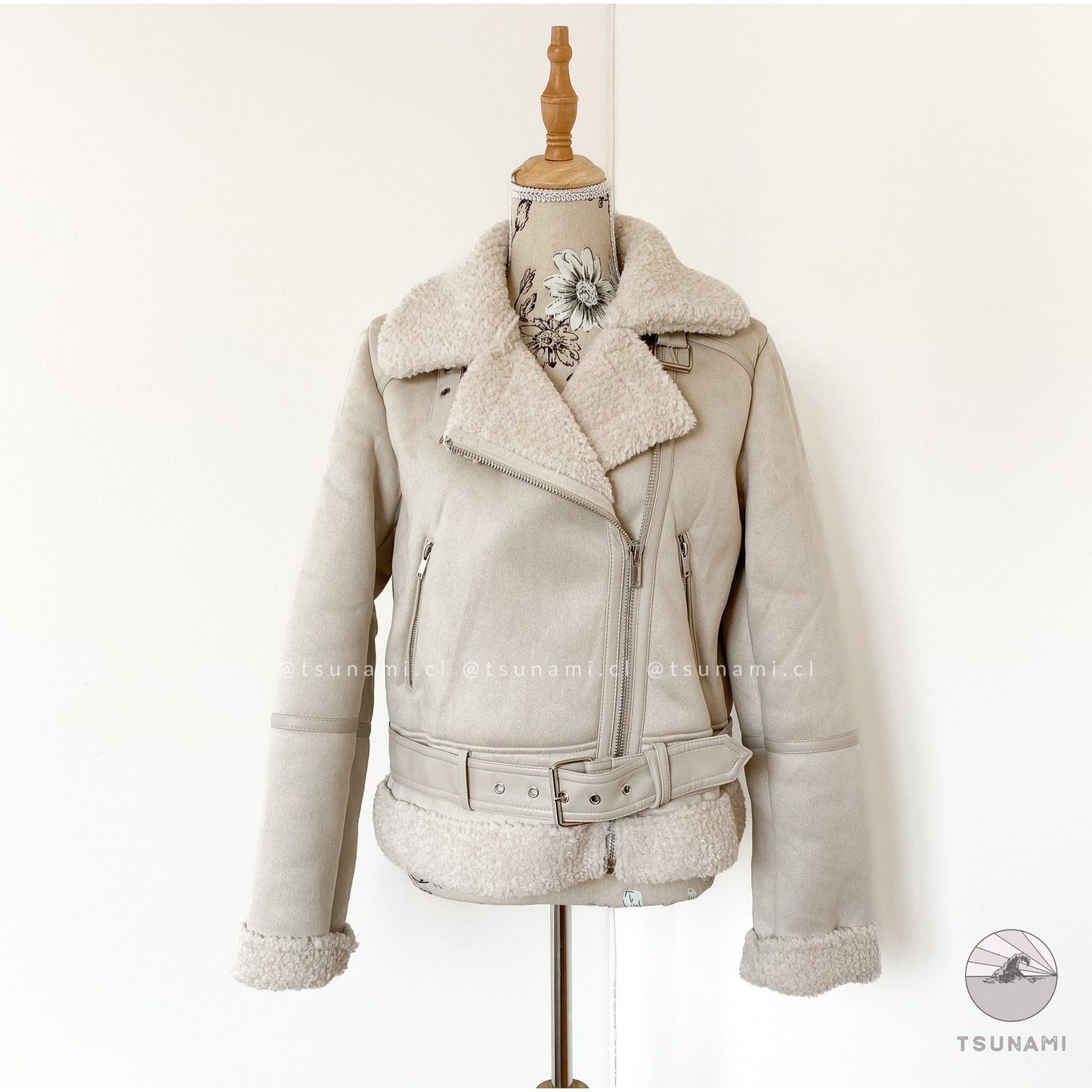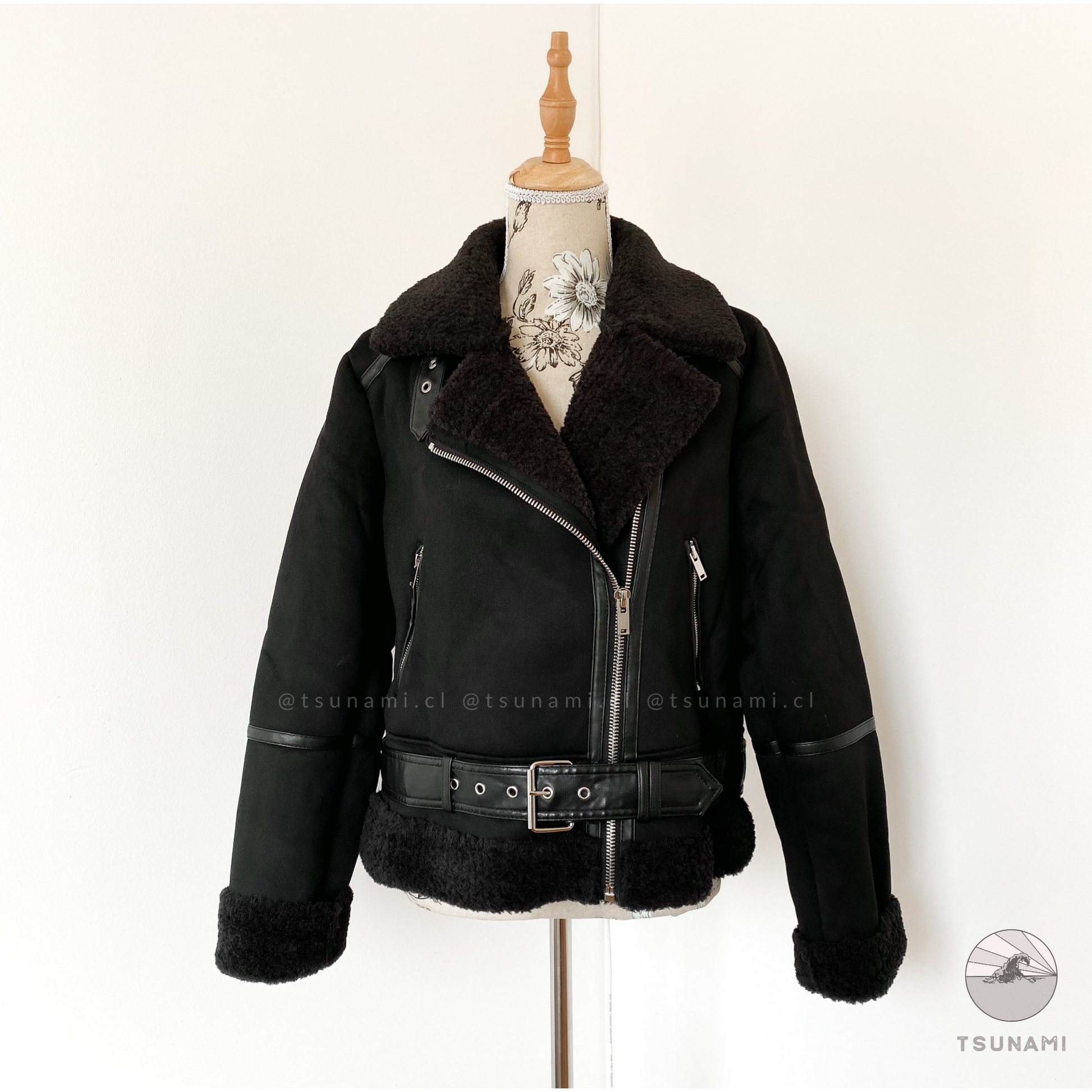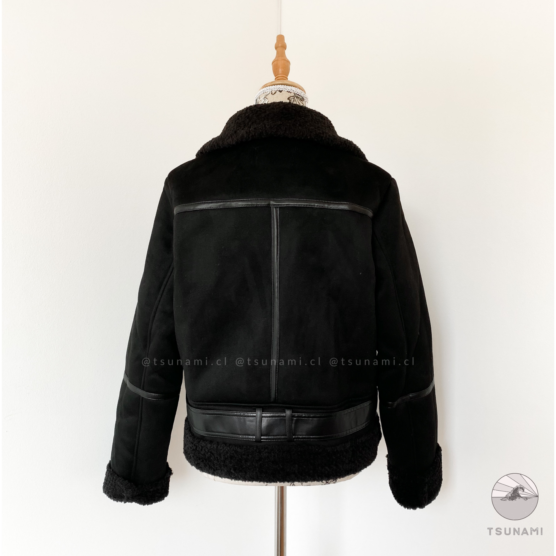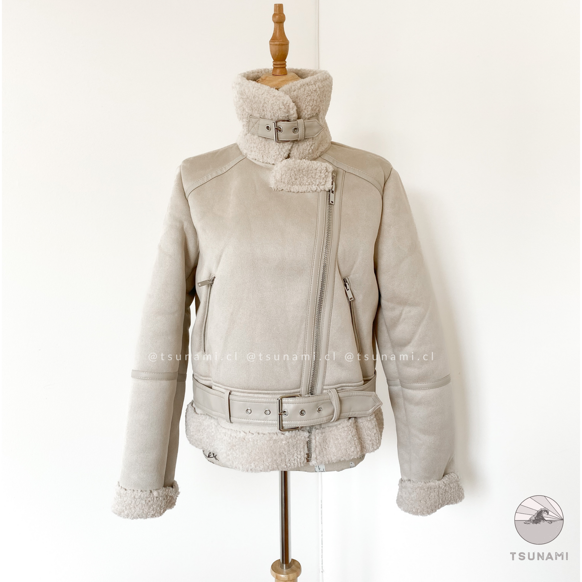 Aviadora de gamuza en exterior, con forro interior de chiporro en toda la chaqueta, cinturón ajustable en contorno inferior, bolsillos laterales con cierre funcional.