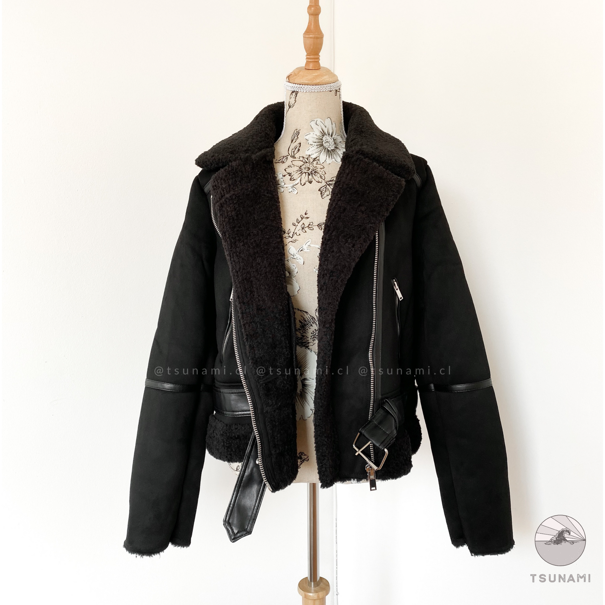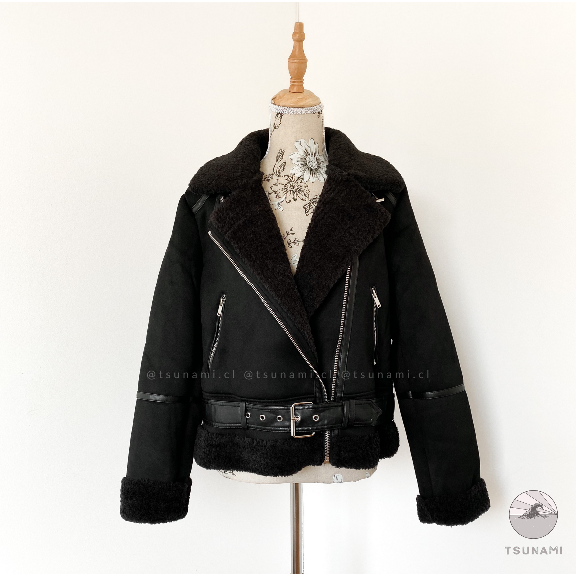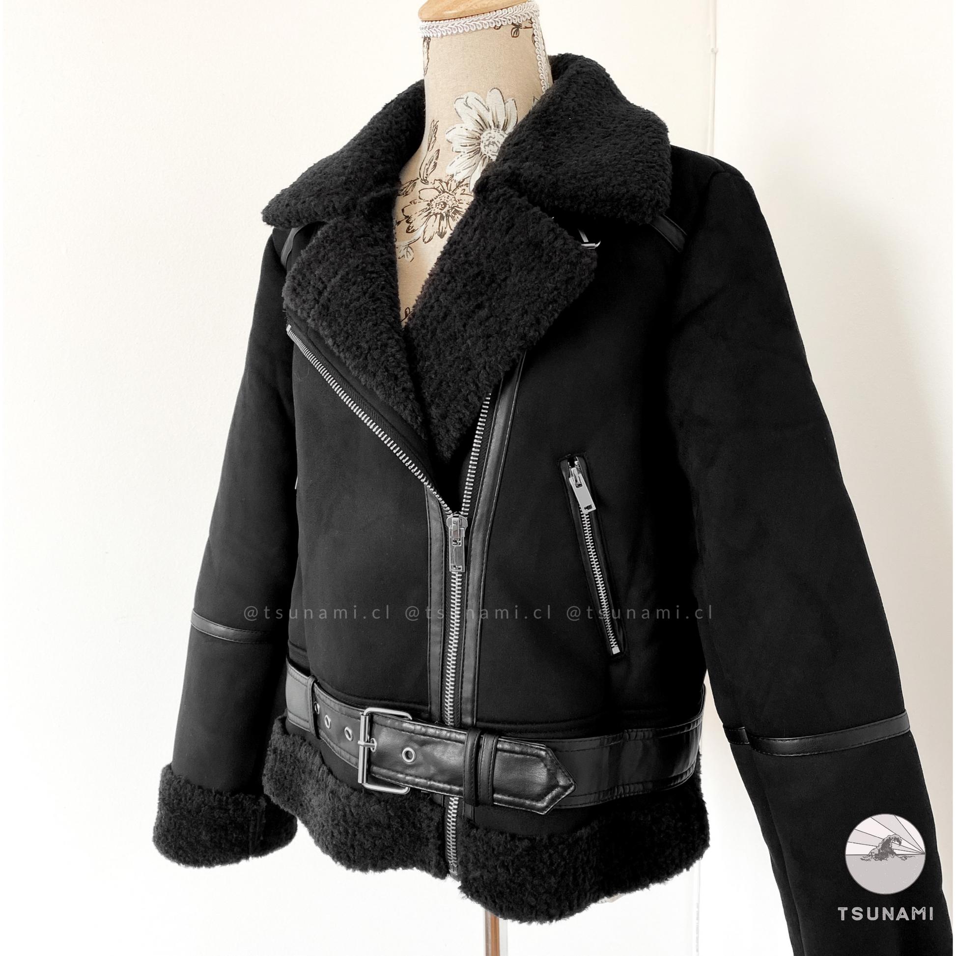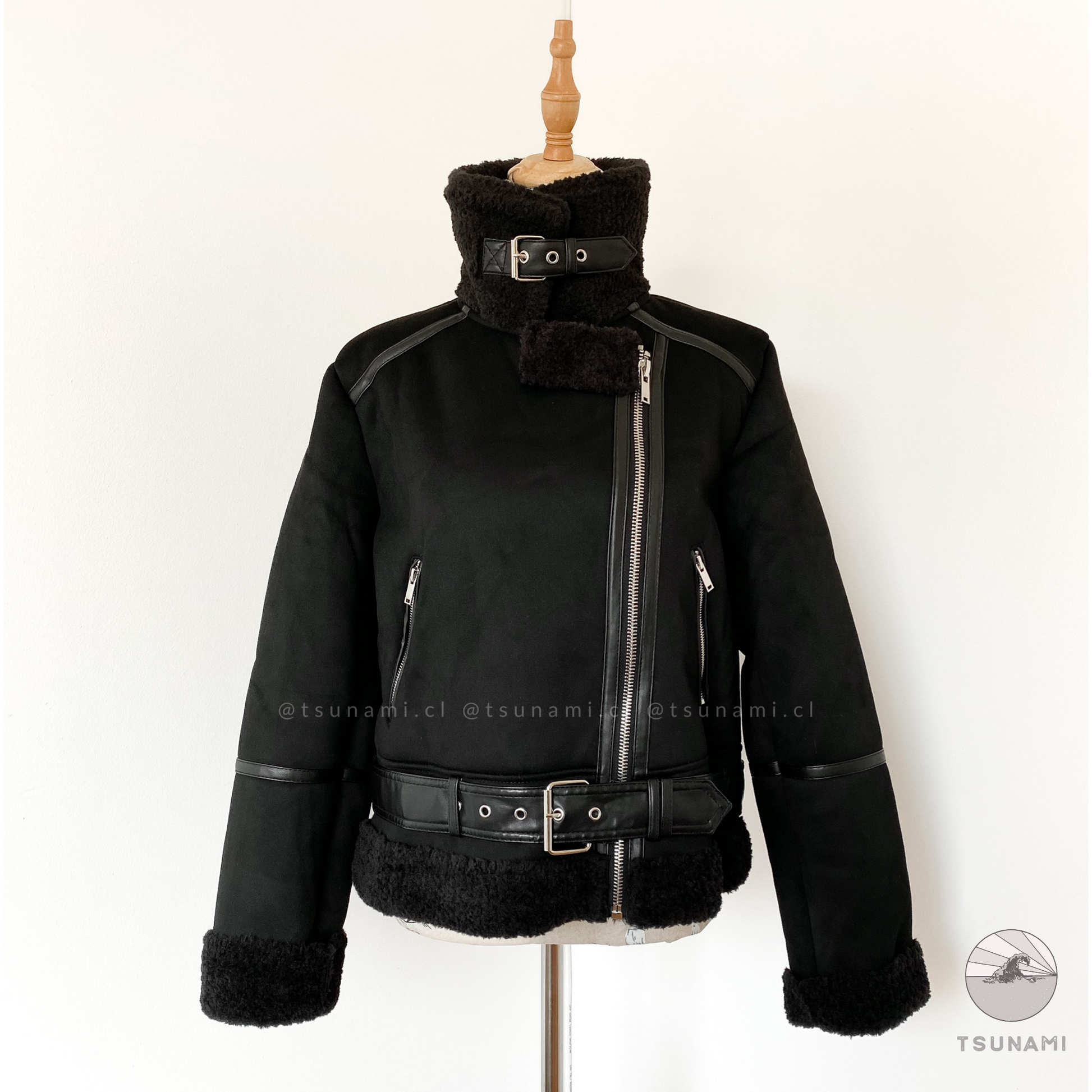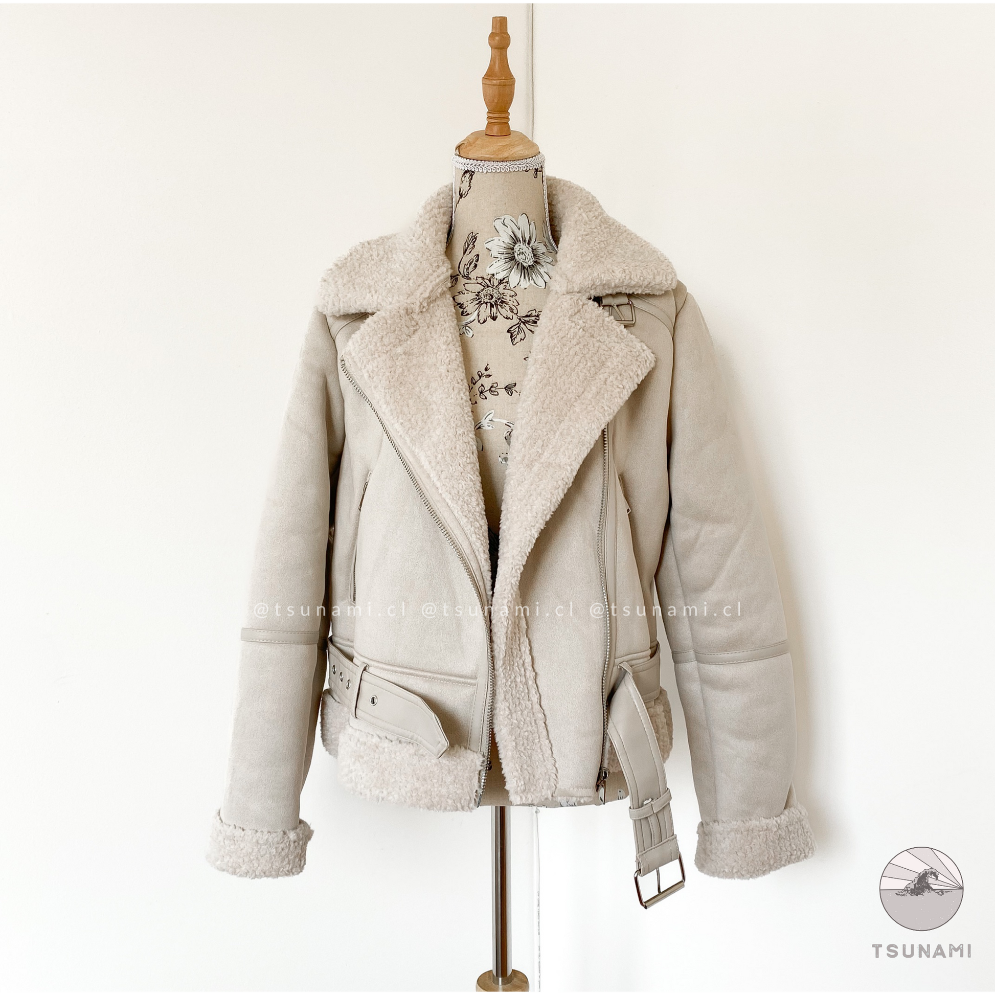 Aviadora de gamuza en exterior, con forro interior de chiporro en toda la chaqueta, cinturón ajustable en contorno inferior, bolsillos laterales con cierre funcional.