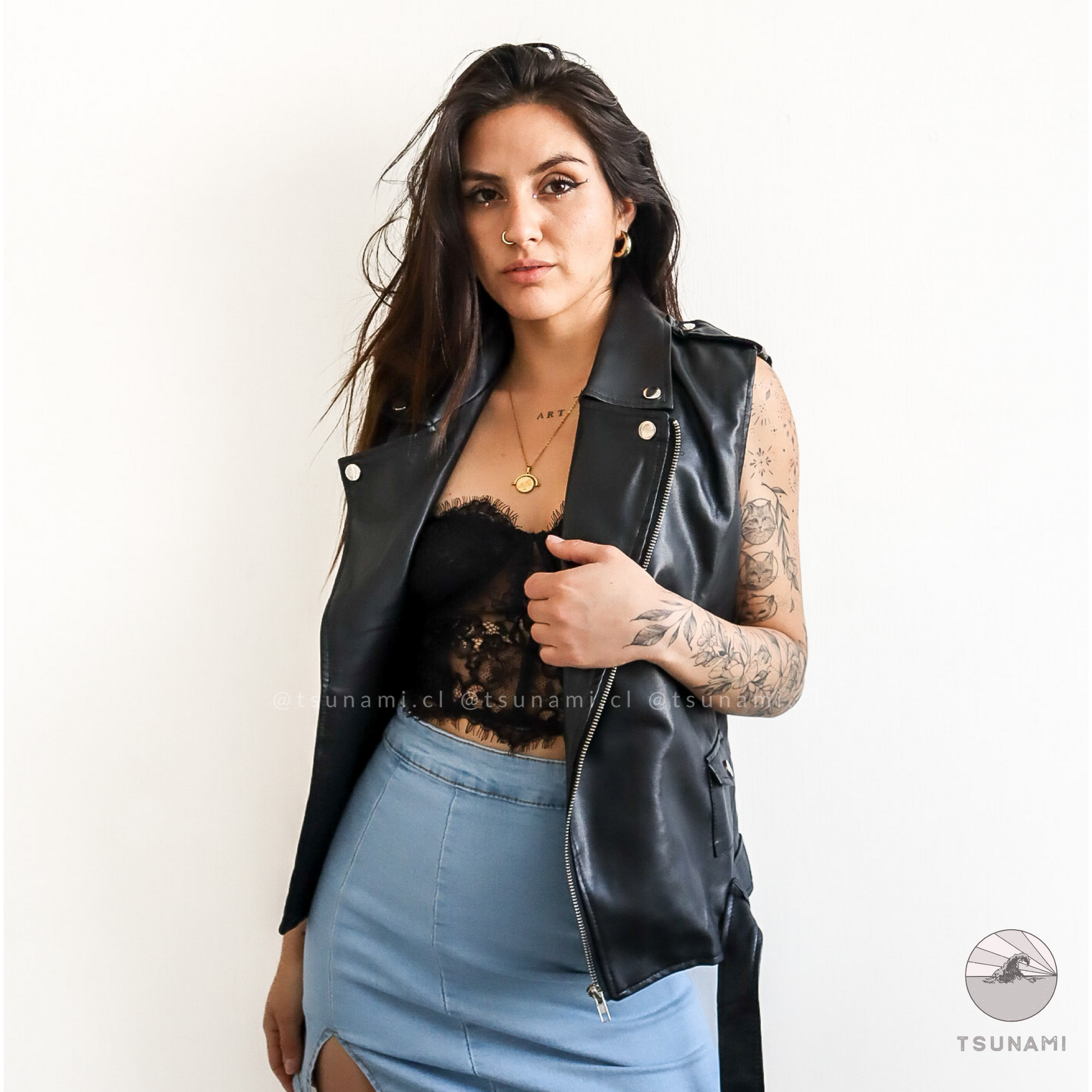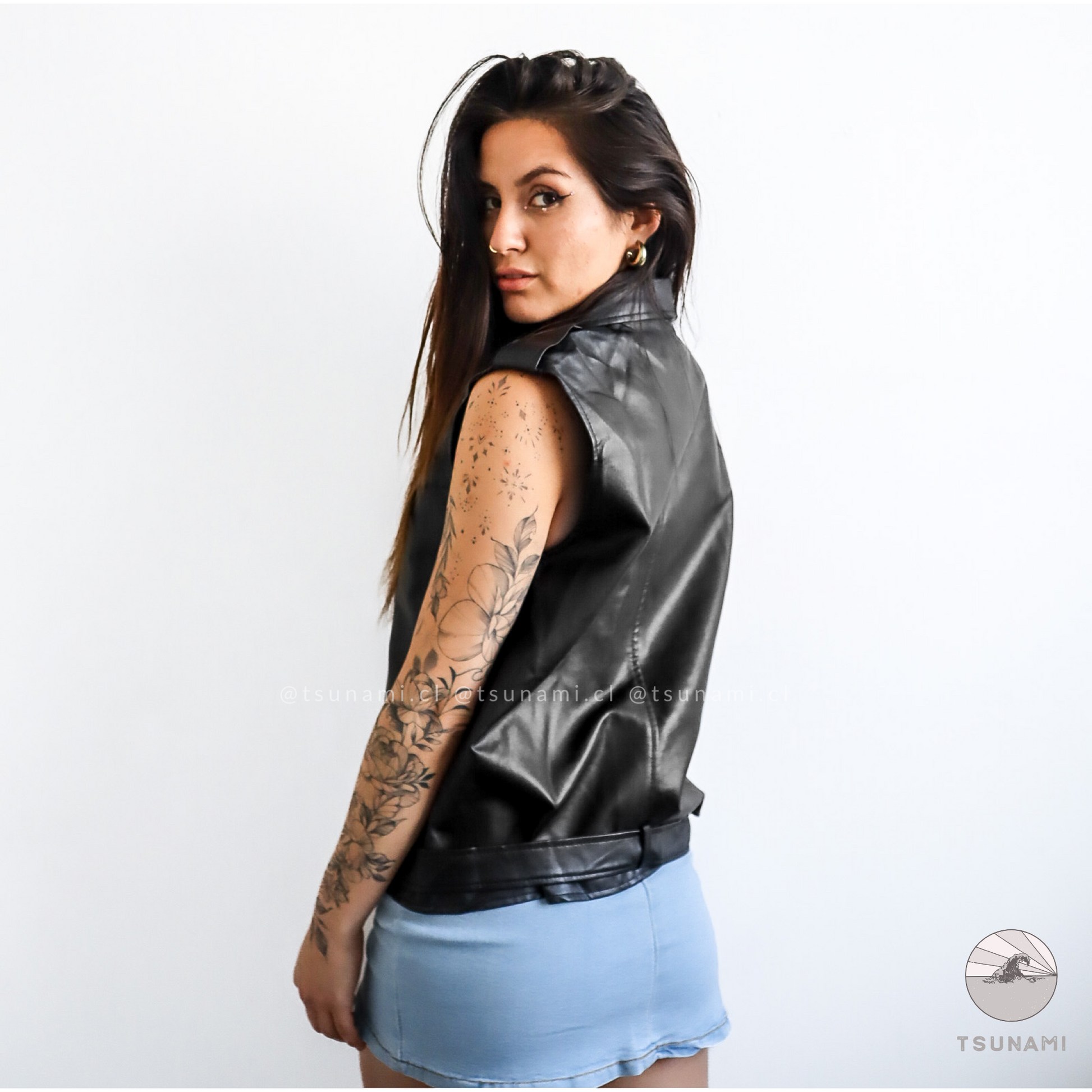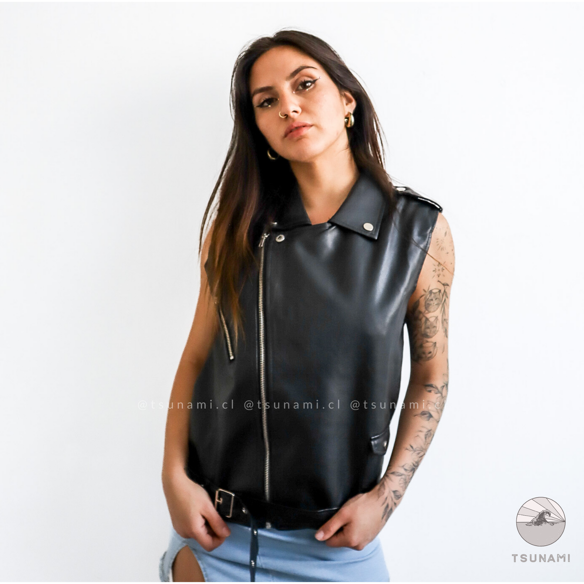Chaqueta de ecocuero, con cierre delantero y cinturón. Talla estándar S/M/L.