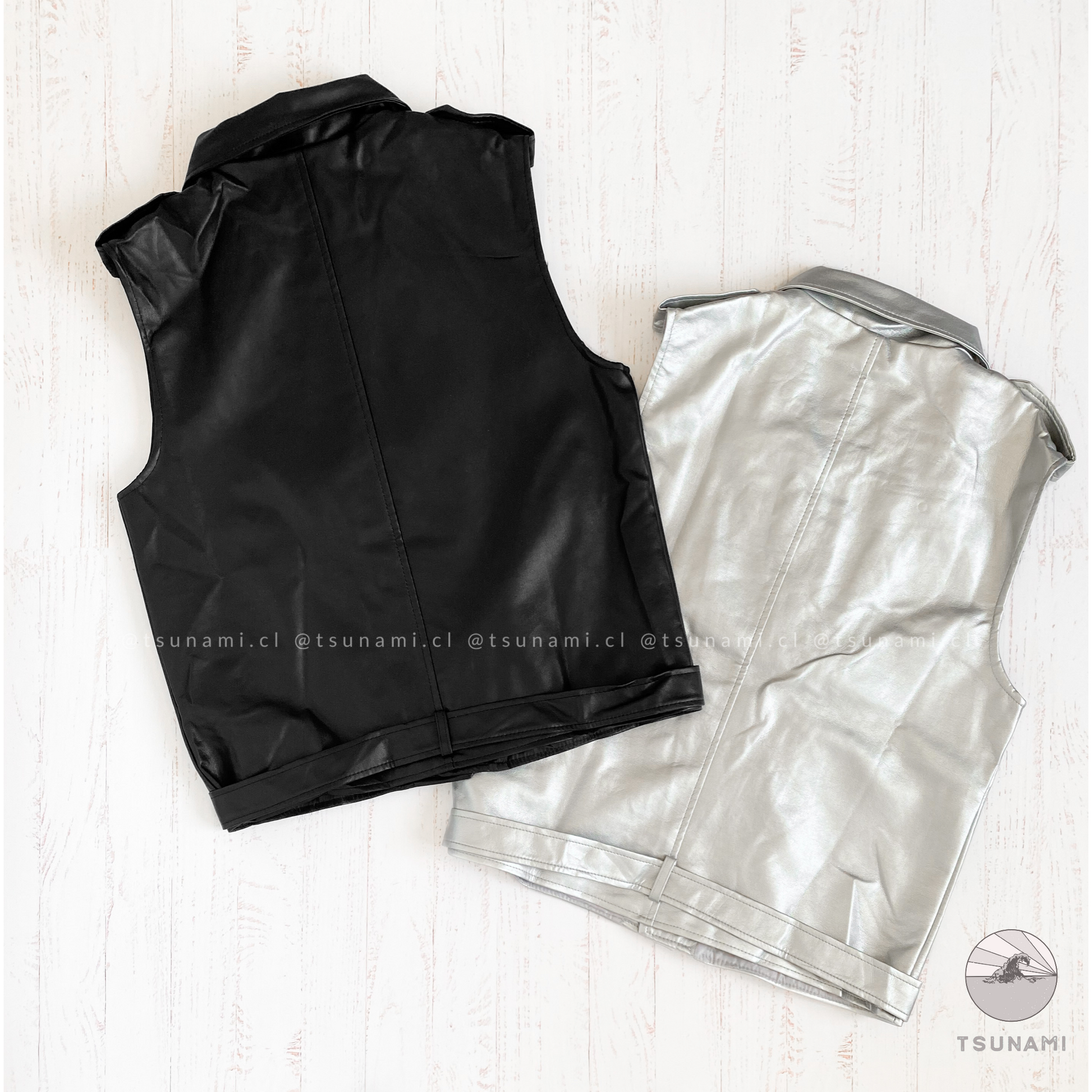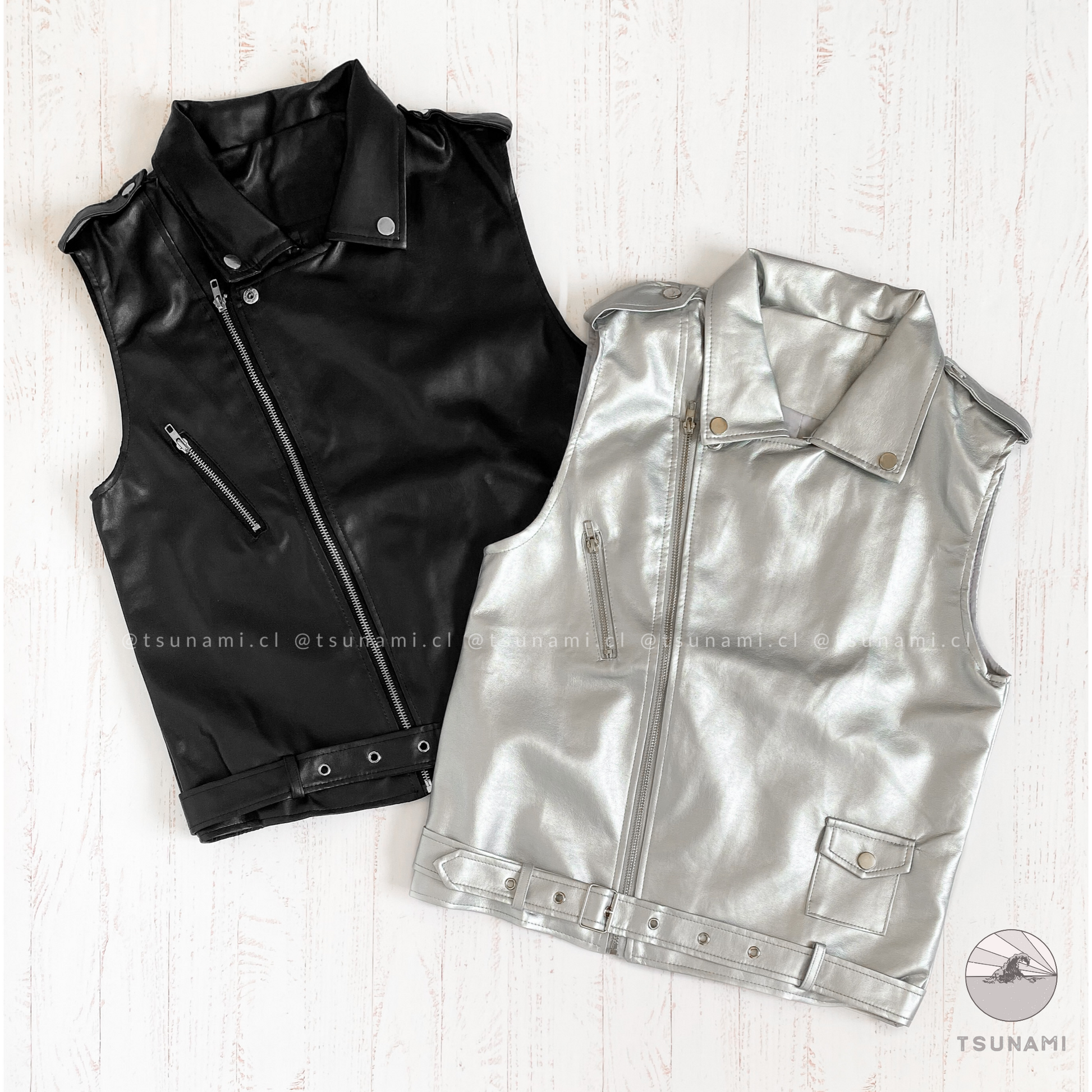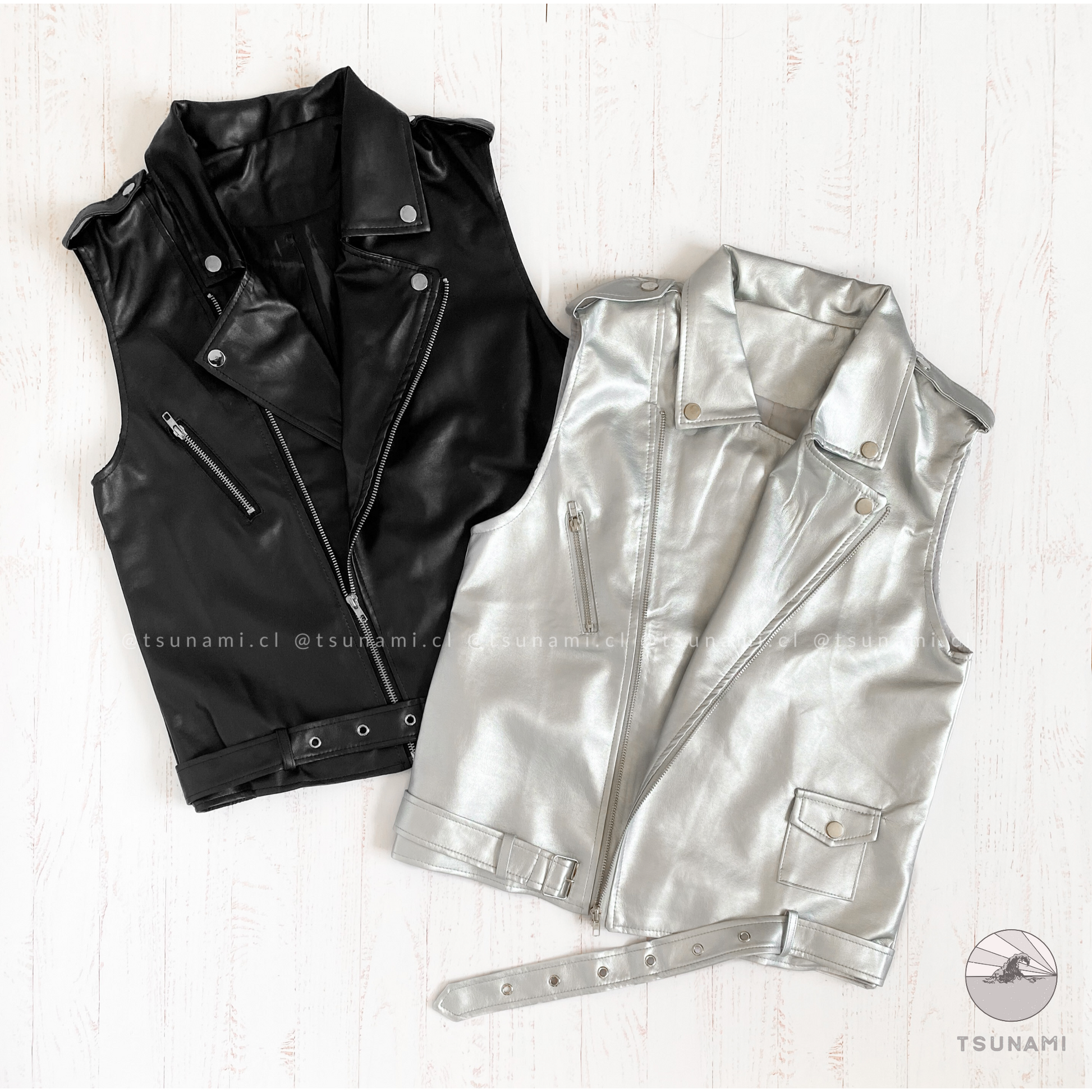 Chaqueta de ecocuero, con cierre delantero y cinturón. Talla estándar S/M/L.