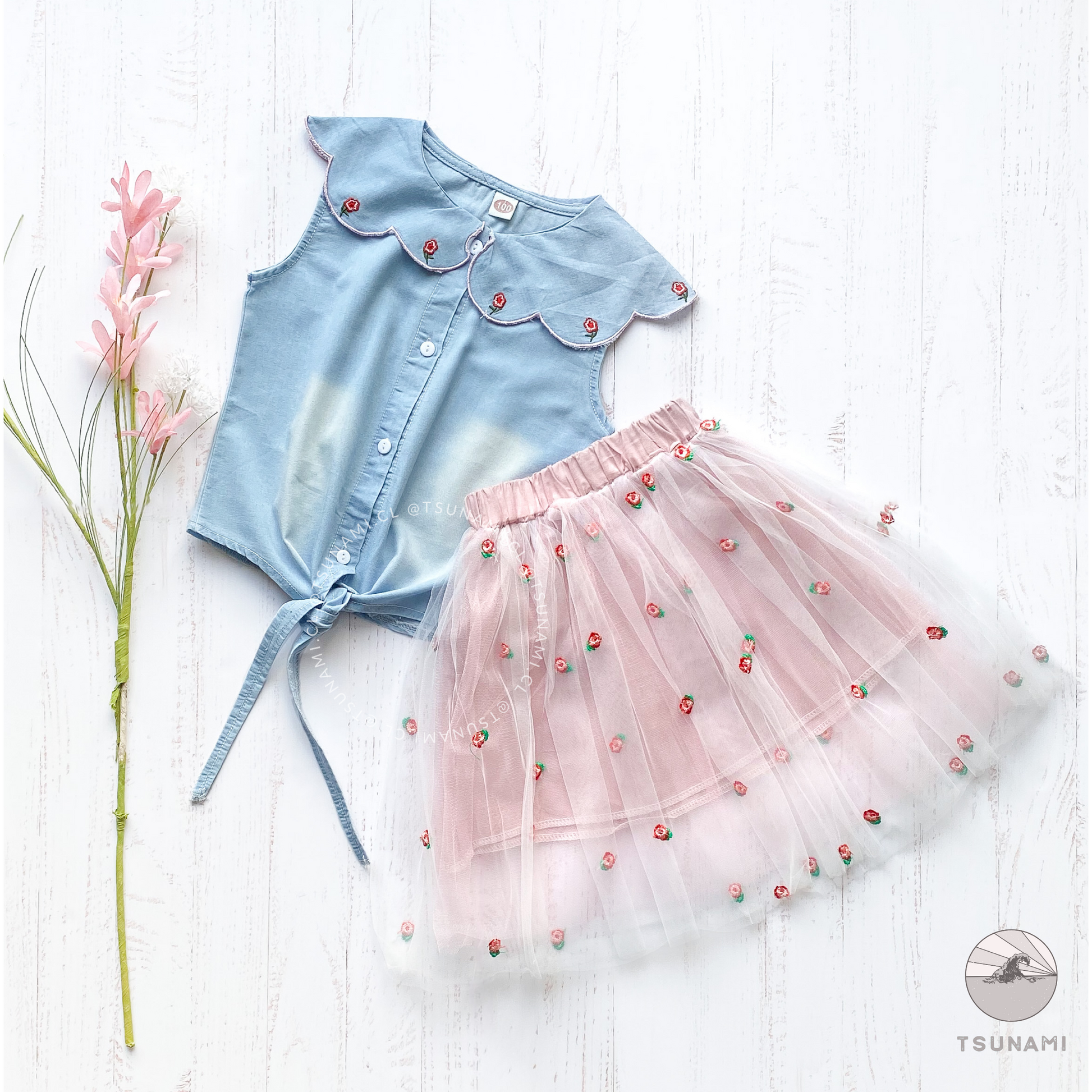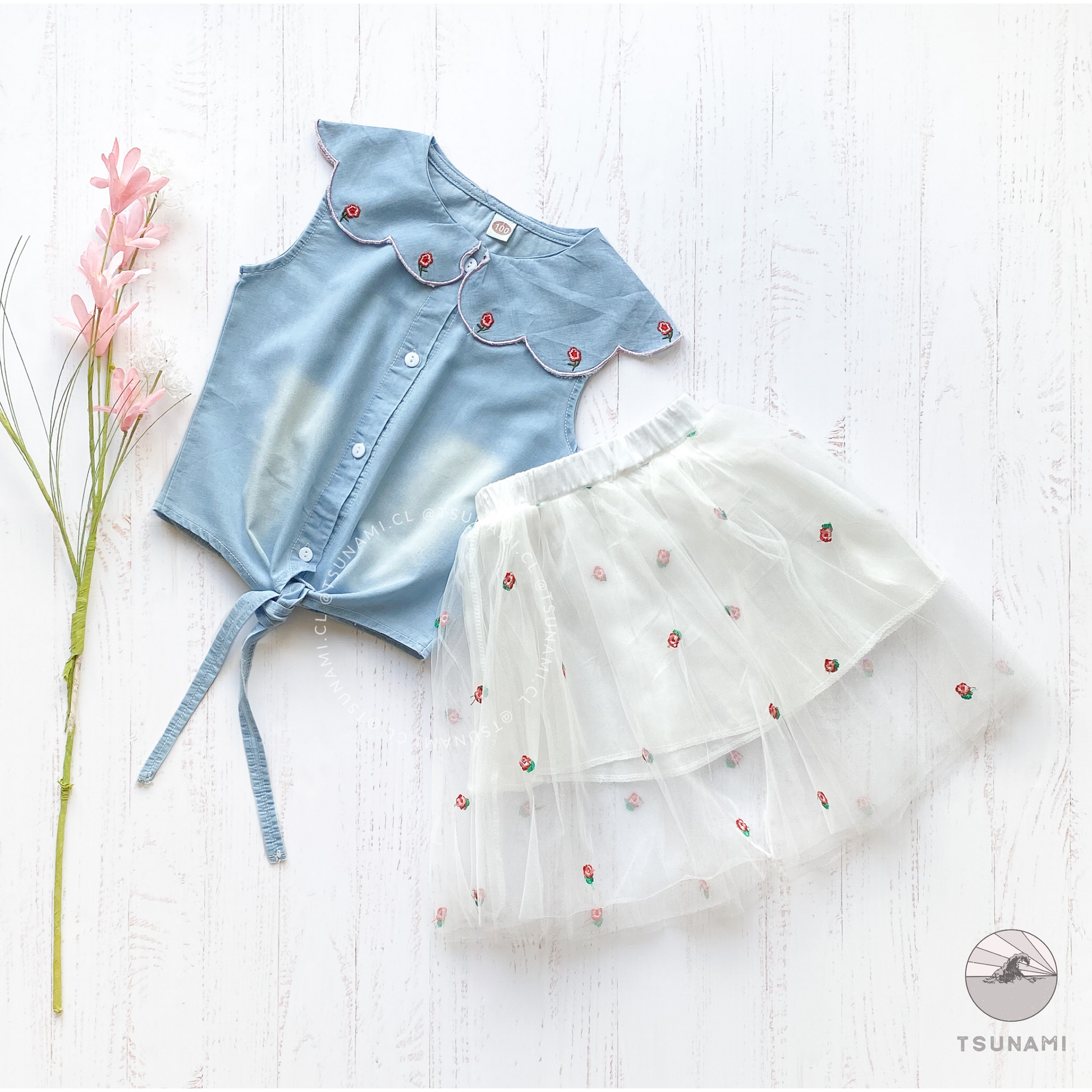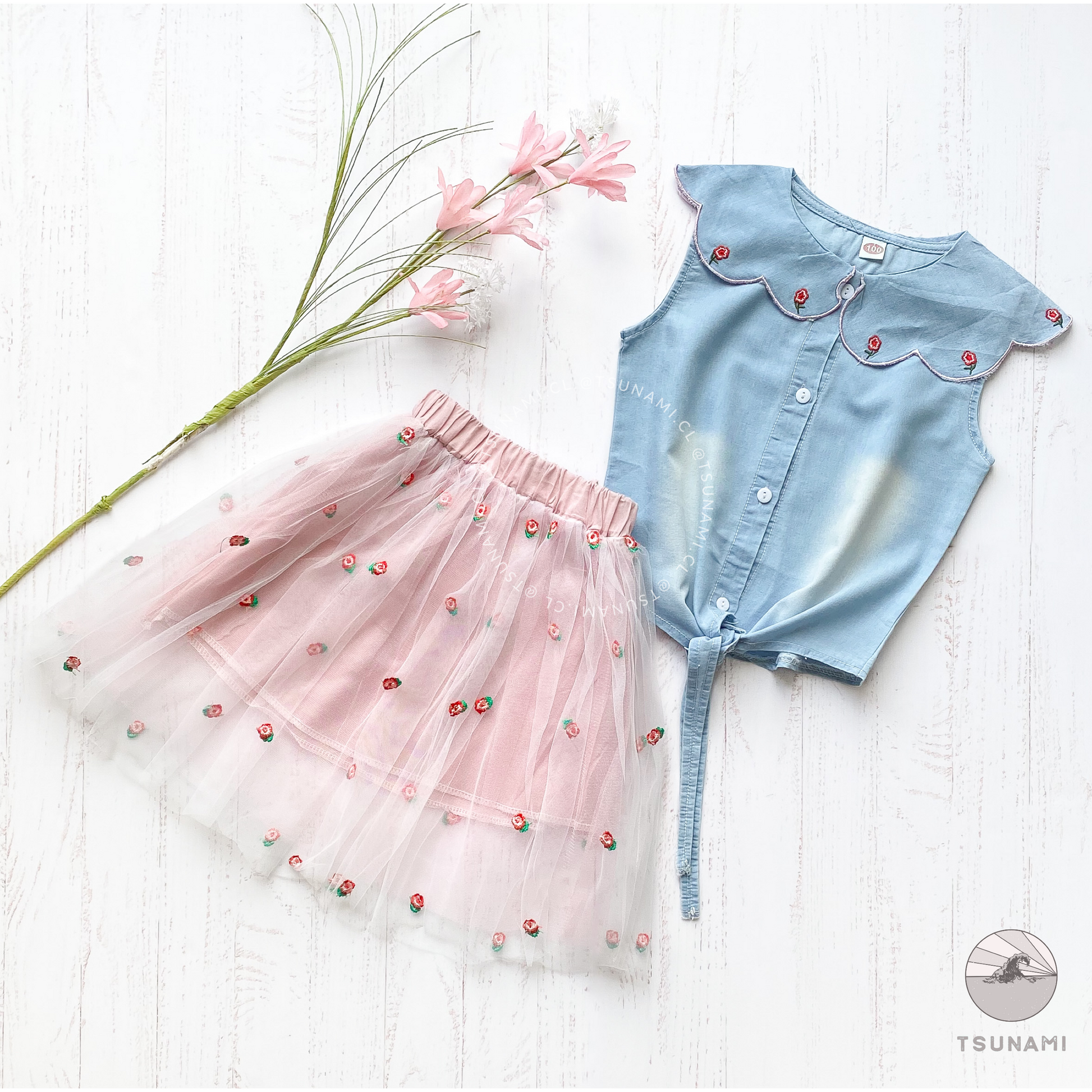 Blusa con flores en el cuello, botones funcionales y amarra inferior ajustable. Tutú de tul floreado, con forro inferior y pretina elasticada a tono.