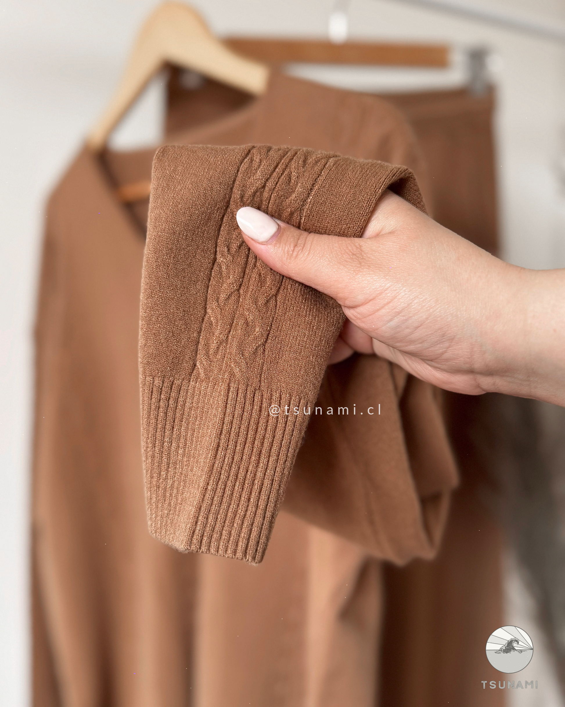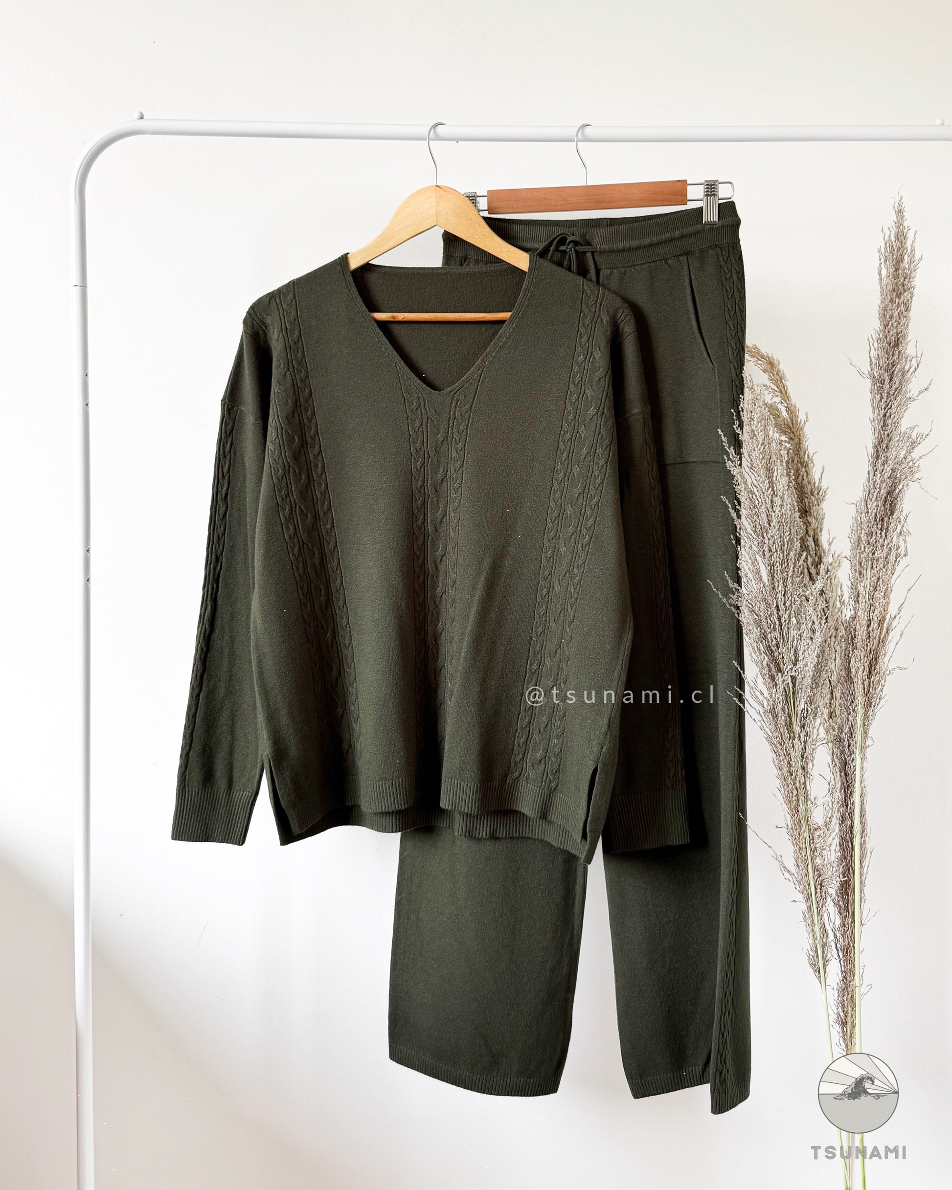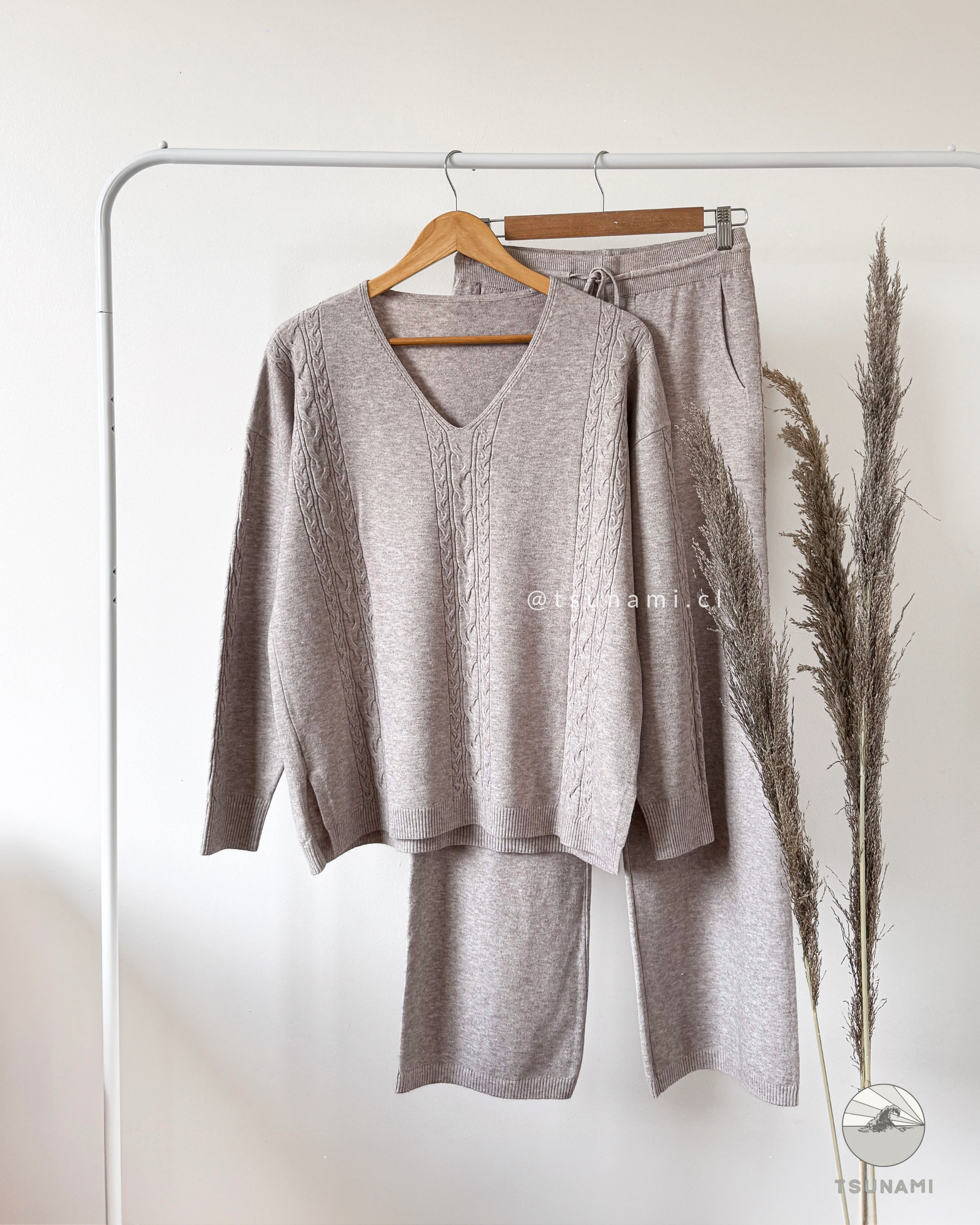 El suéter tiene escote en V y un diseño de espigas que da un toque delicado y femenino. El pantalón tiene bolsillos, pretina cómoda y fit relajado que no aprieta nada. El tejido es suave, con buena caída y se siente liviano al usar, perfecto para esta temporada 🍂