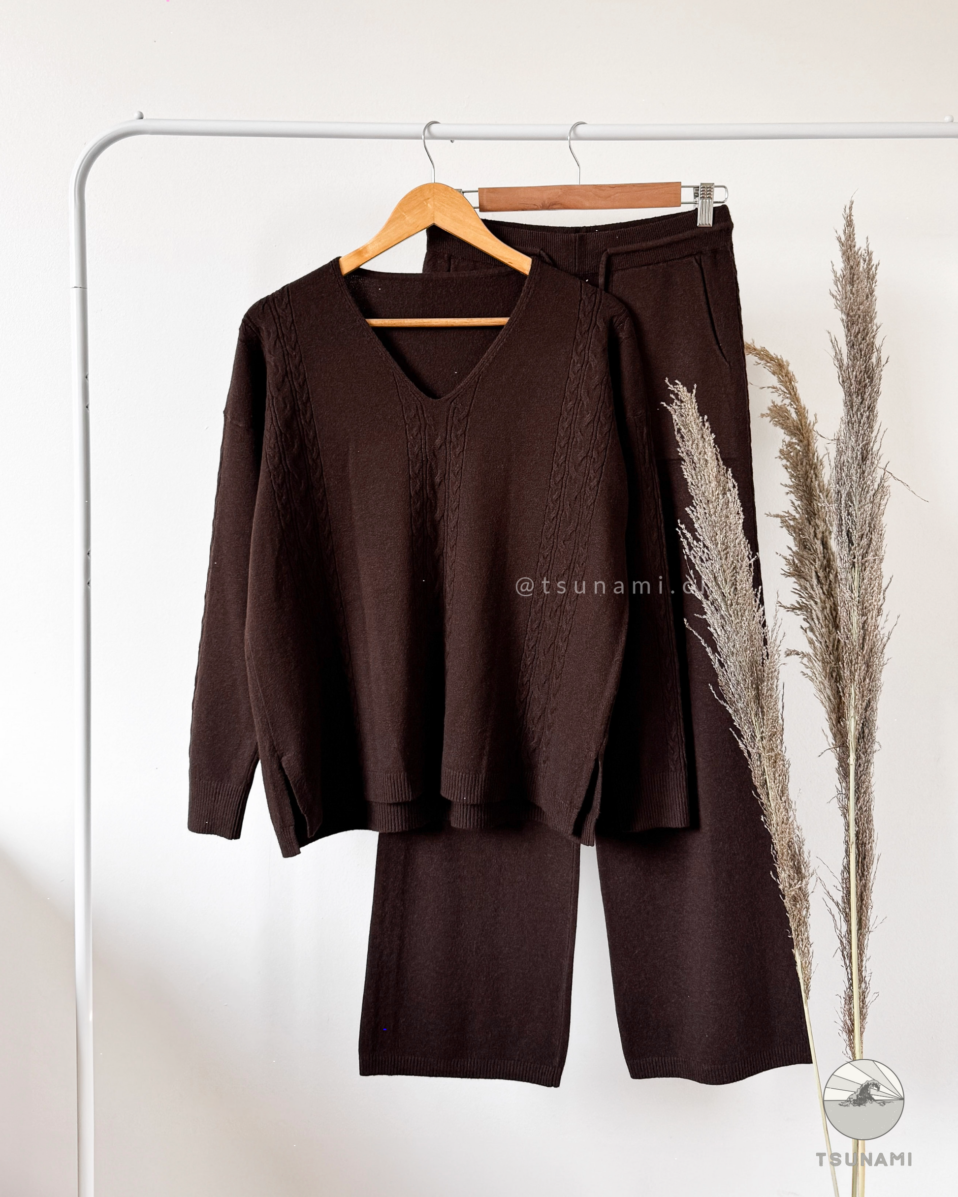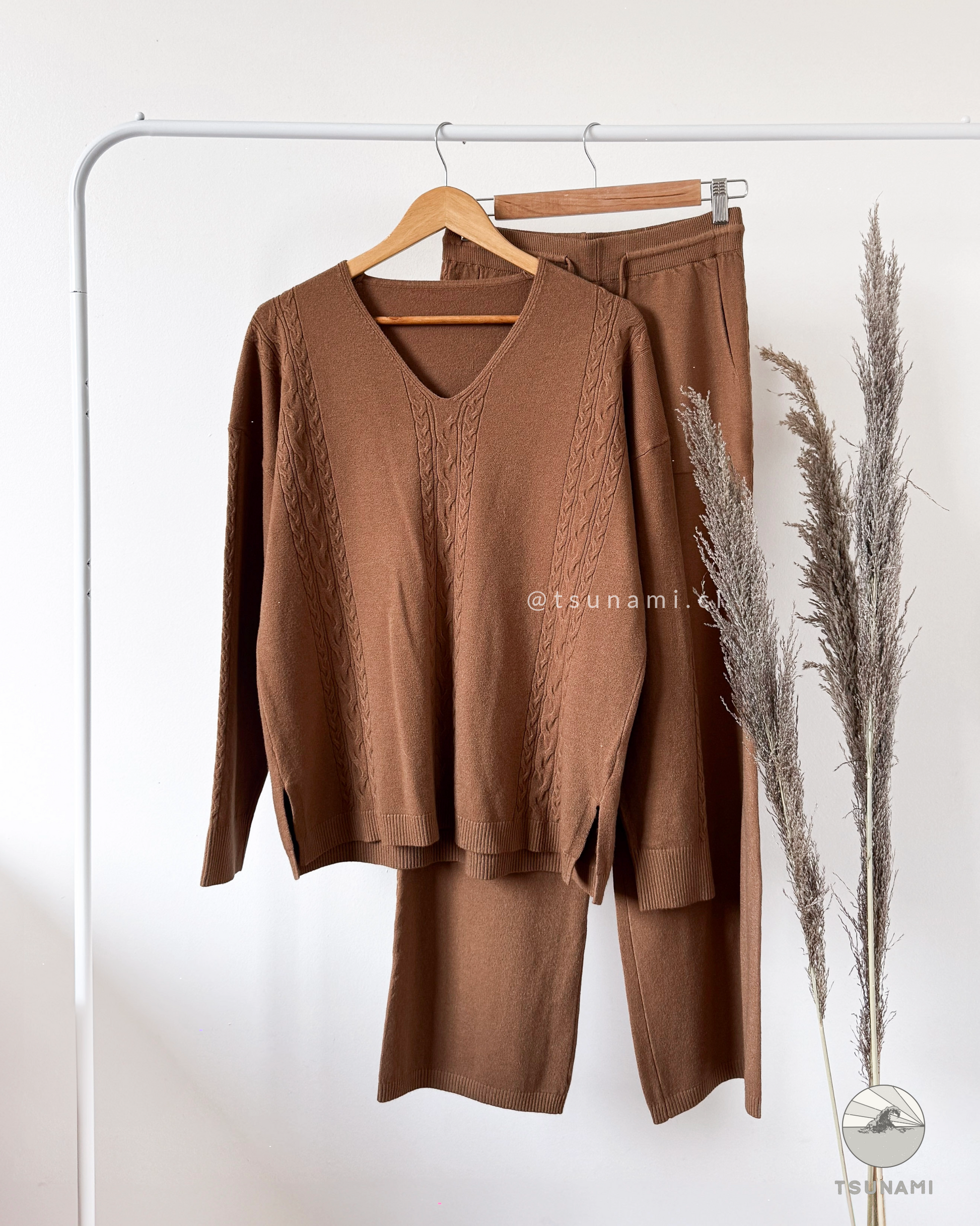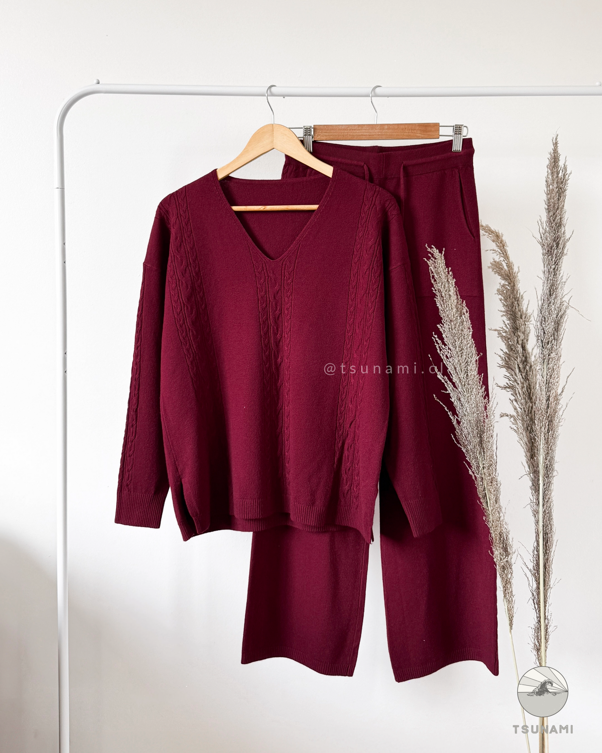 El suéter tiene escote en V y un diseño de espigas que da un toque delicado y femenino. El pantalón tiene bolsillos, pretina cómoda y fit relajado que no aprieta nada. El tejido es suave, con buena caída y se siente liviano al usar, perfecto para esta temporada 🍂