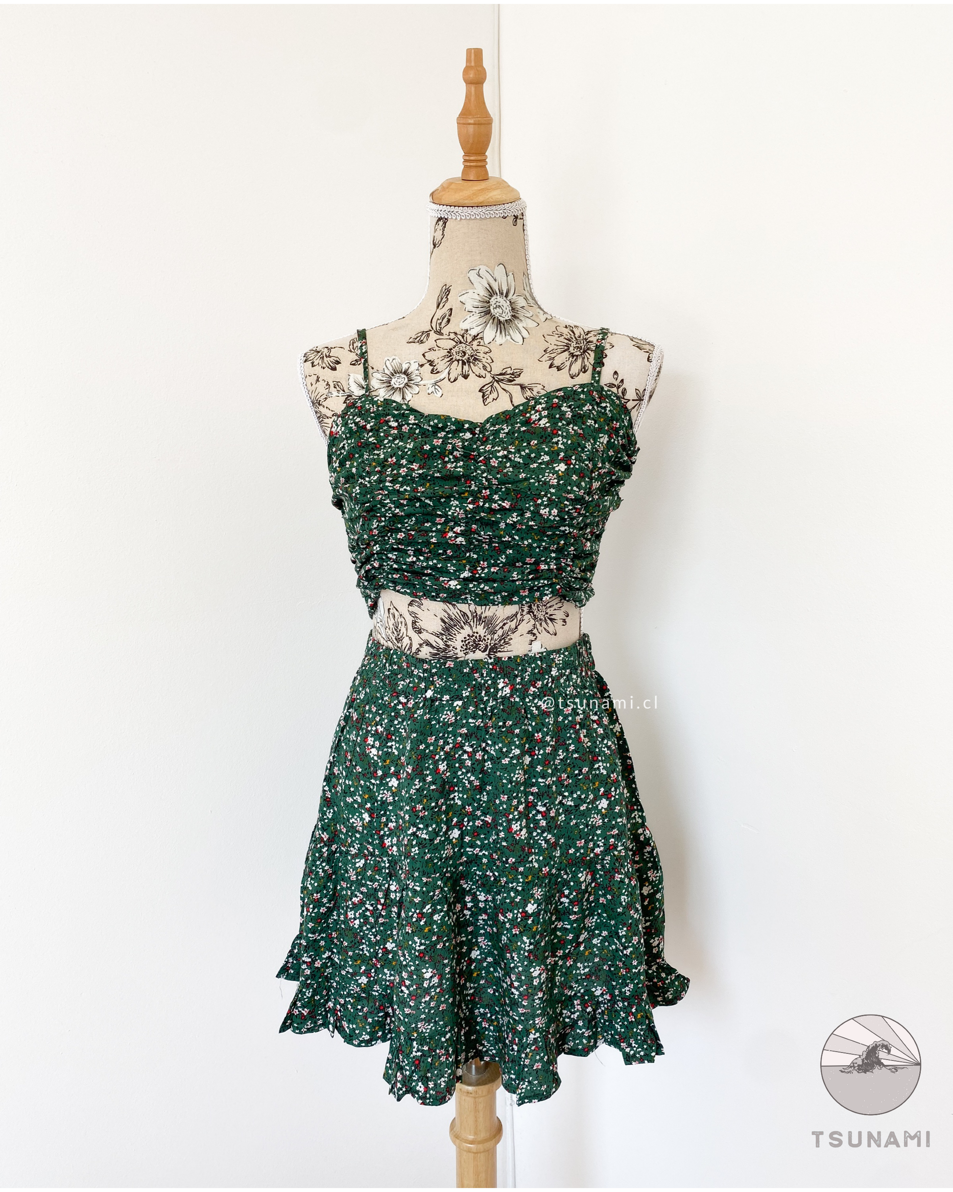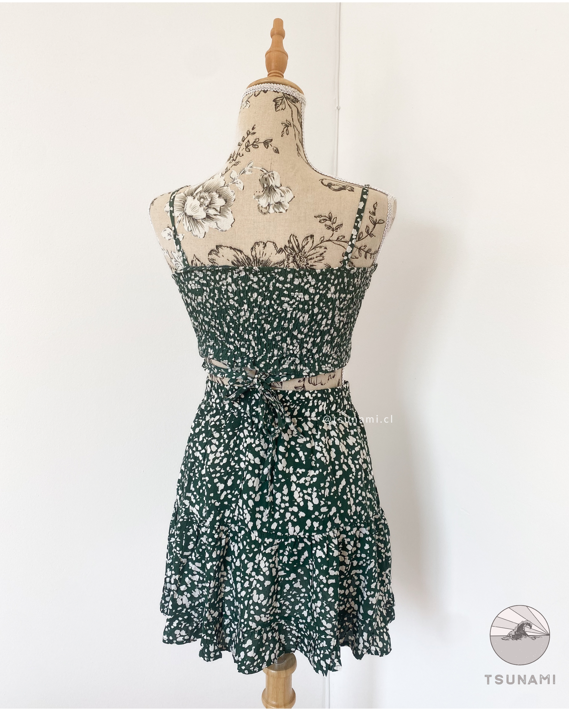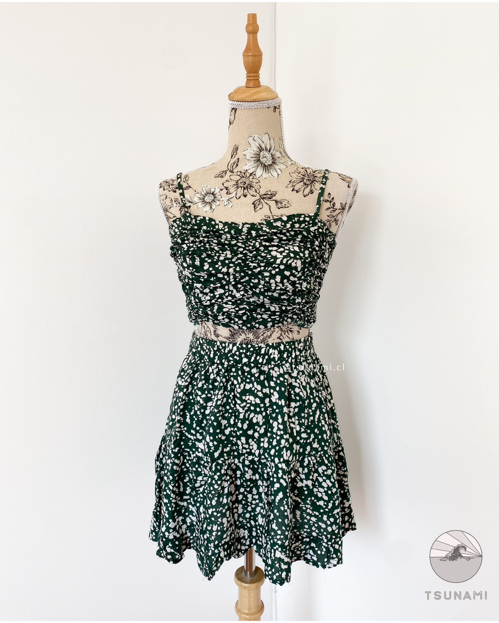 Set cómodo y fresco. La falda posee cintura elástico y tiene una caída super fluida, especial para los días calurosos. El top posee tiritas para recogerlo y ajustar los tirantes.