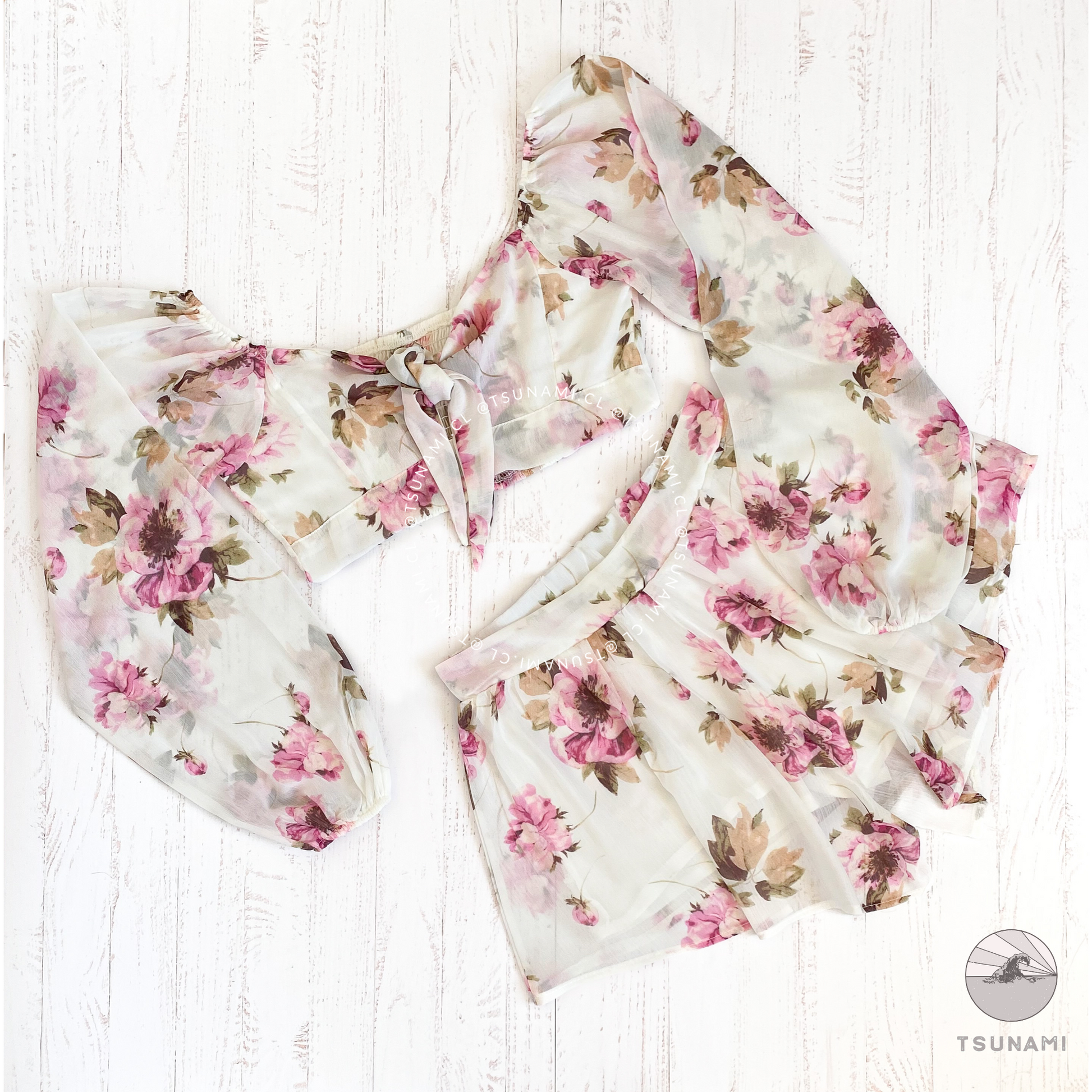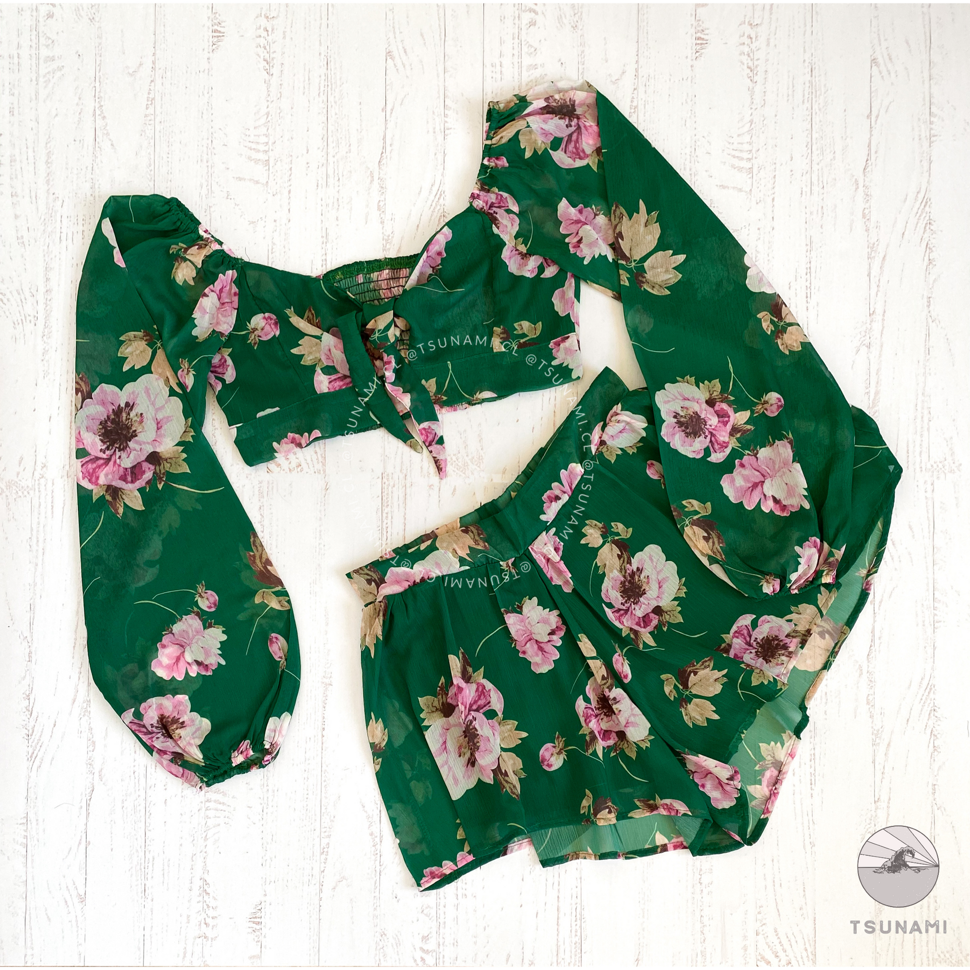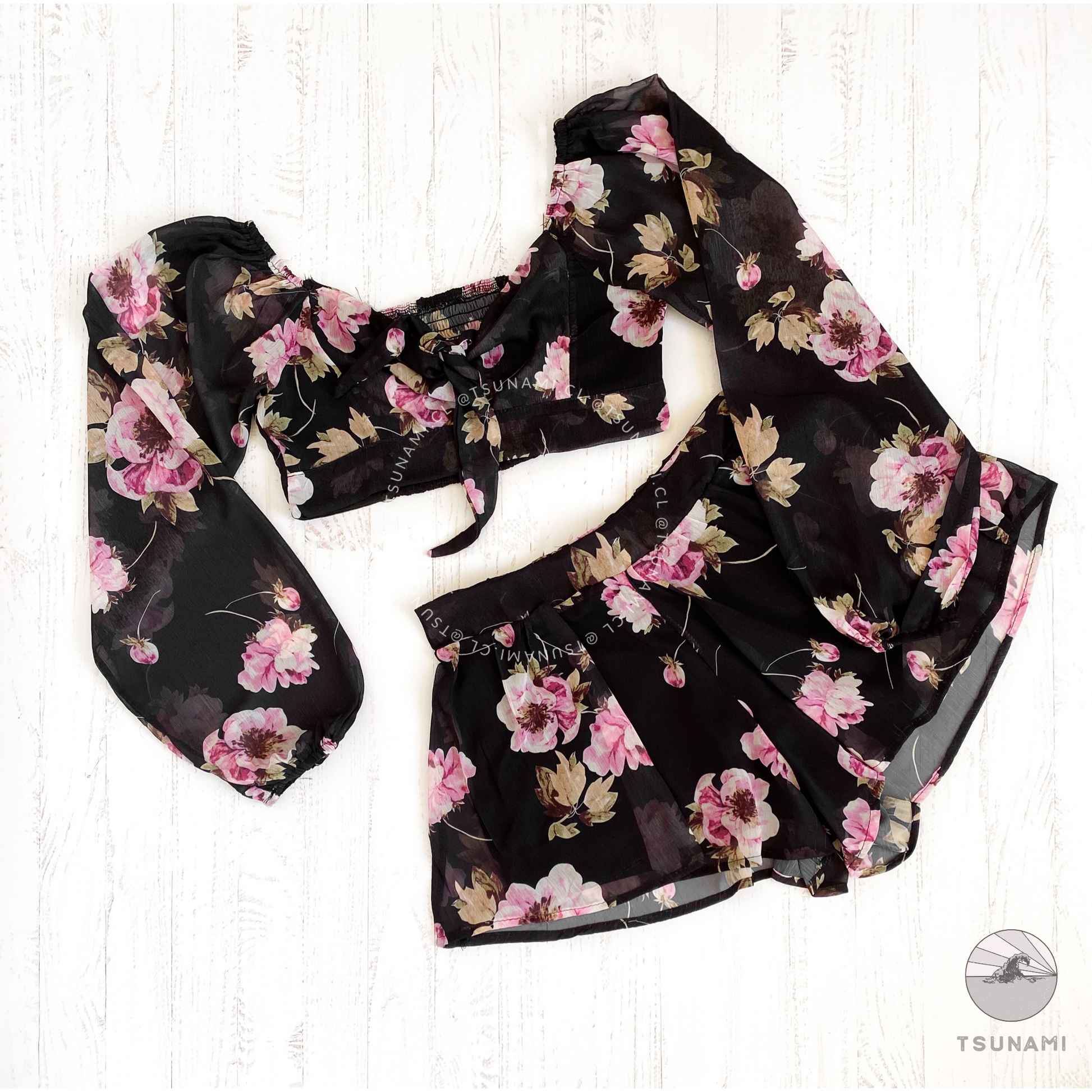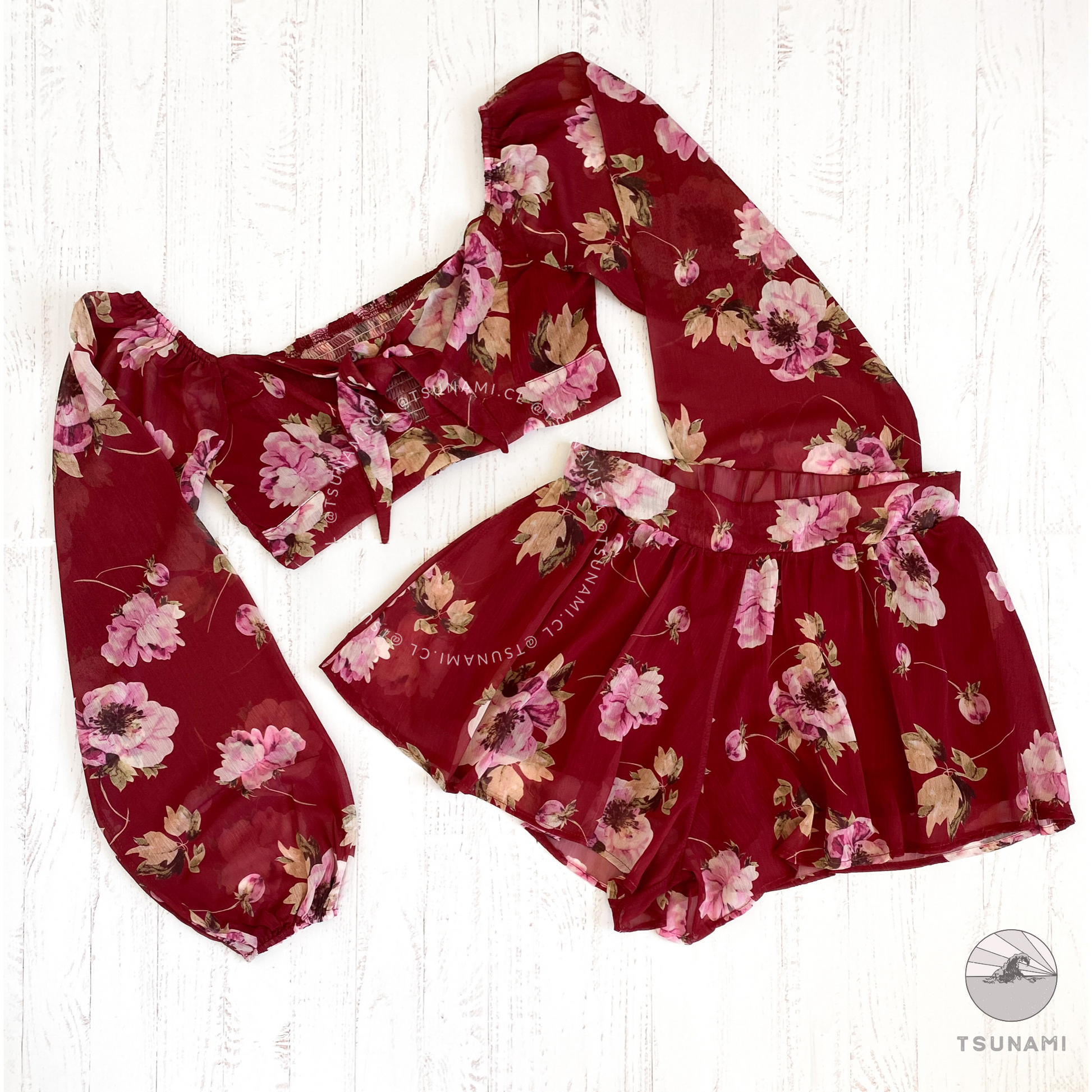 Conjunto de gasa compuesto por top y short. El top tiene doble tela en el busto, la espalda elasticada y un nudo en frente que es ajustable, por lo que puedes lucir un escote espectacular de acuerdo a tu gusto. El short es de caída muy fluida y tan amplio que incluso parece una falda, posee cintura elasticada y trae forro para máxima seguridad.