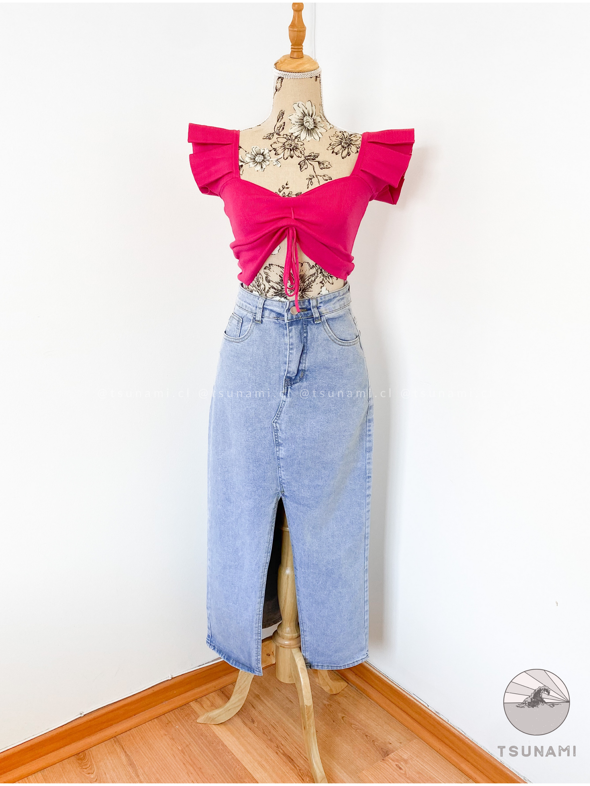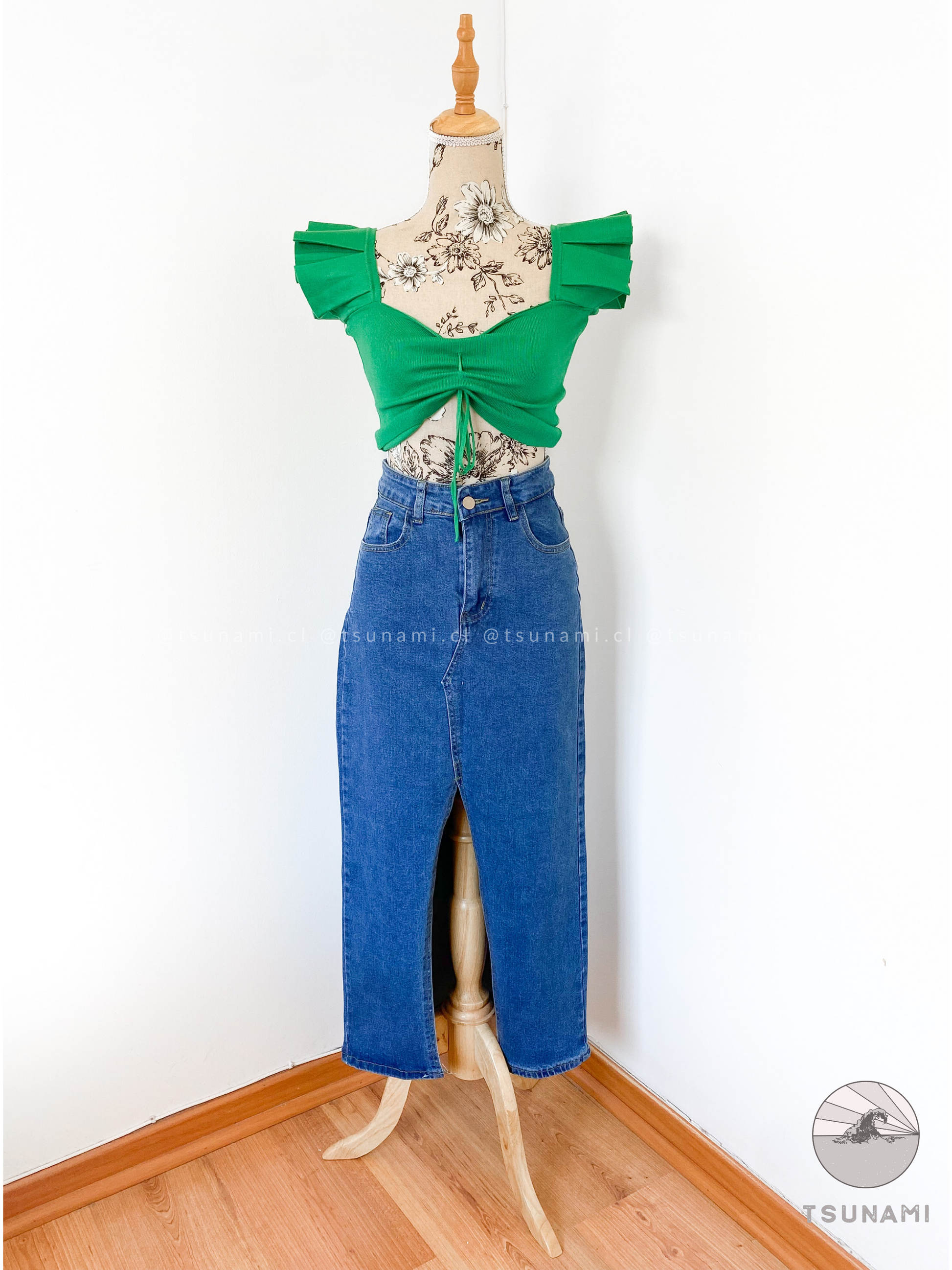 Las faldas largas de mezclilla están en tendencia este año, puedes usarla con cualquier top y lucirás increíble. Junto al Top con mangas volados queda increíble para un look primaveral.