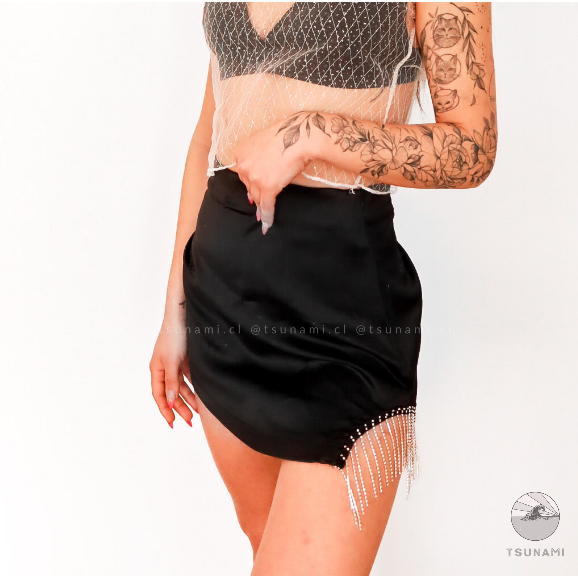 De tela satinada rígida, cintura ligeramente elástica, cierre al costado izquierdo.