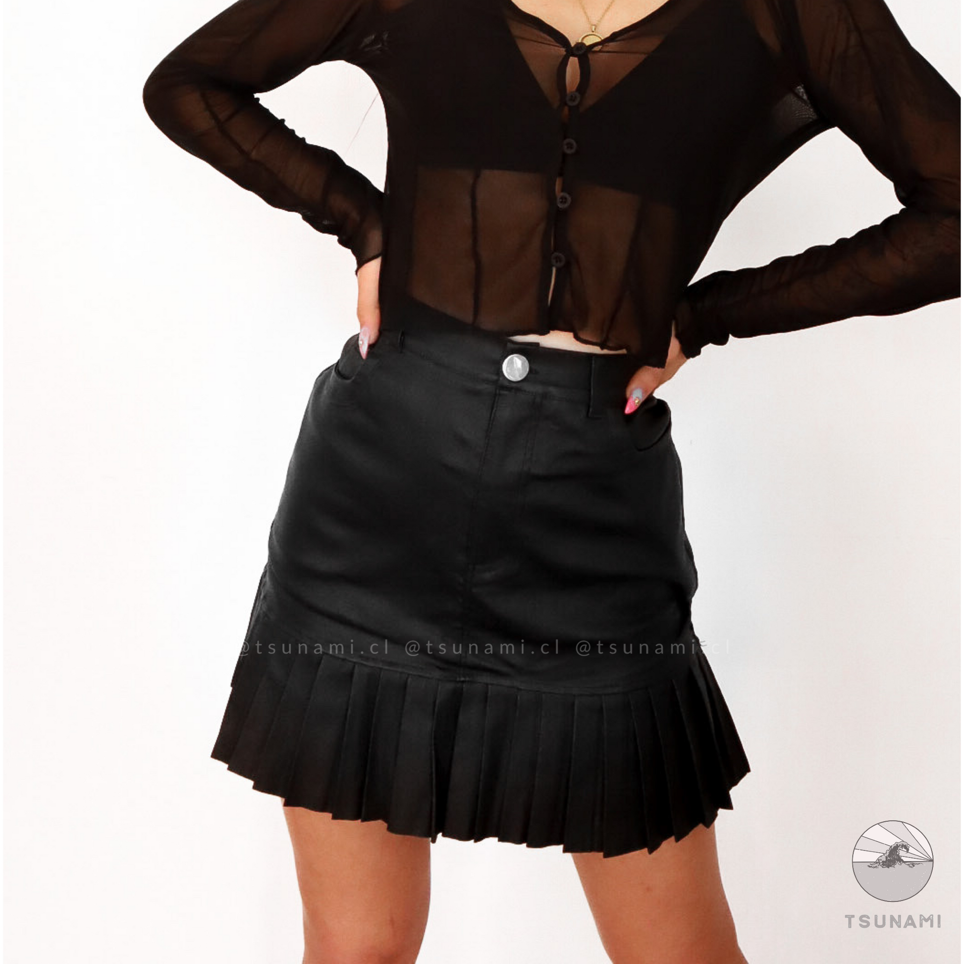Falda elasticada de ecocuero, con pasador para cinturón, bolsillos funcionales, cierre y botón delanteros.