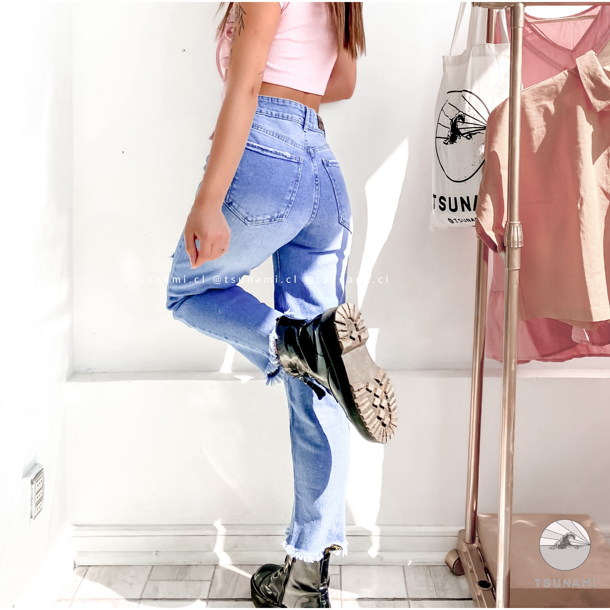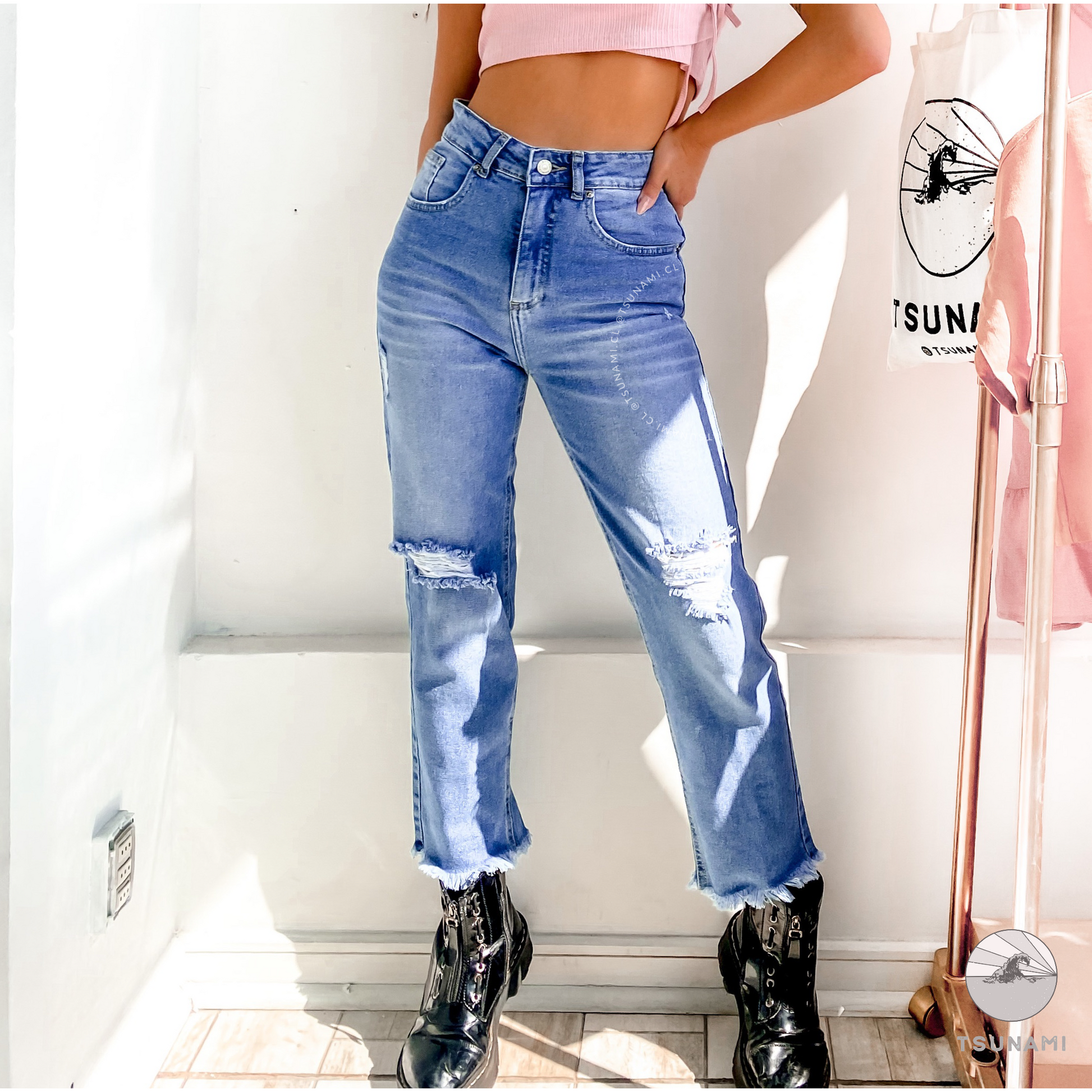 Un clásico de mezclilla, tiro alto y pierna recta pero modernizado: posee desgaste en las rodillas y desflecado en el borde inferior de la pierna. Úsalo con cualquier top para un look diario super casual.