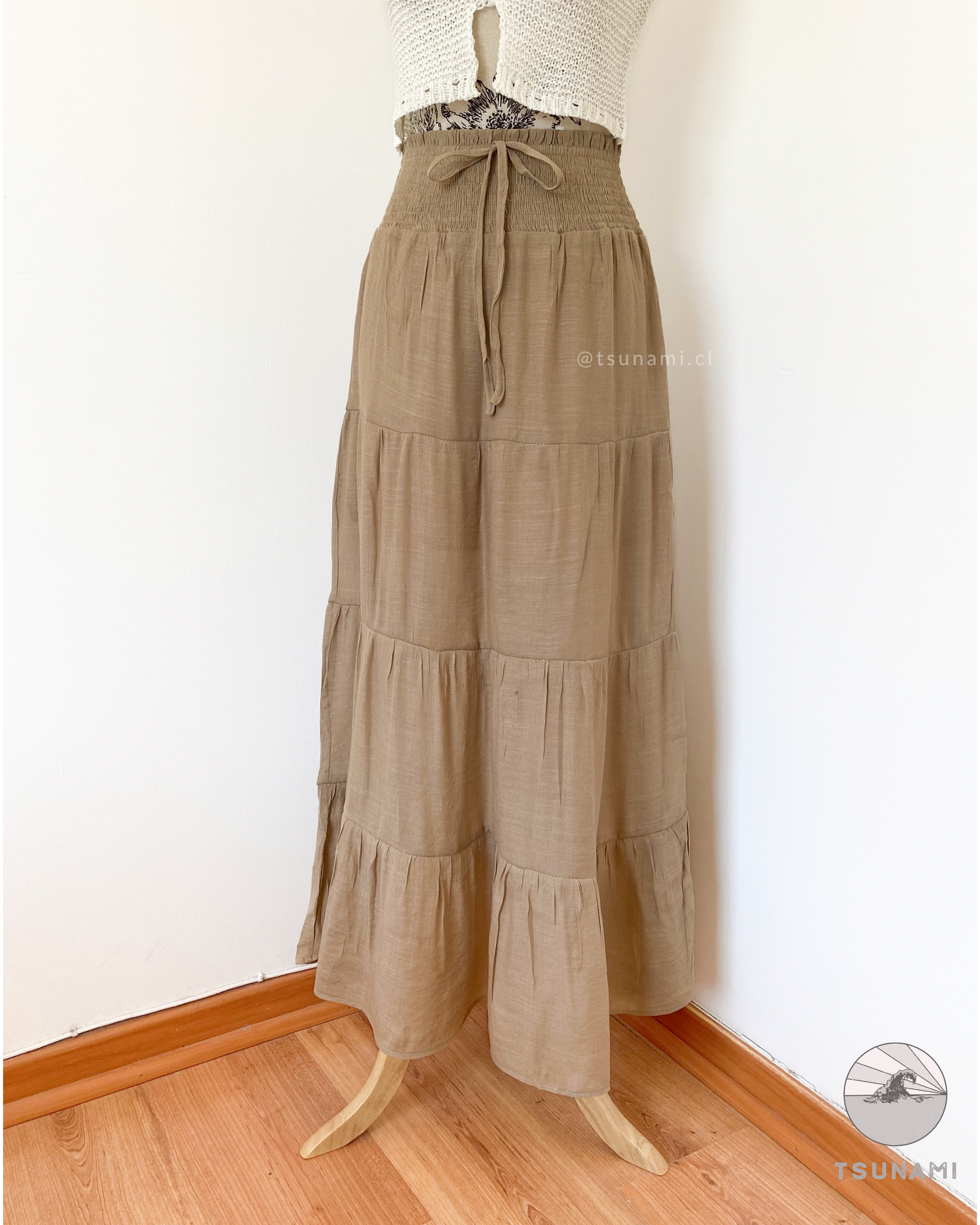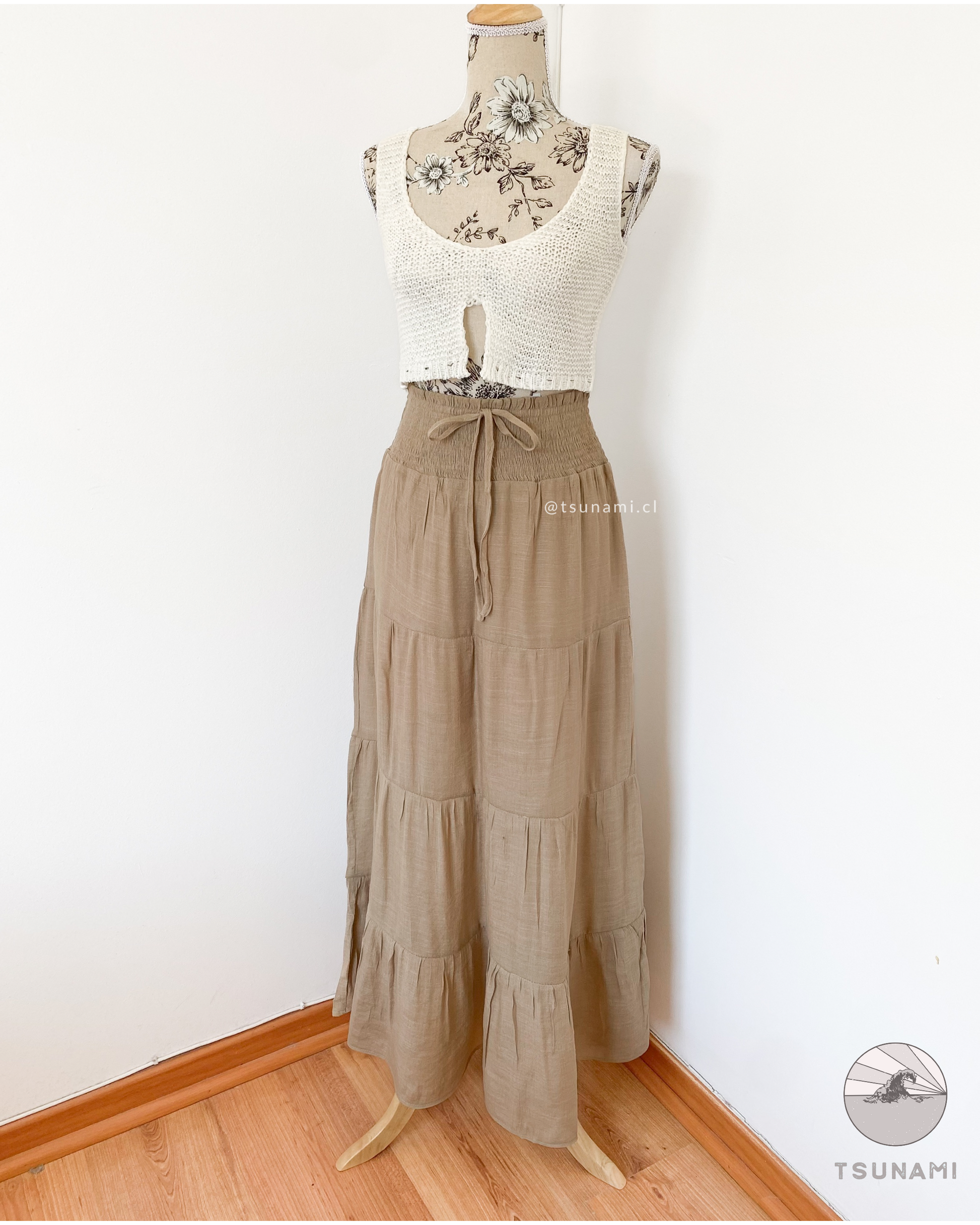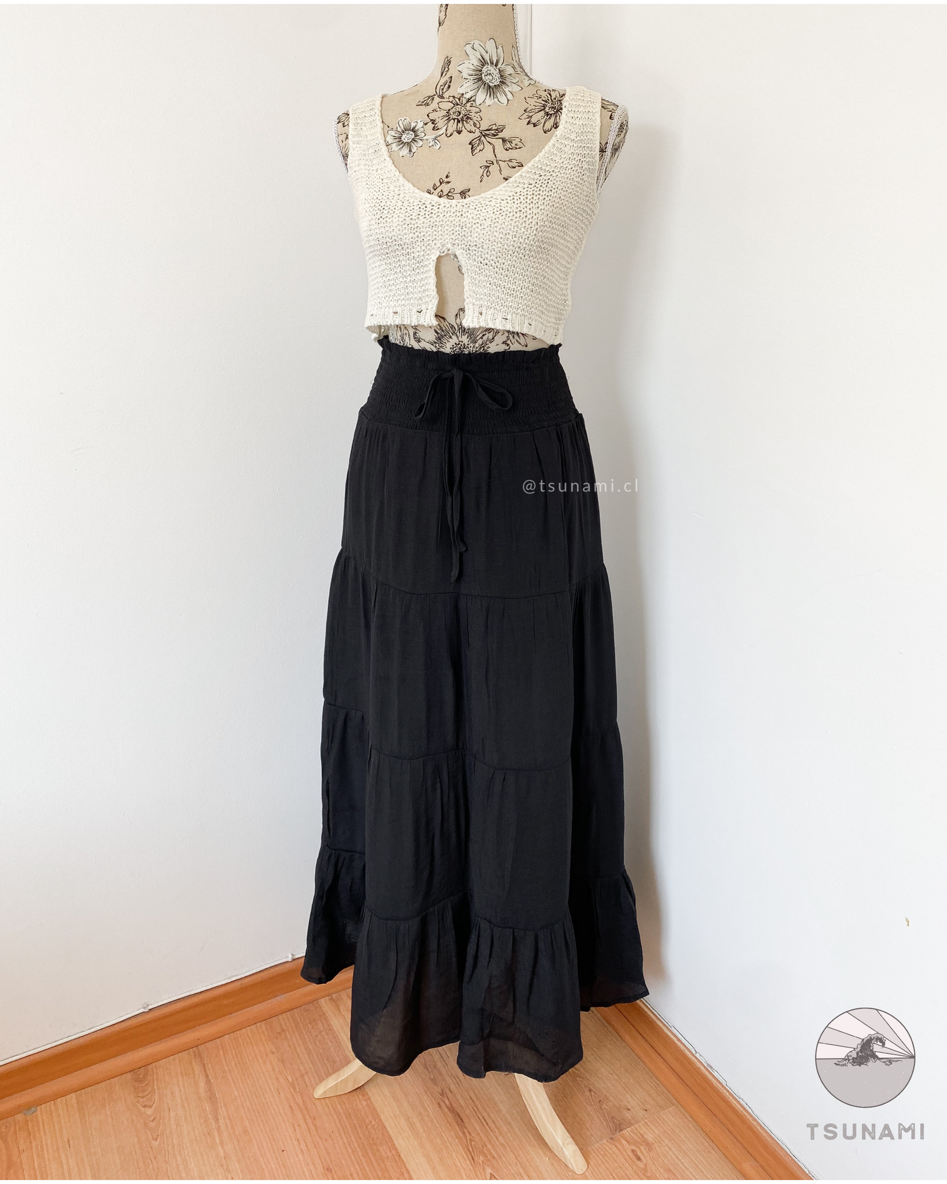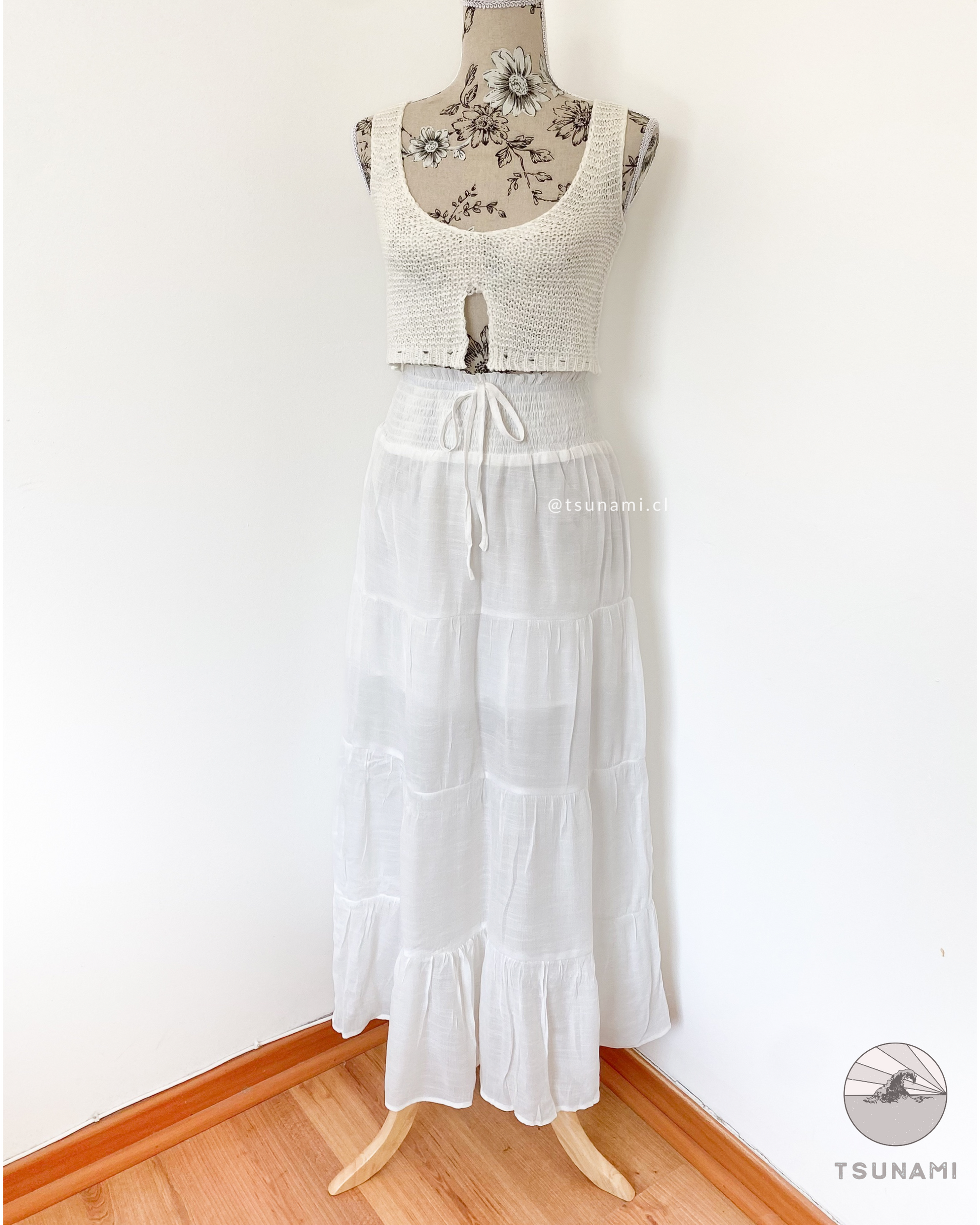 Falda larga súper veraniega, de tela muy liviana y fresca, perfecta para tus outfits de días calurosos. Úsala en tus looks de diario o para acompañar tus looks de playa!! Posee un forro inferior para evitar que se trasluzca.