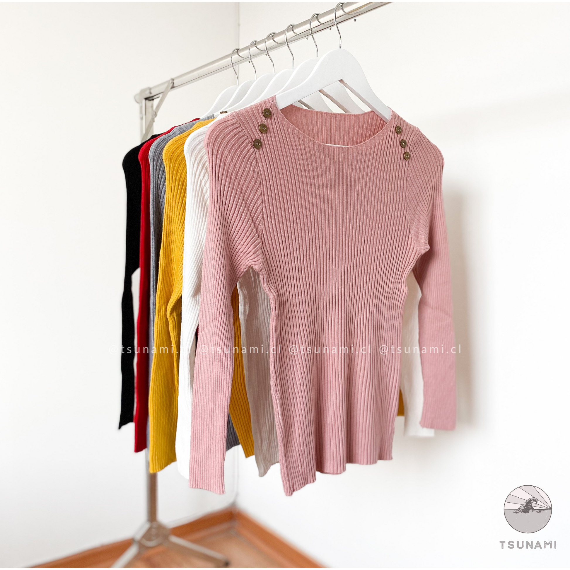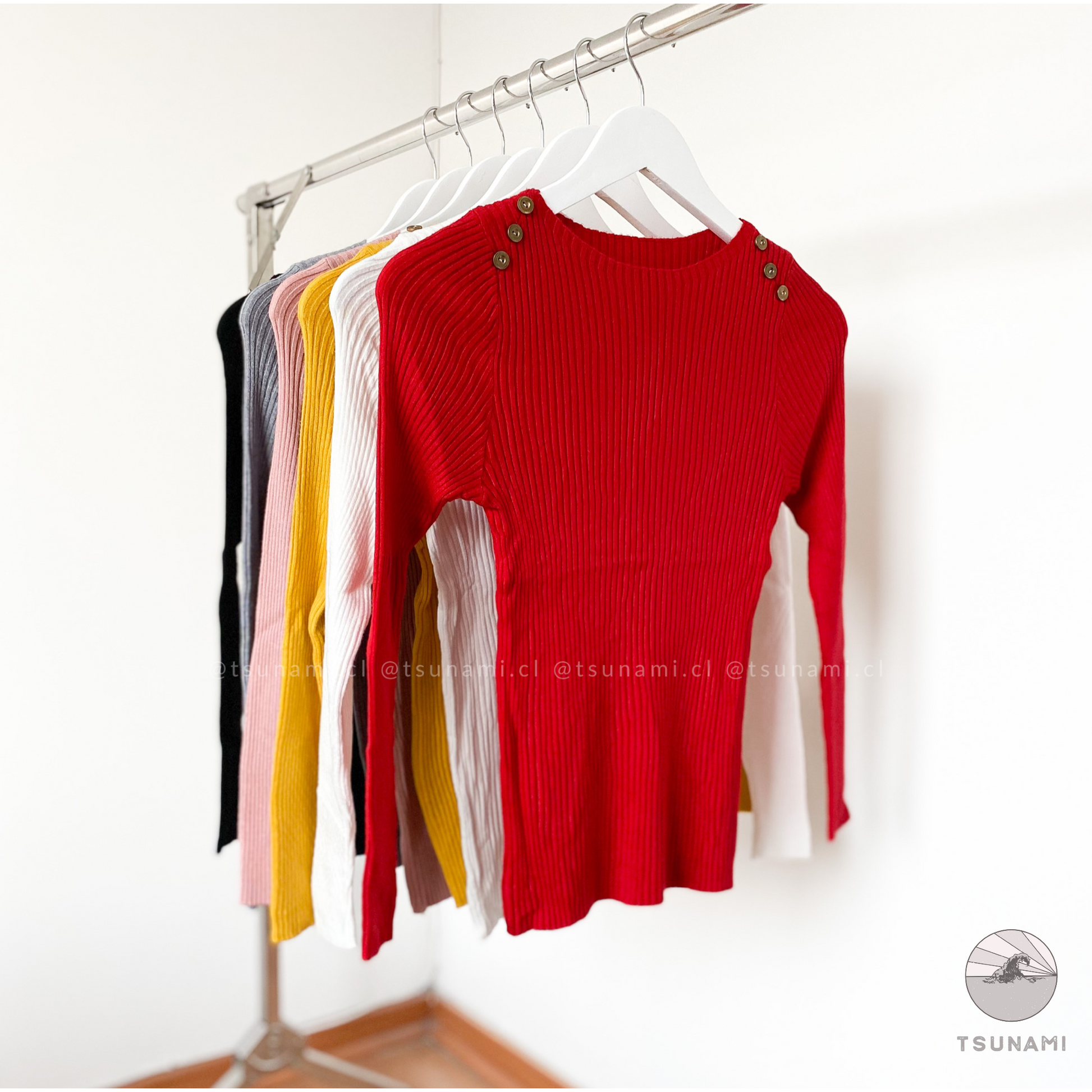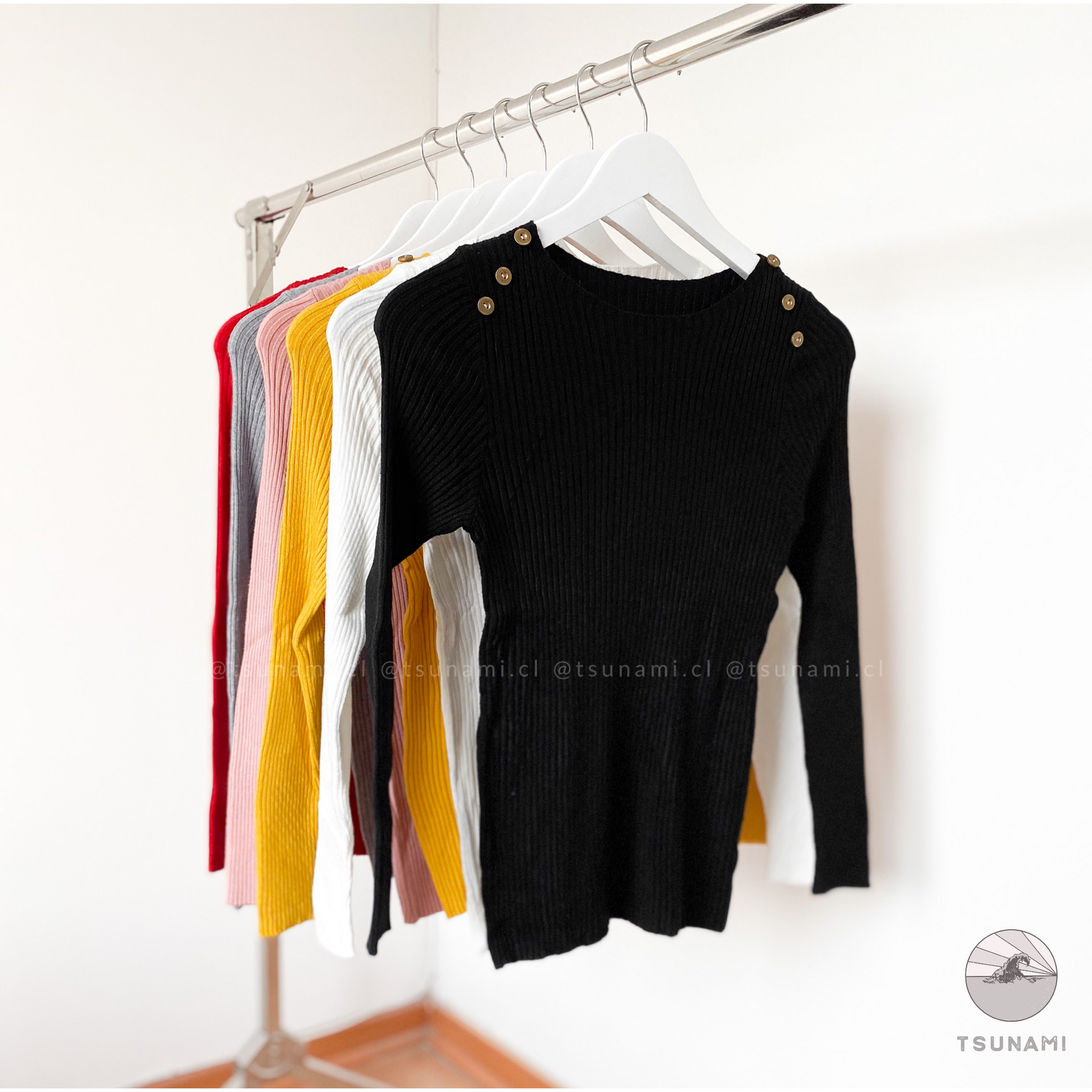 Polera de hilo elasticado con detalle de botones en los hombros. Es una prenda super básica que puede elevar tu outfit ♥