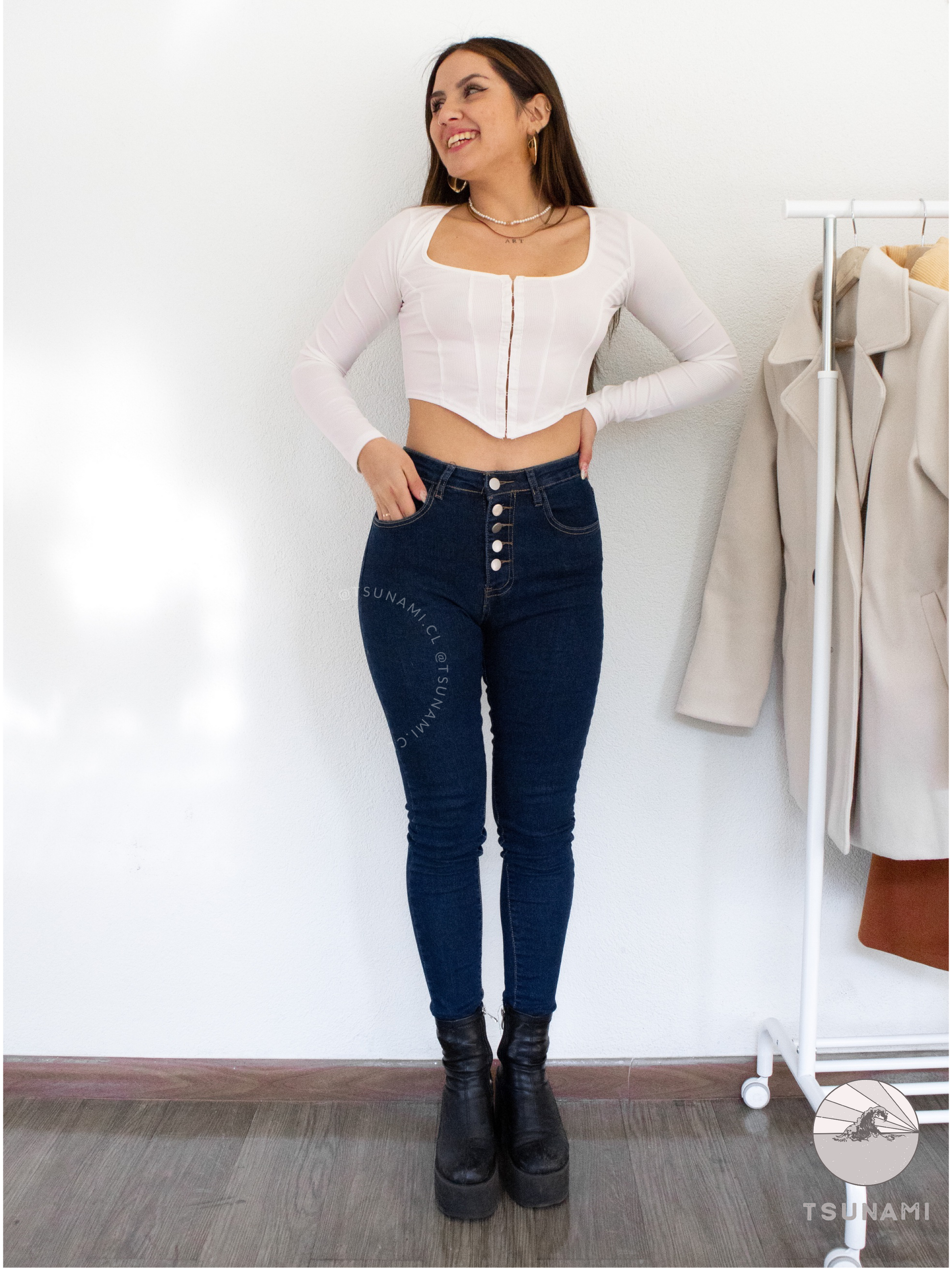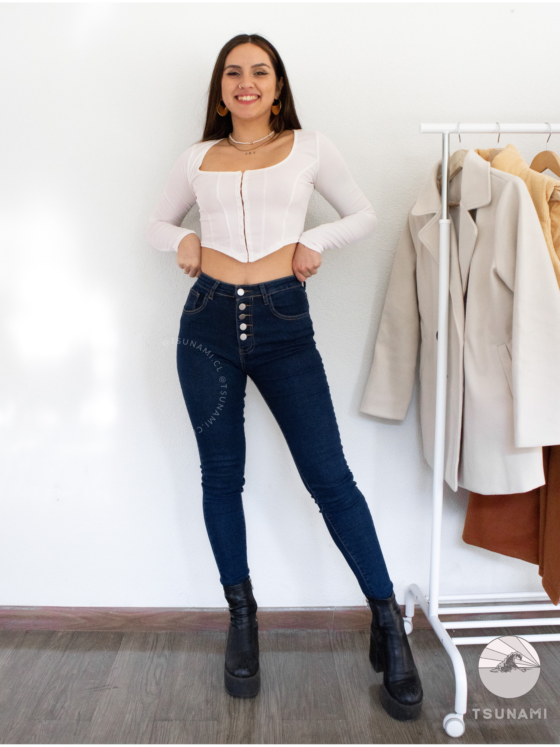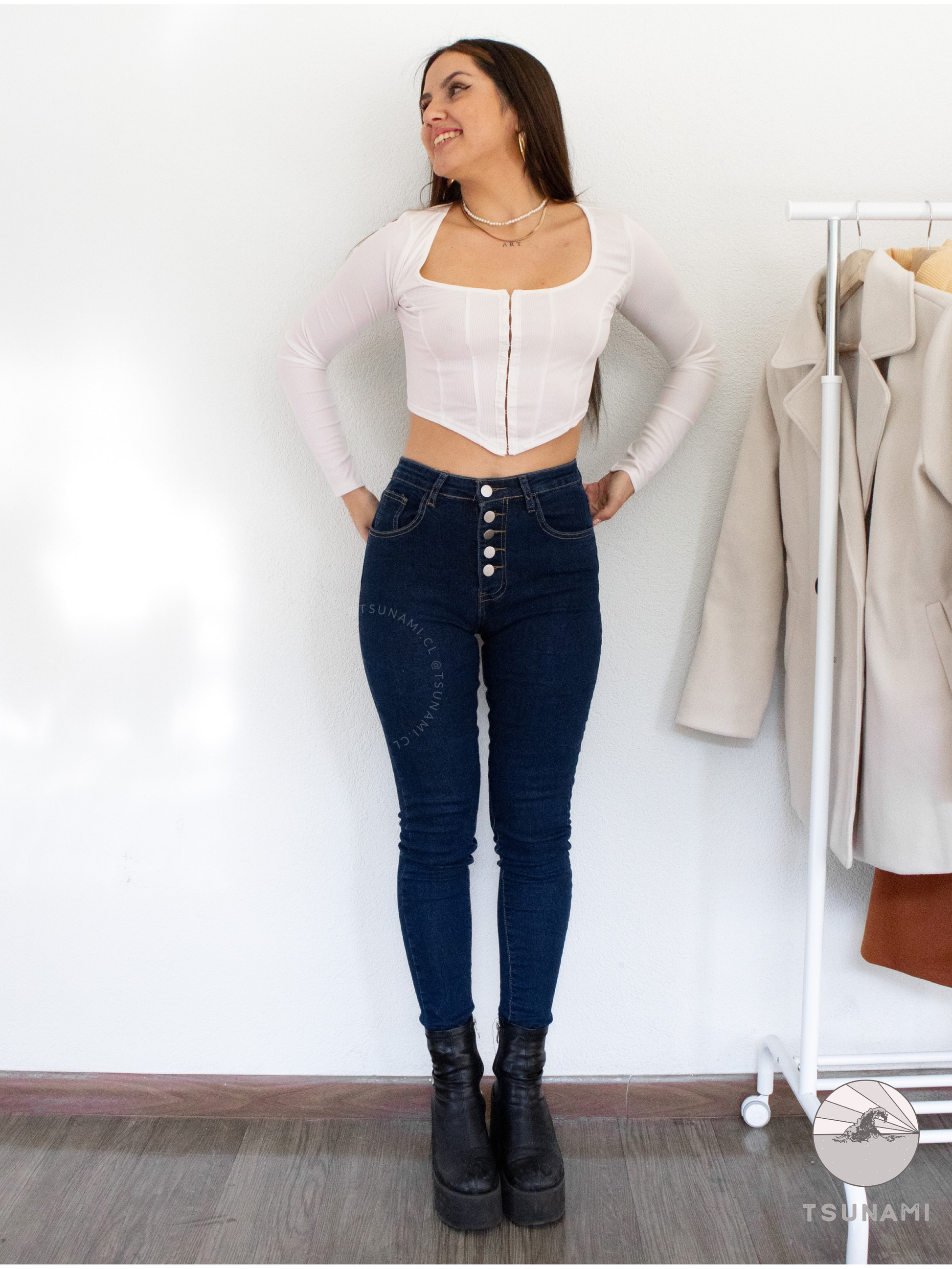 El clásico skinny de mezclilla elasticada, de grosor medio y tiro alto. Posee 5 botones para cerrar, no posee cierre. ¡Cómodo y con ajuste perfecto! Lleva tu look al siguiente nivel.