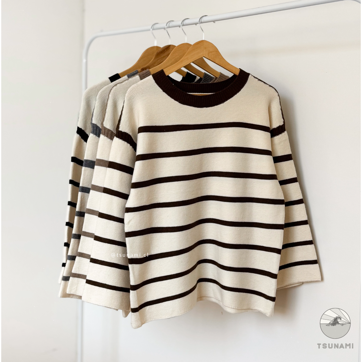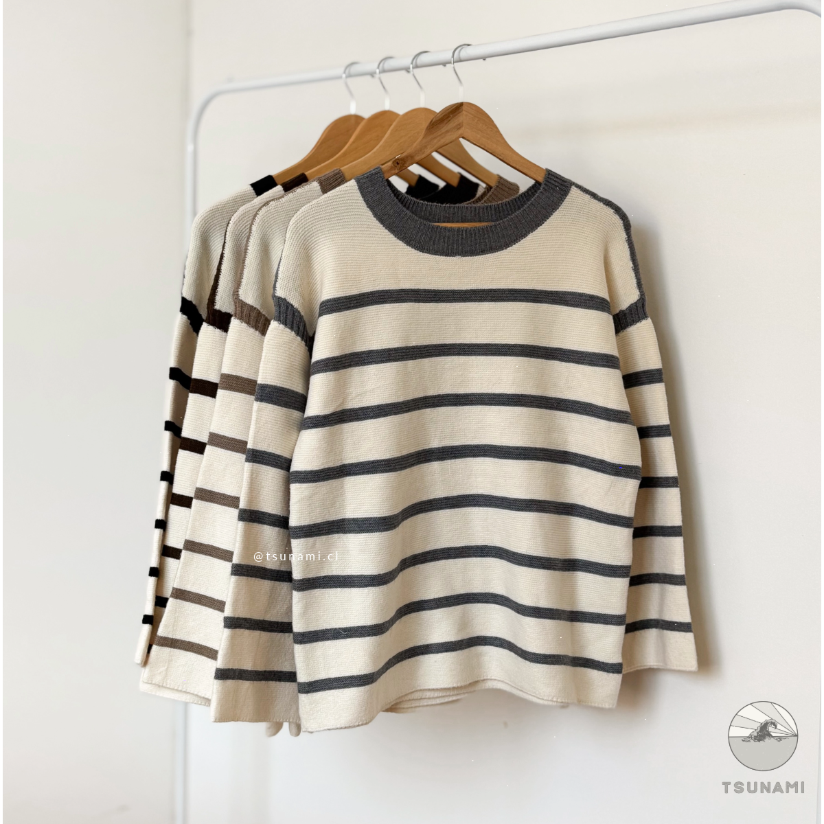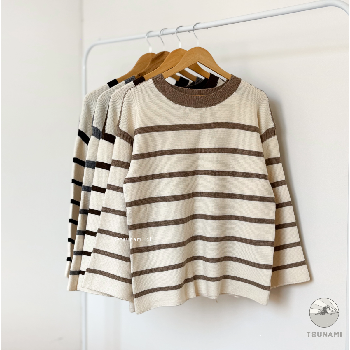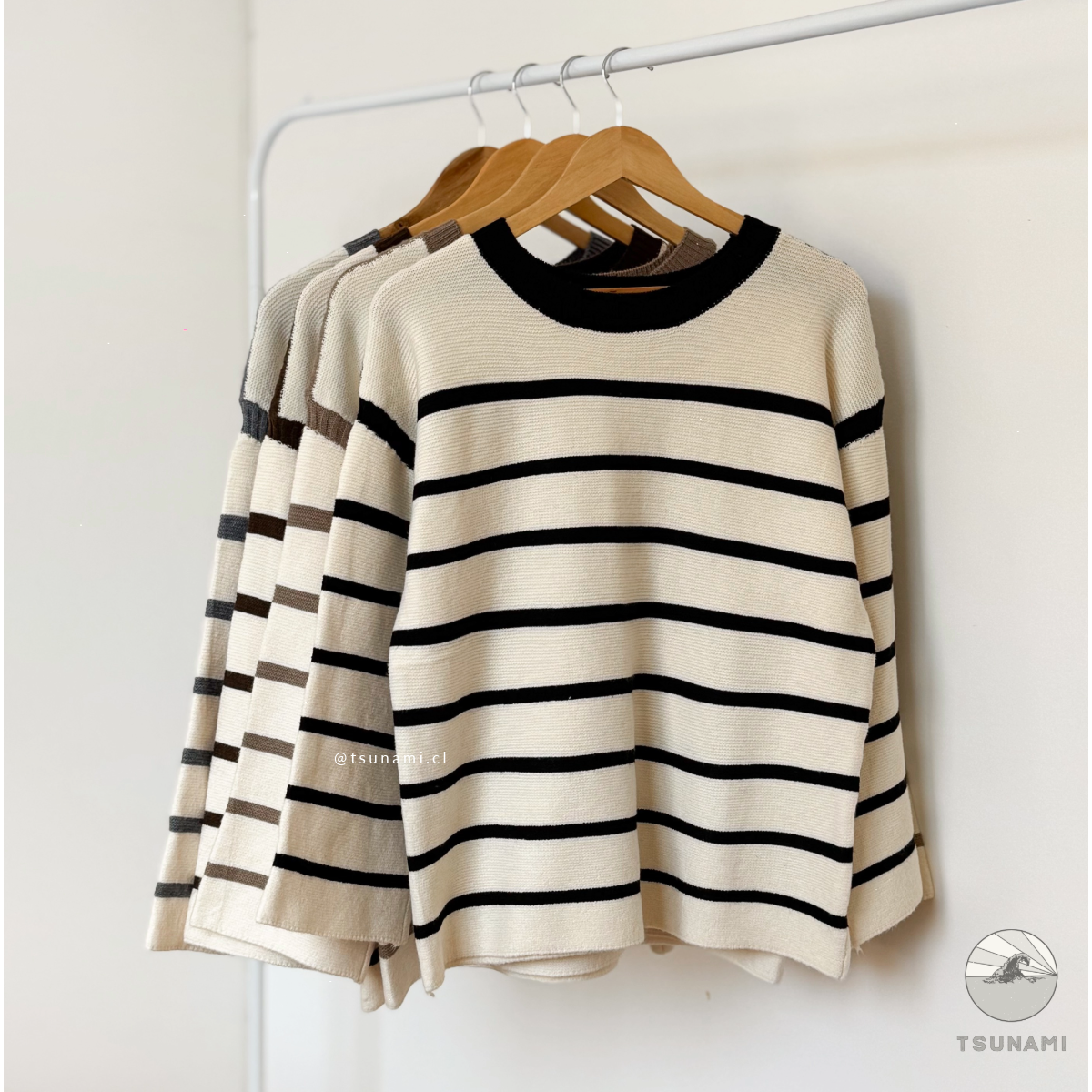 Este suéter de rayas es un clásico reinventado, de esos que siempre suman estilo sin esfuerzo. Su diseño de líneas horizontales en tonos neutros lo hace fácil de combinar, atemporal y con un aire relajado que amamos para los días otoñales 🍂.