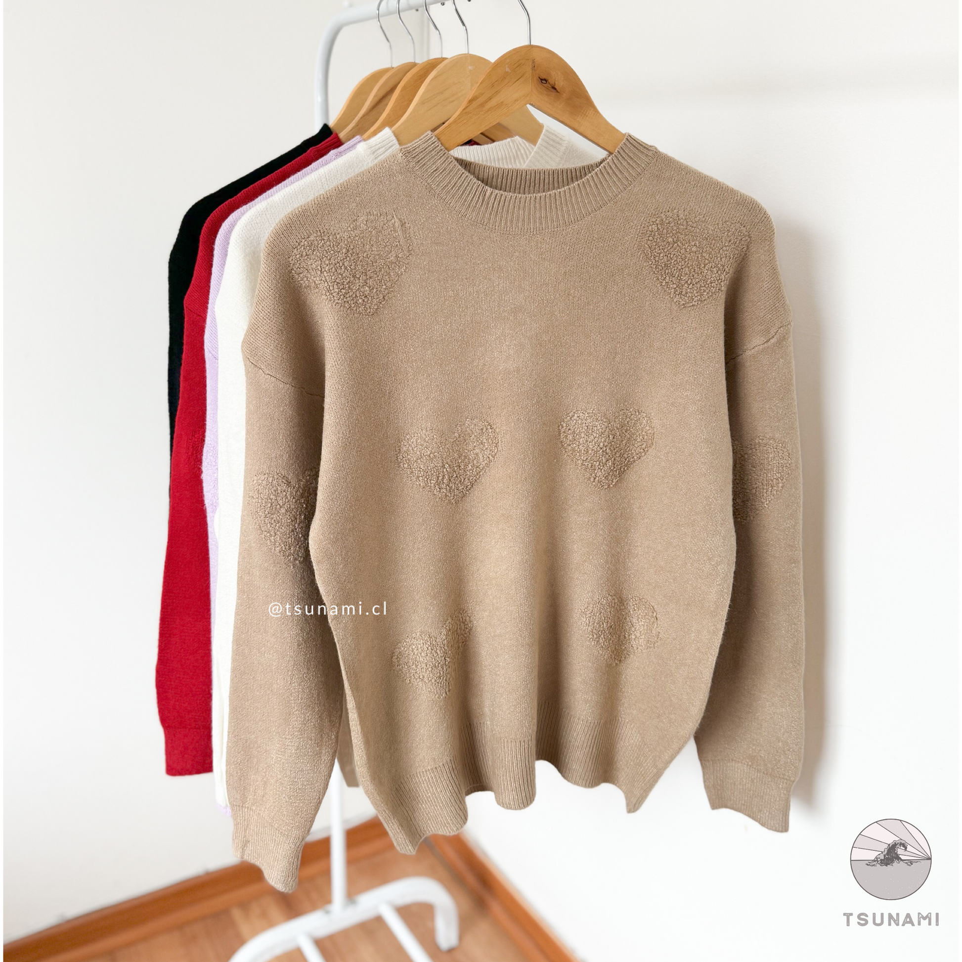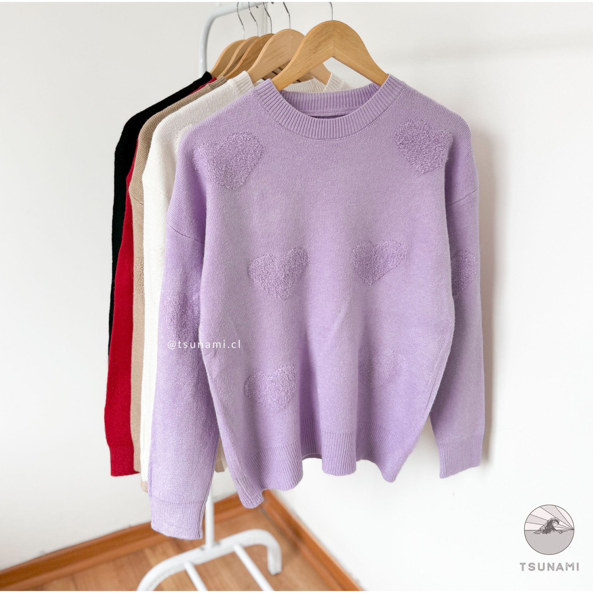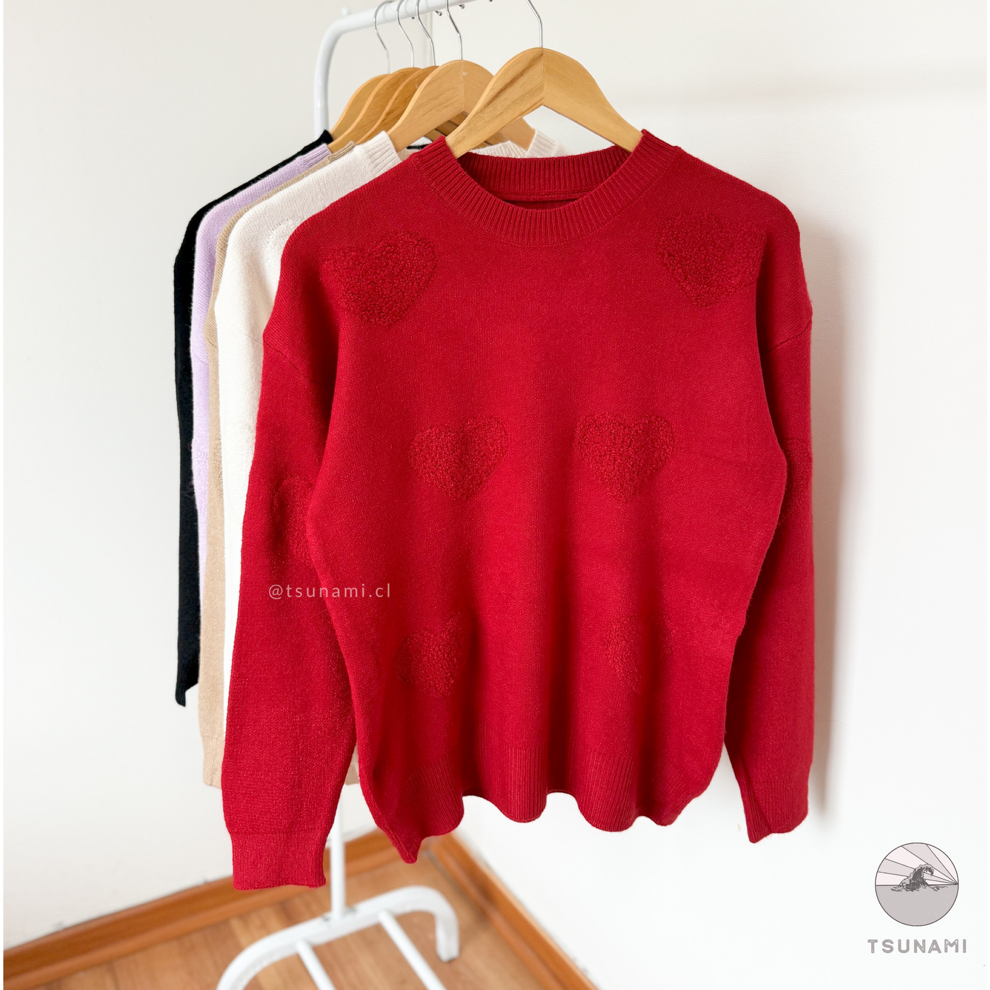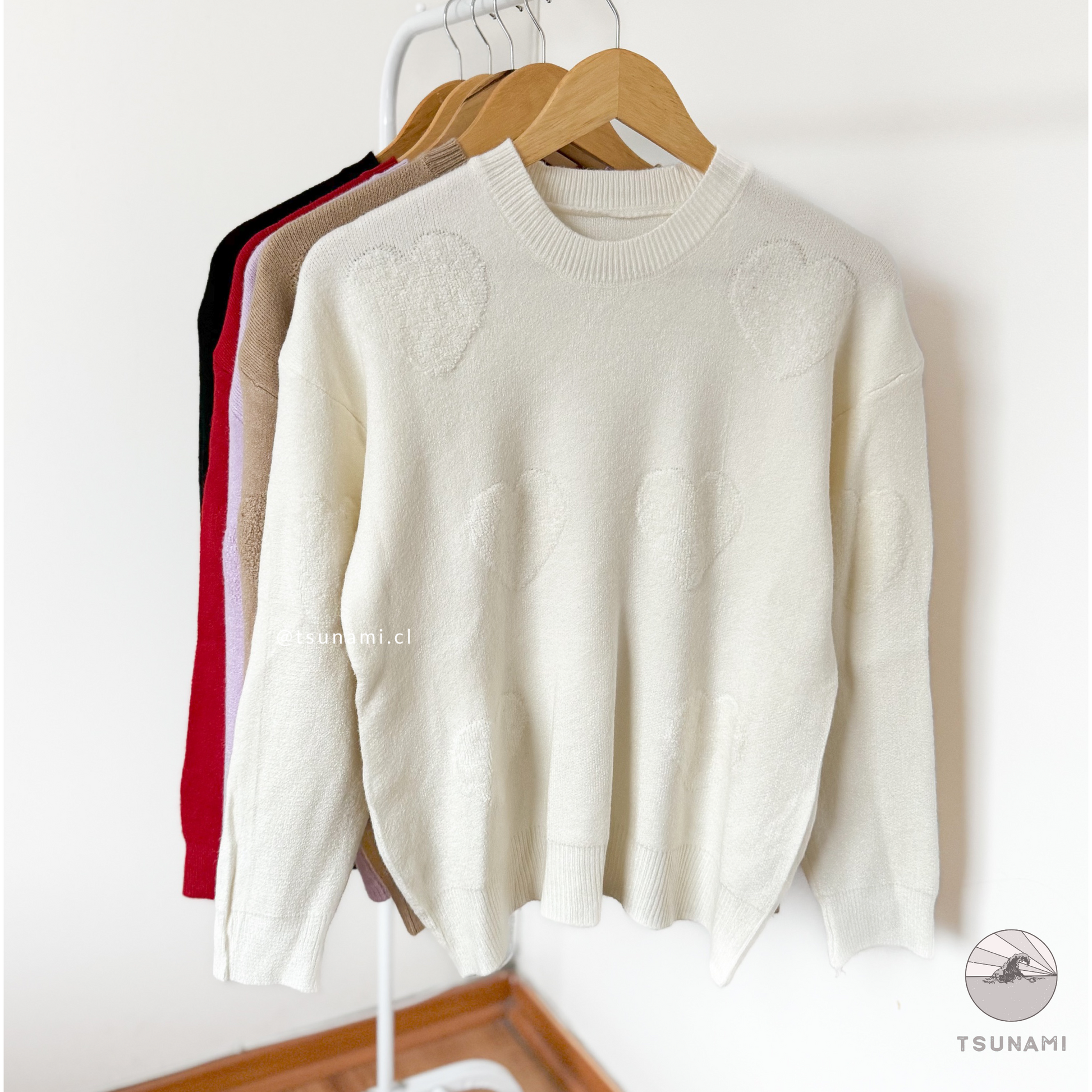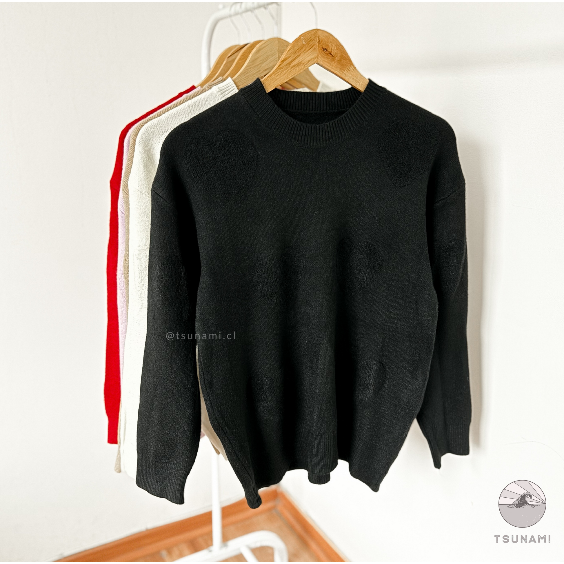 Un suéter un poco larguito, delgado y liviano, pero abrigador. El detalle sutil de algunos corazones lo hacen una prenda muy cute y diferente.