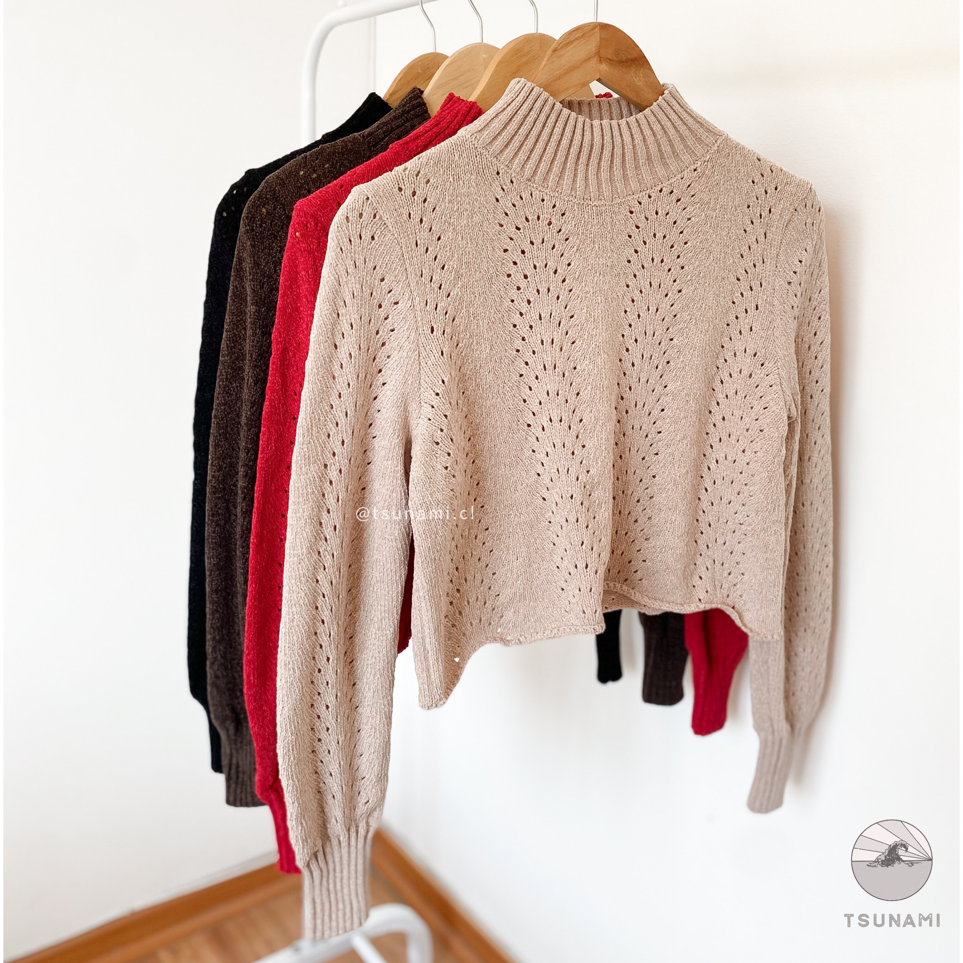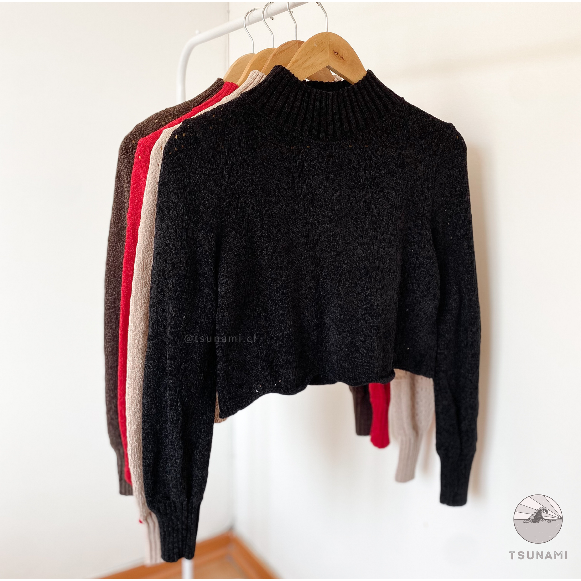 La principal característica de este suéter es la suavidad, ya que está hecho de chenille delgadito. Es corto, con puños ajustados y cuello redondo de altura media.
