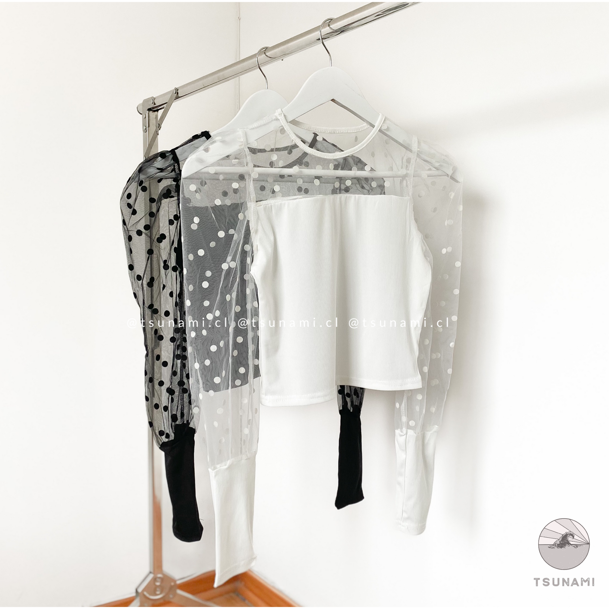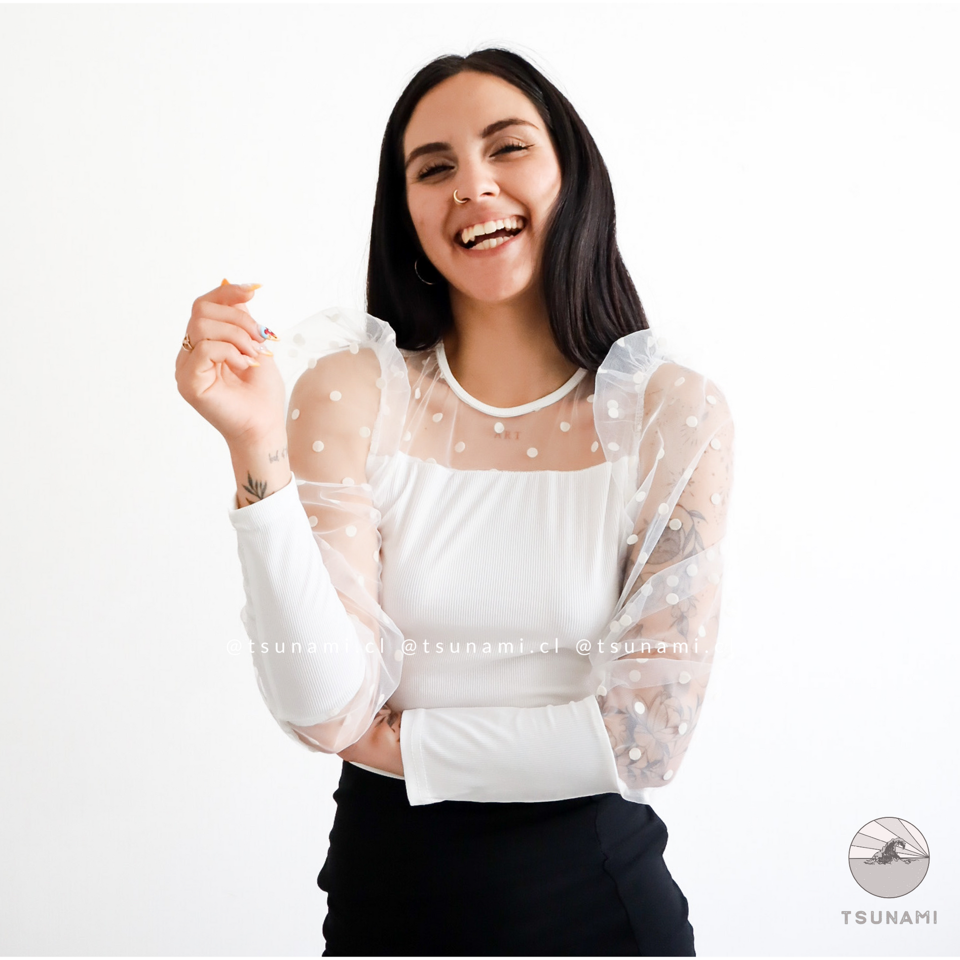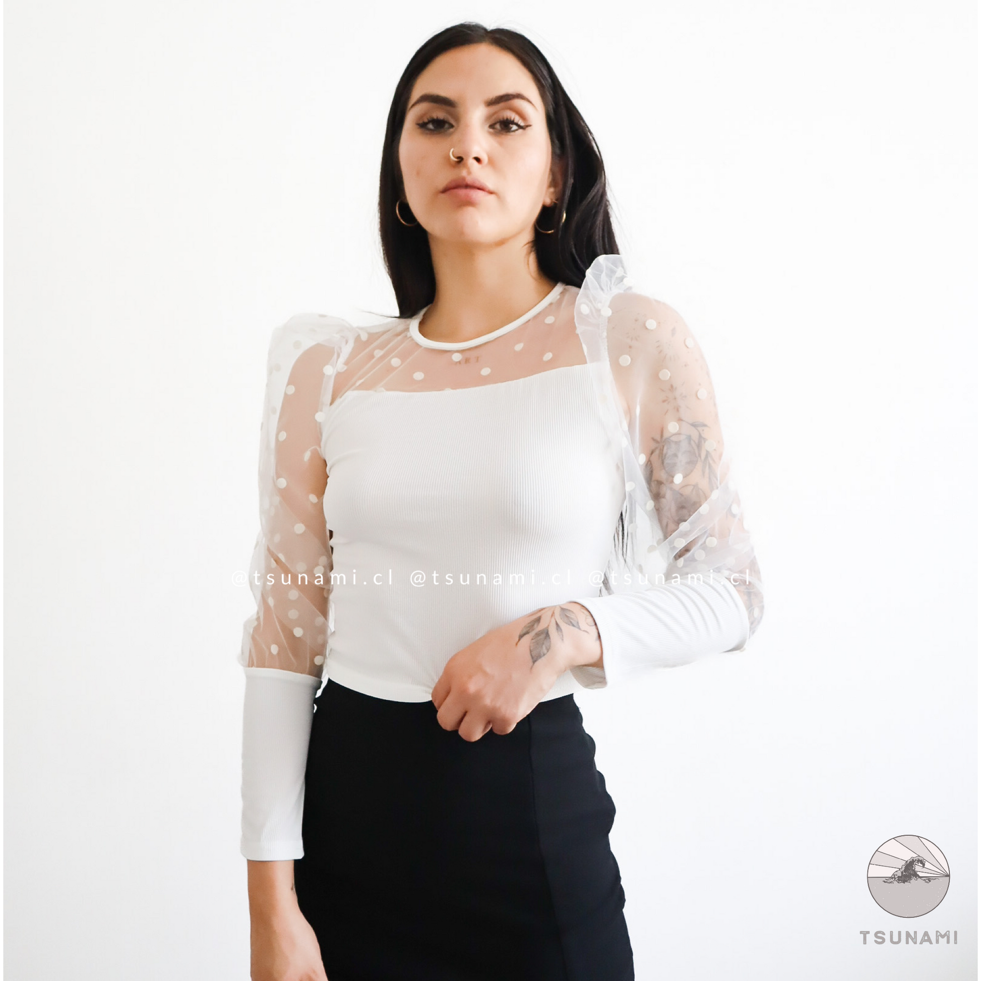Top ajustado con manga princesa traslúcida con lunares. Puedes usarlo en el día a día y también queda perfecto para eventos nocturnos ♥