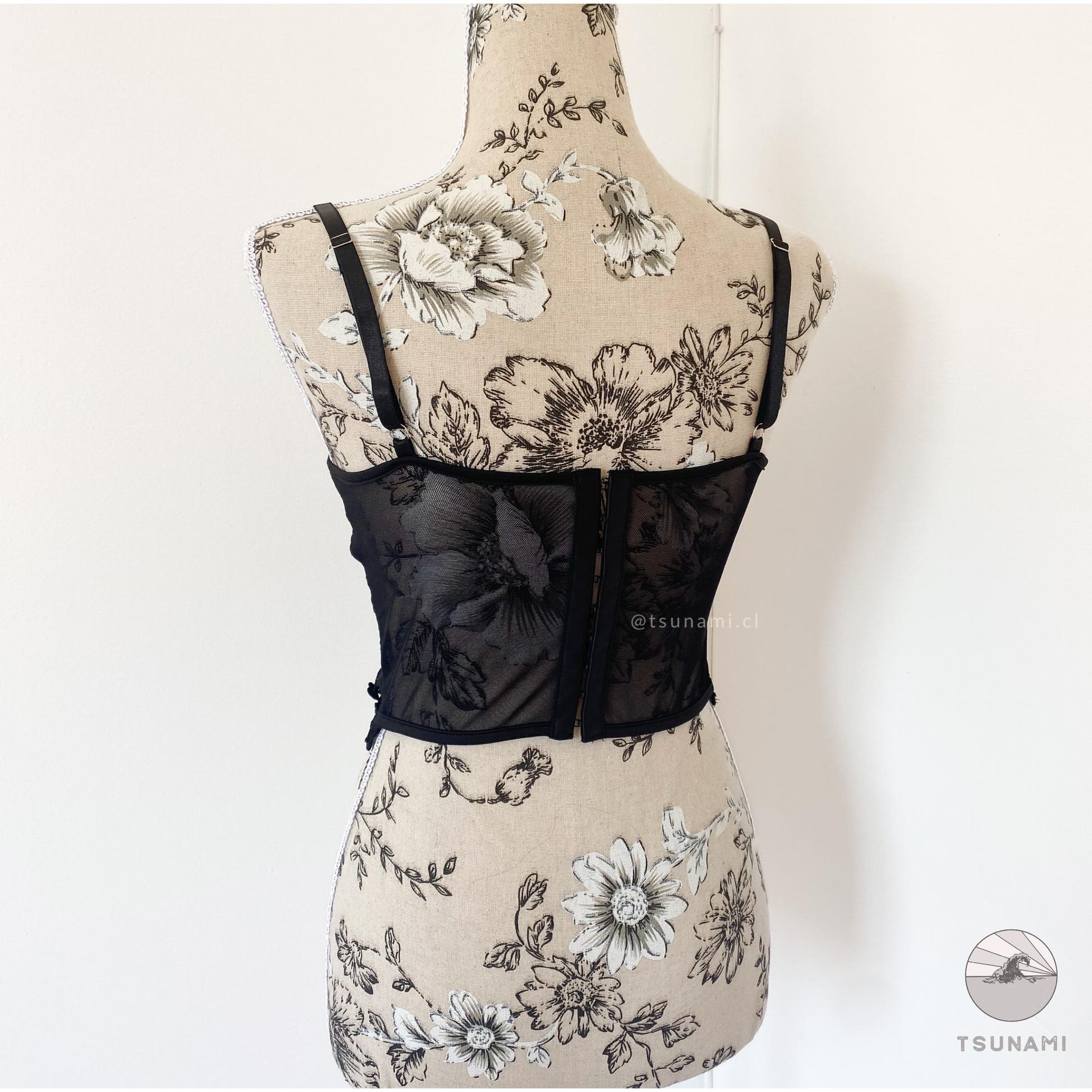 Top perfecto para usar de día o de noche que le aporta sensualidad a tus looks. Cómodo y fresco, de encaje floreado y malla, posee broches en la espalda para cerrar y se pueden ajustar los tirantes.
