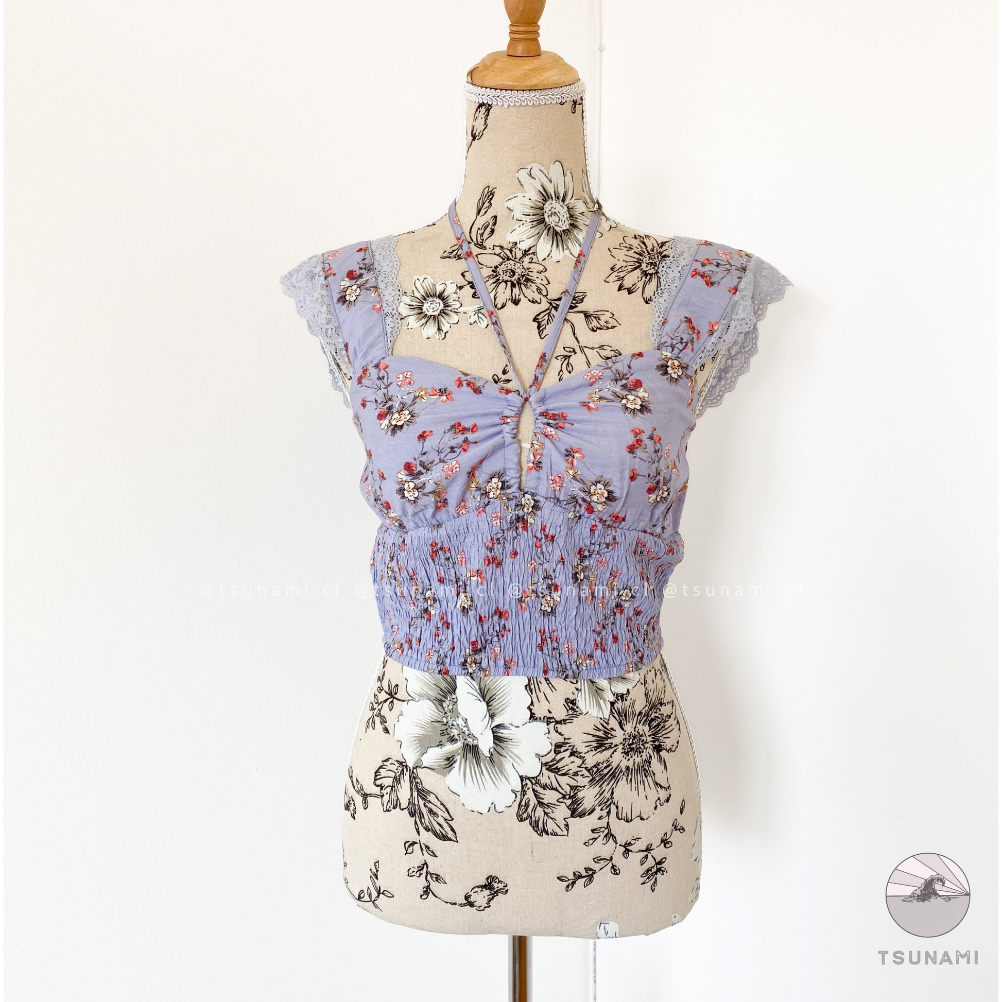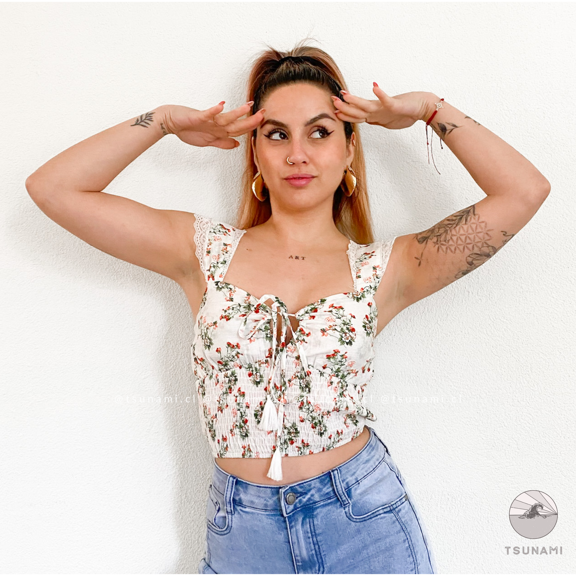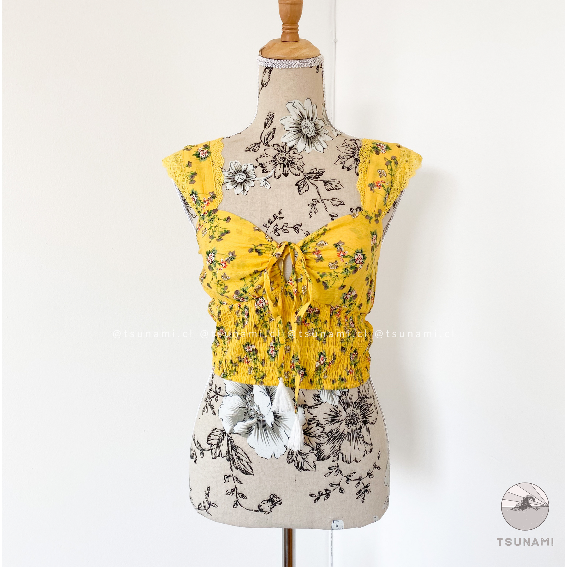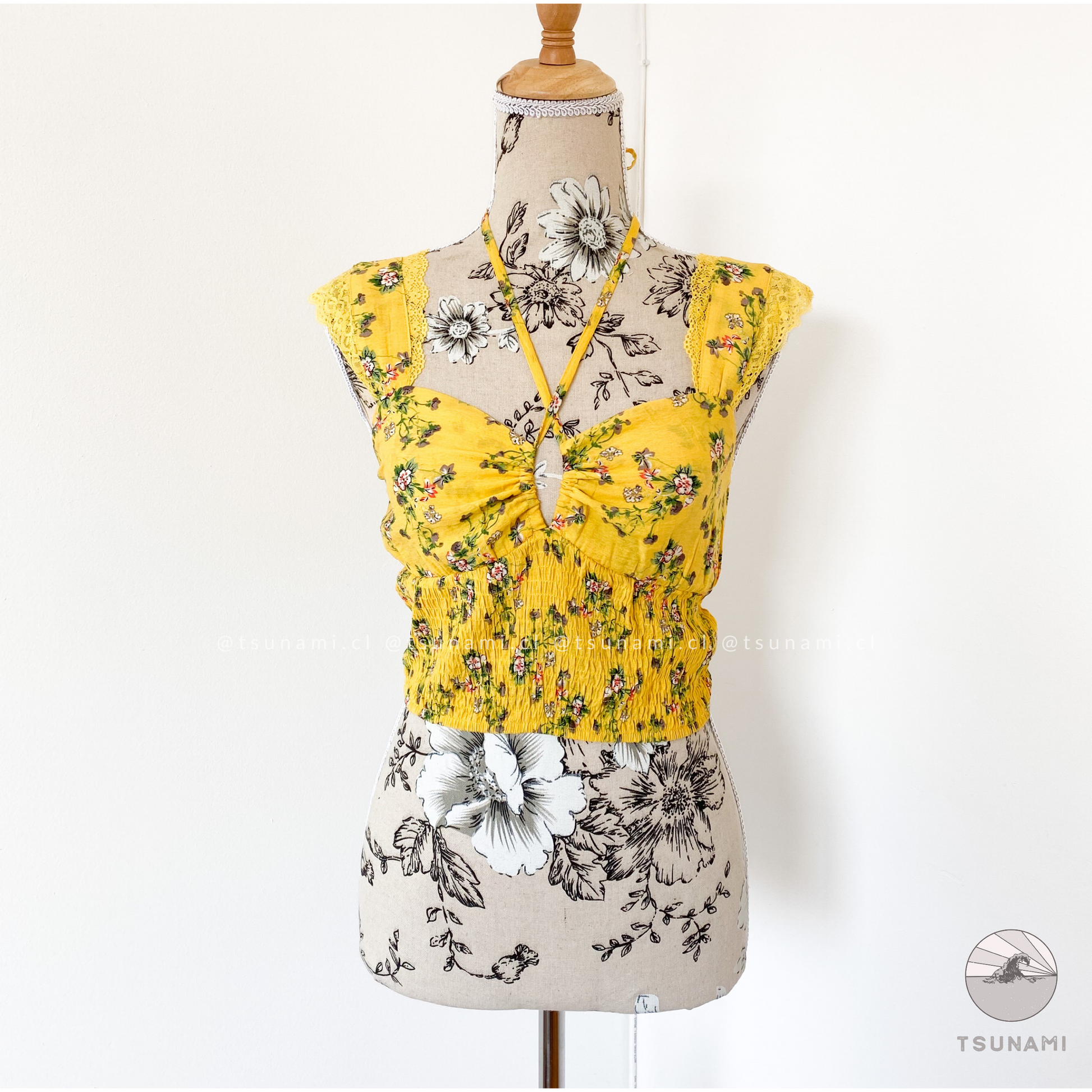 Top de viscosa, tela rígida, con cintura tipo acordeón que se adapta al cuerpo. Posee además un lazo en el escote que se puede usar de distintas formas. Tallas S/M y L/XL.