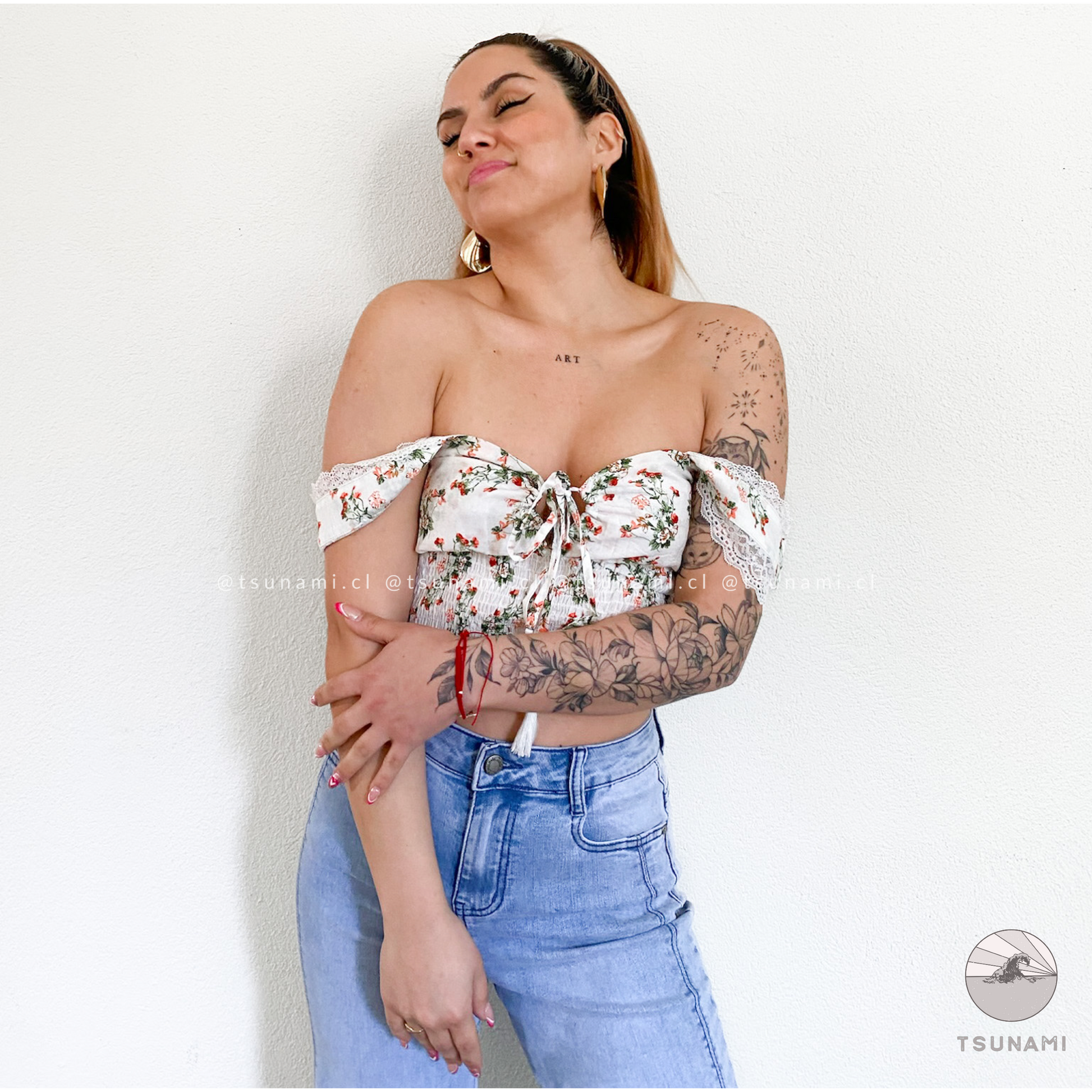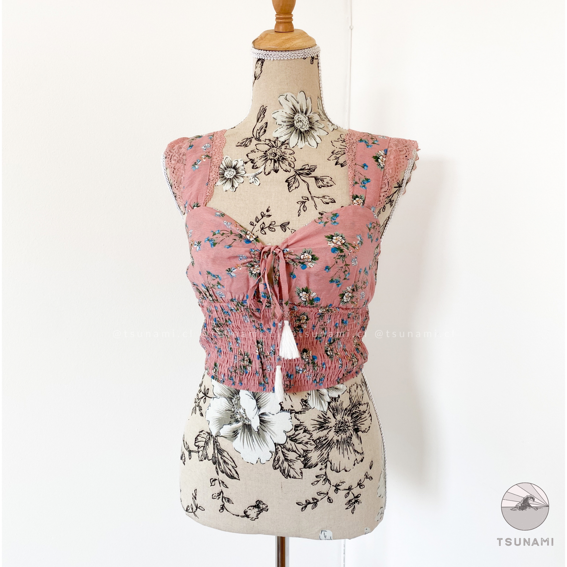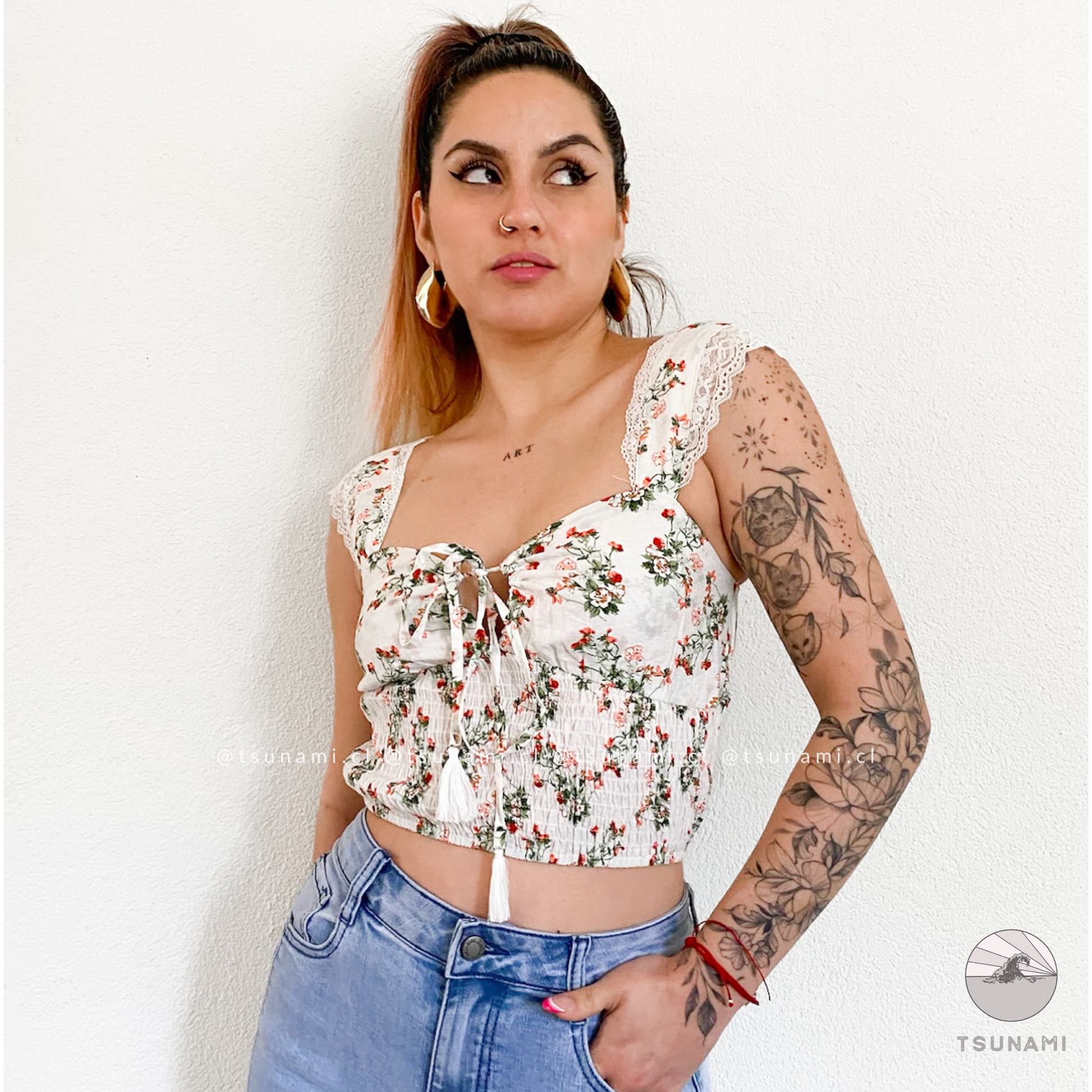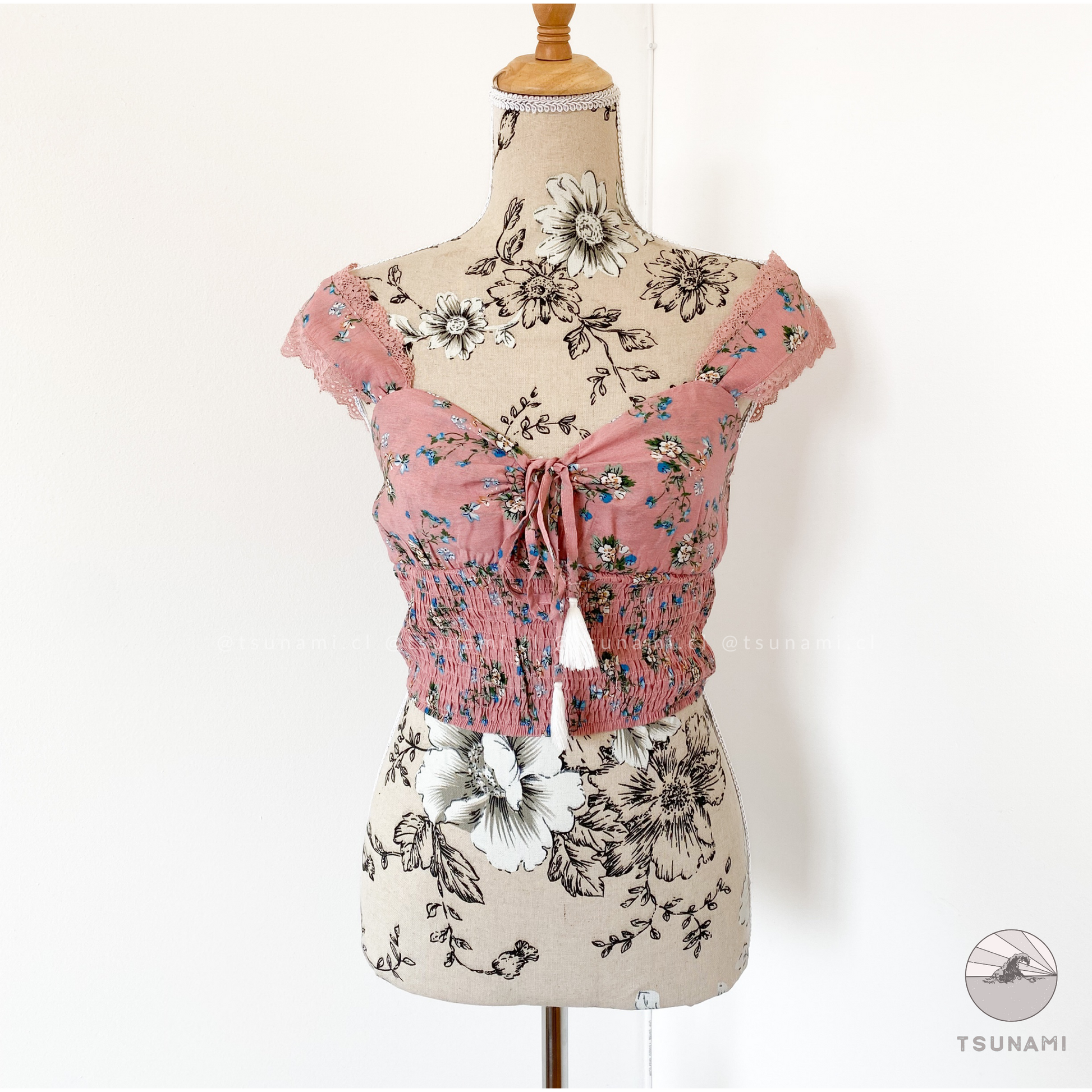 Top de viscosa, tela rígida, con cintura tipo acordeón que se adapta al cuerpo. Posee además un lazo en el escote que se puede usar de distintas formas. Tallas S/M y L/XL.