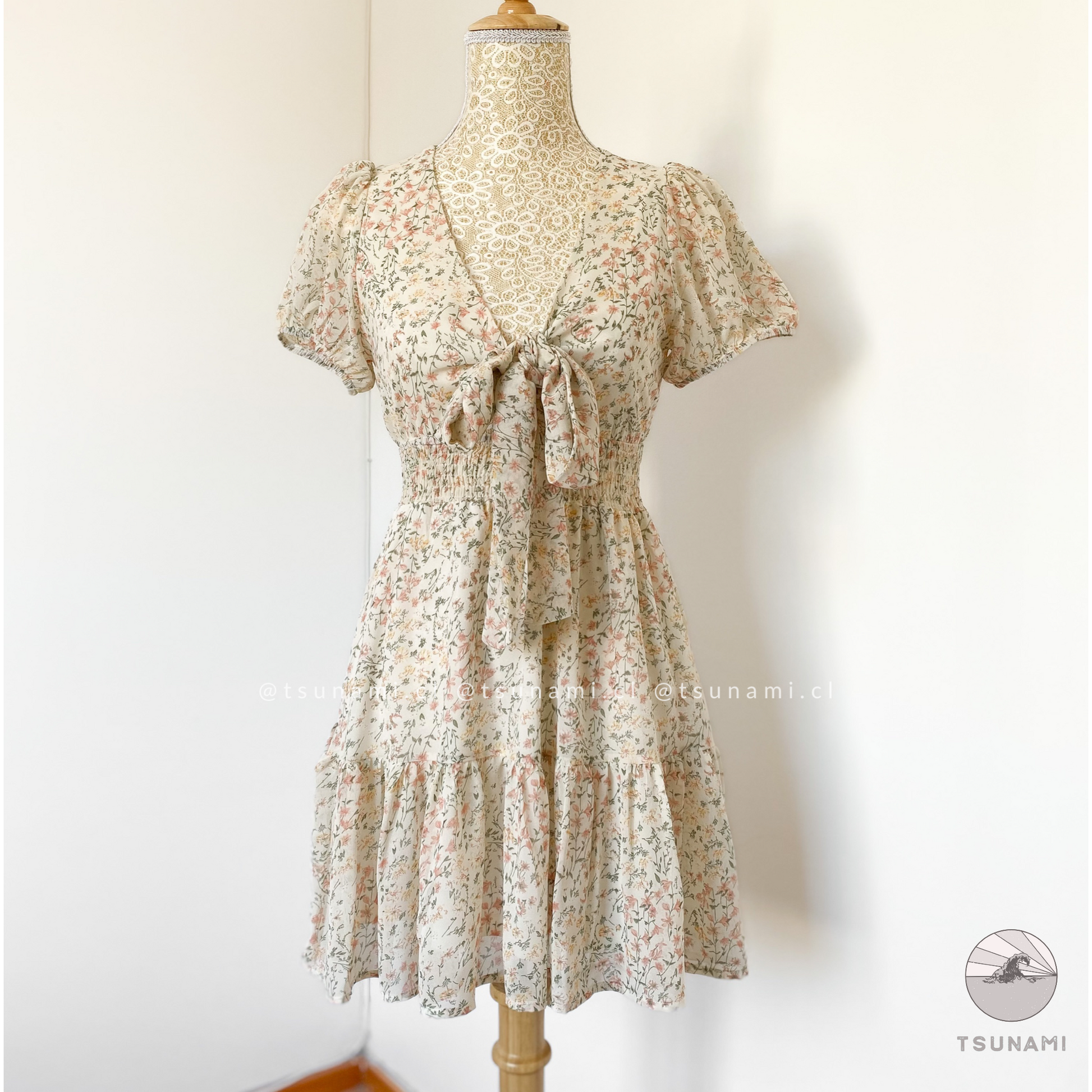 Vestido de tela rígida con forro interior, cintura elasticada y nudo ajustable en el busto.