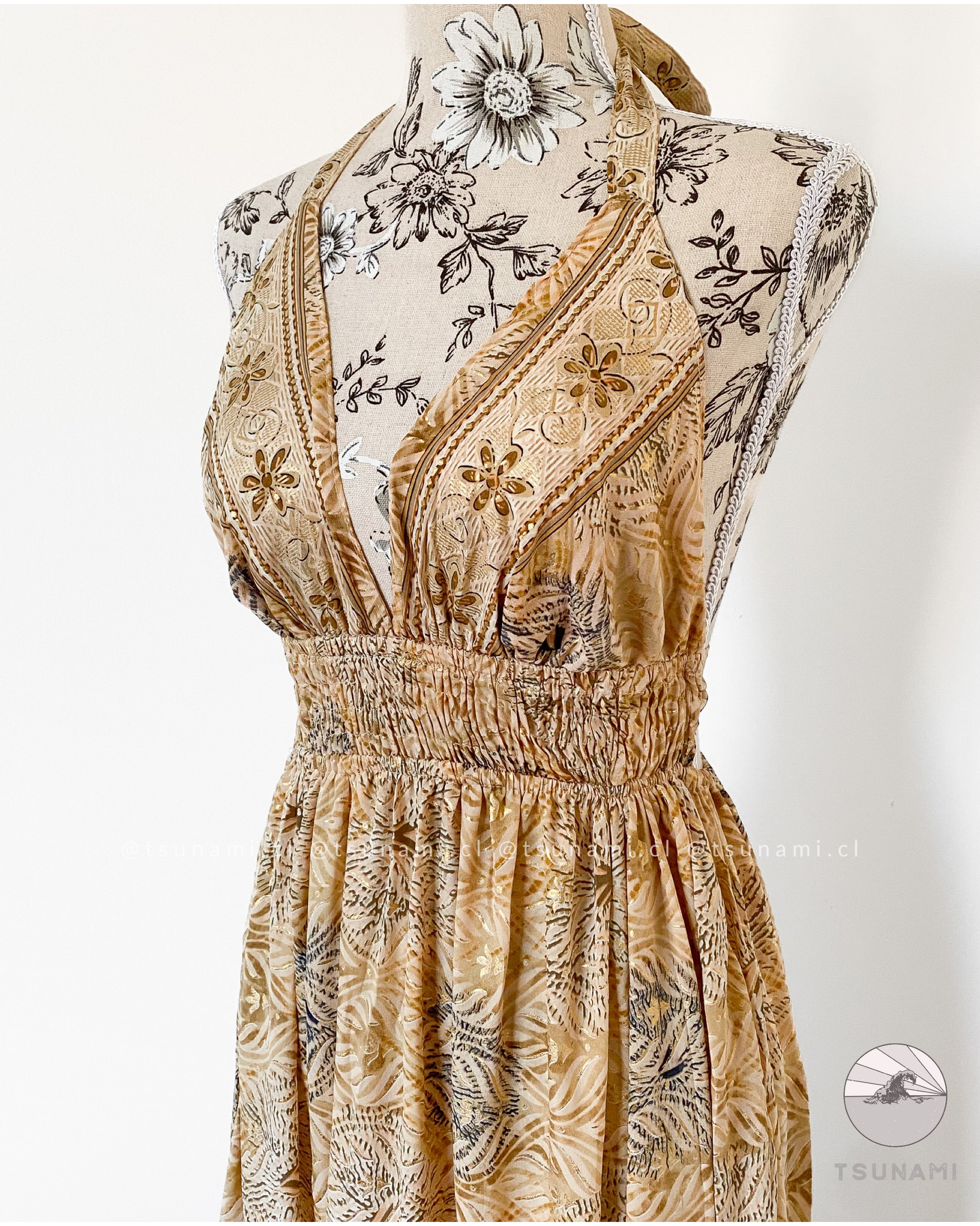 Vestido de seda artificial, muy suave, liviano y fresco, con una caída increíble. Posee escote en V y dos amarras en la espalda que puedes usar como quieras, además tiene elástico en la espalda por lo que se ajusta muy bien al cuerpo, hasta una talla L aproximadamente.