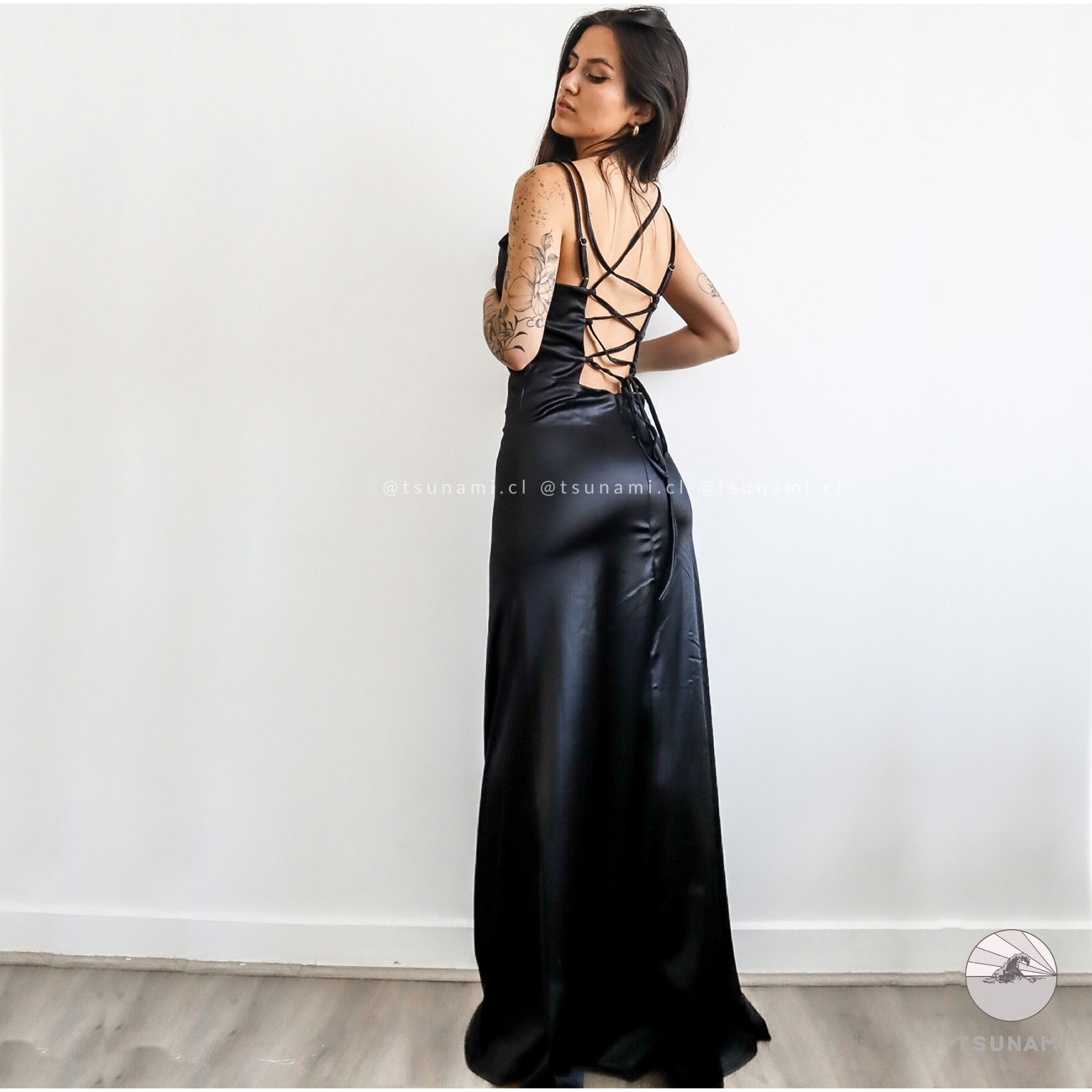 Vestido satinado con escote en V, breteles y espalda ajustable.