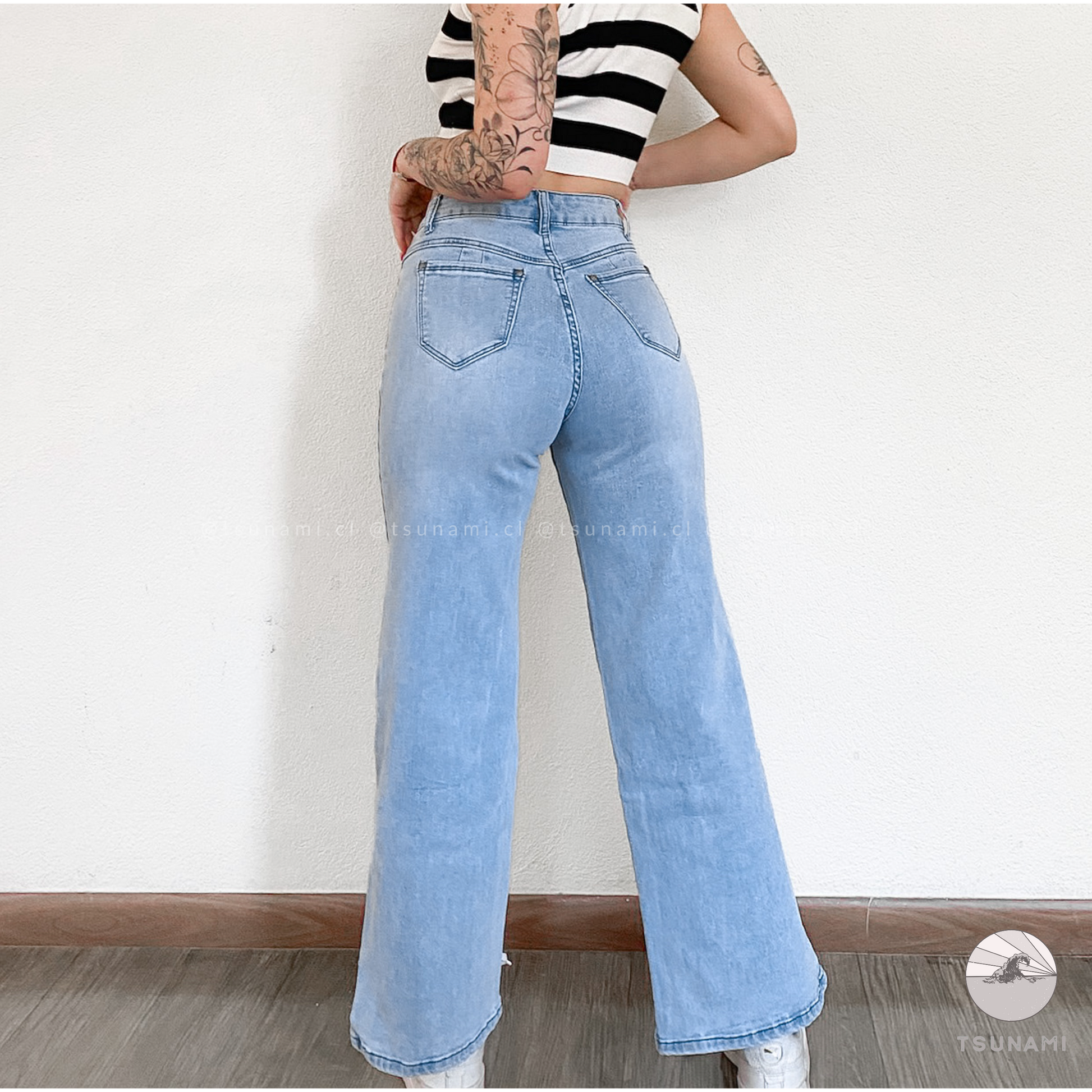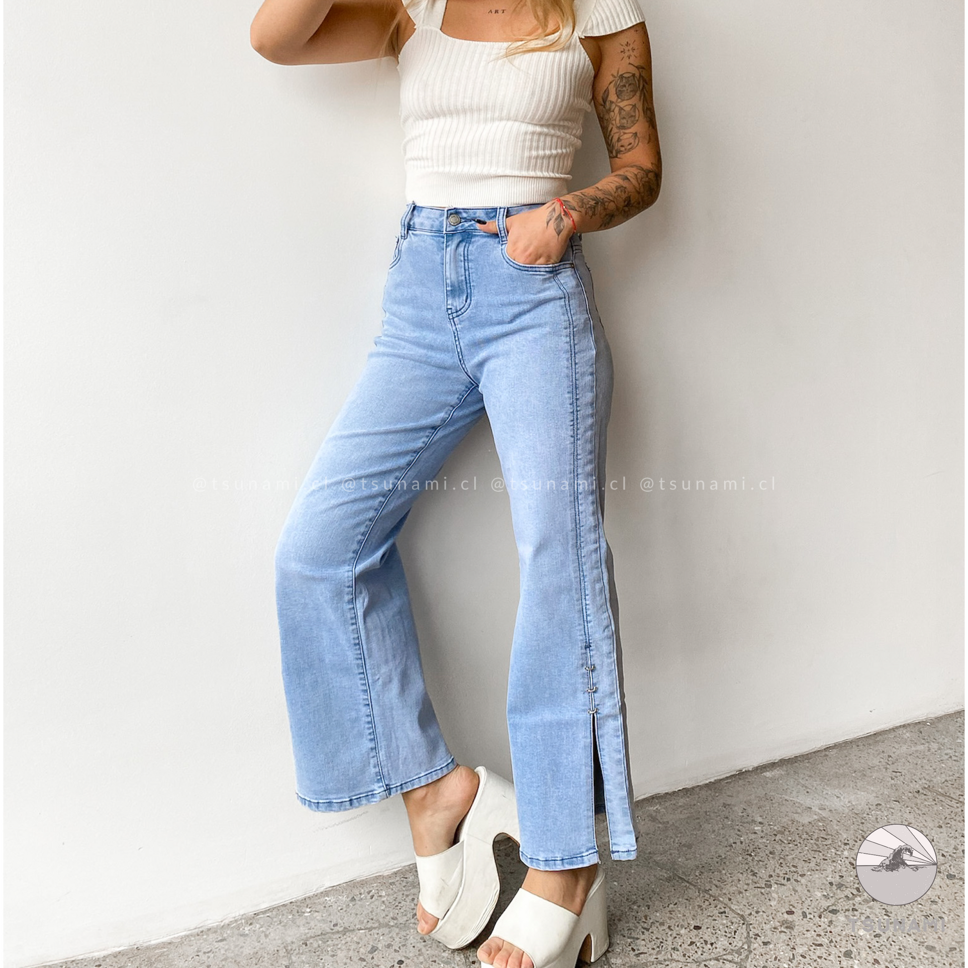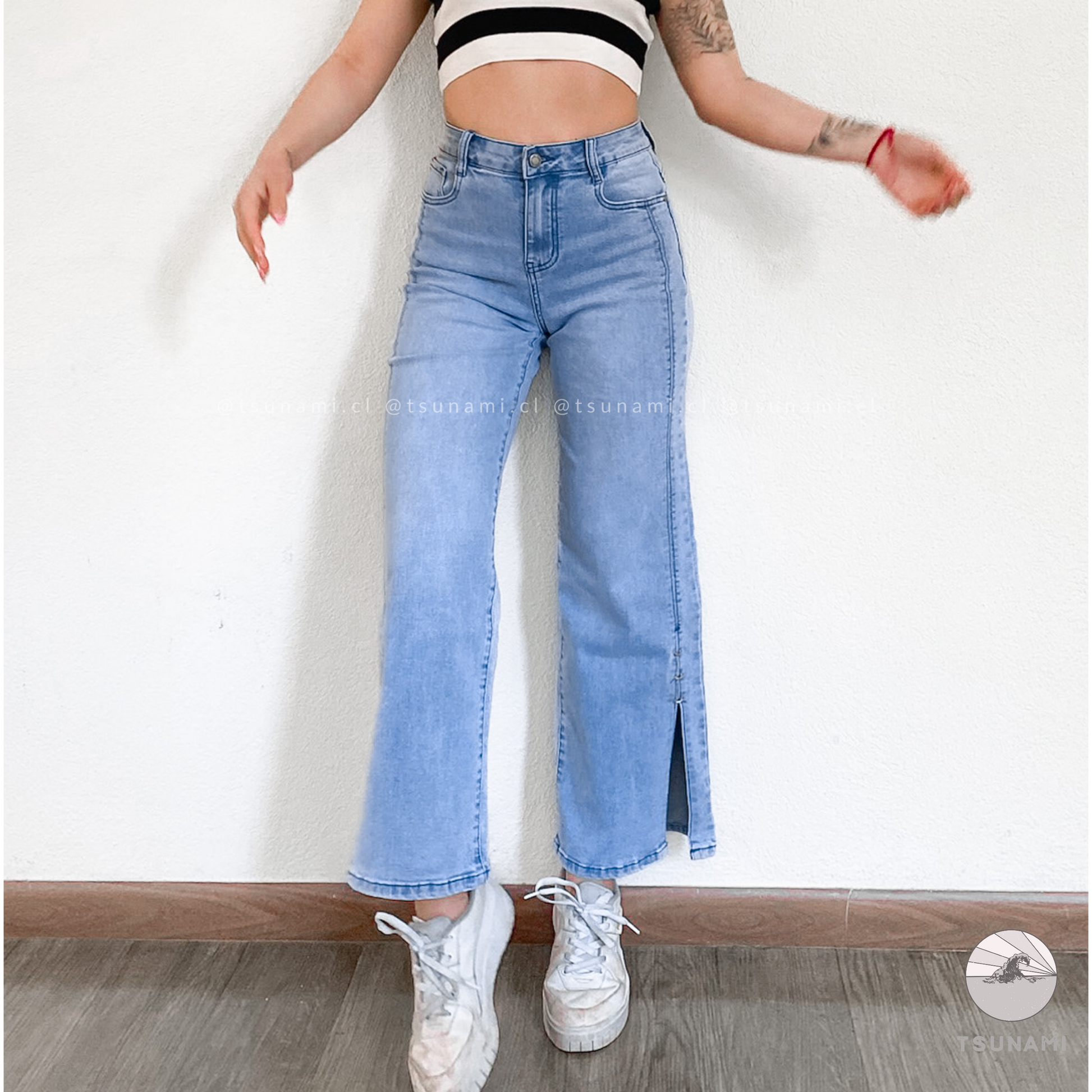 Pantalón ajustado en la parte superior y amplio hacia abajo, de mezclilla elasticada, con botón y cierre. Destaca el detalle de abertura en la pierna, además es push up y tiro alto, lo que ayudará a estilizar tu figura.