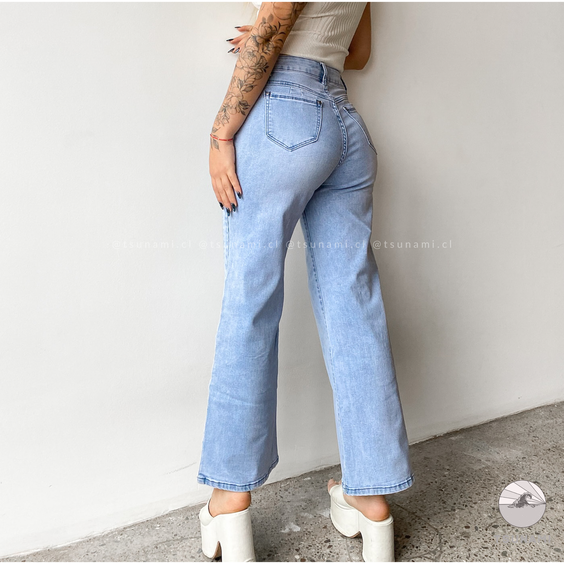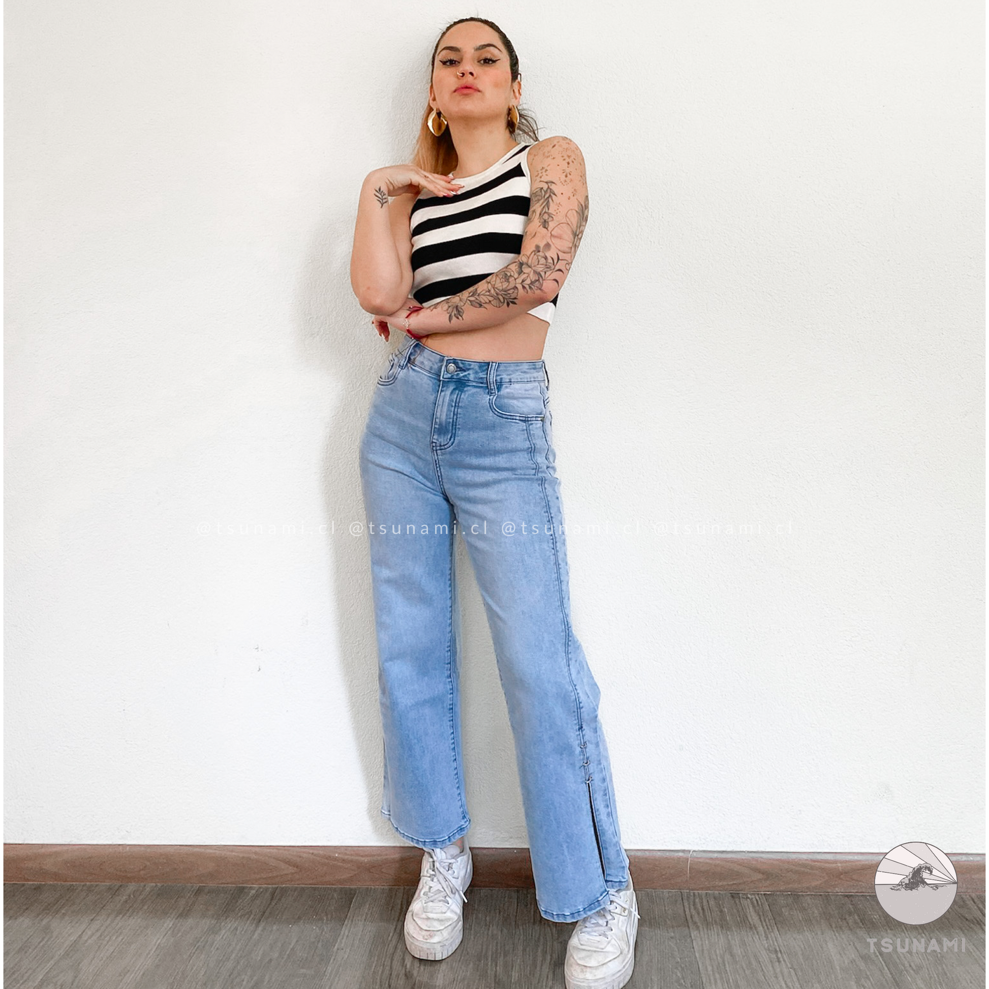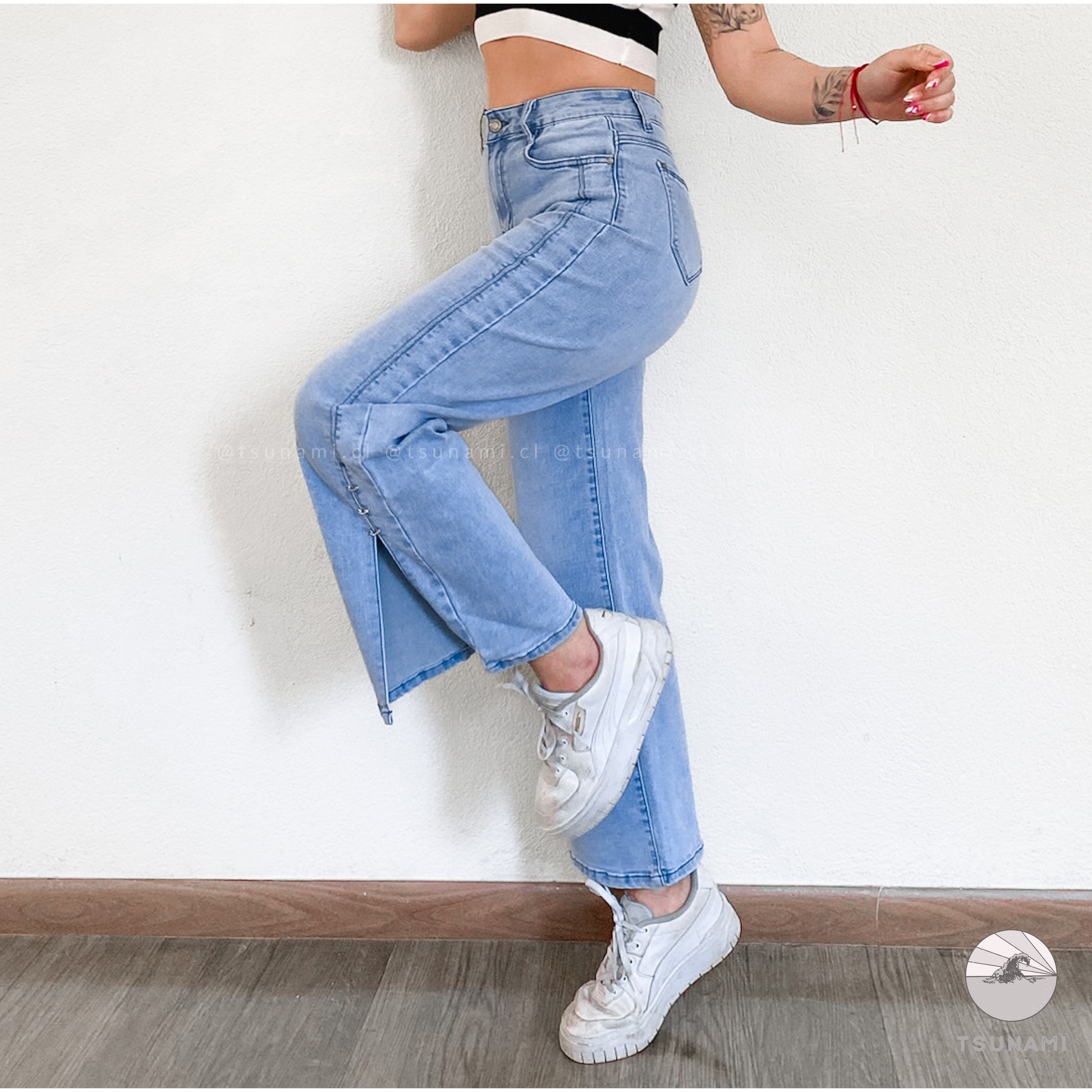 Pantalón ajustado en la parte superior y amplio hacia abajo, de mezclilla elasticada, con botón y cierre. Destaca el detalle de abertura en la pierna, además es push up y tiro alto, lo que ayudará a estilizar tu figura.